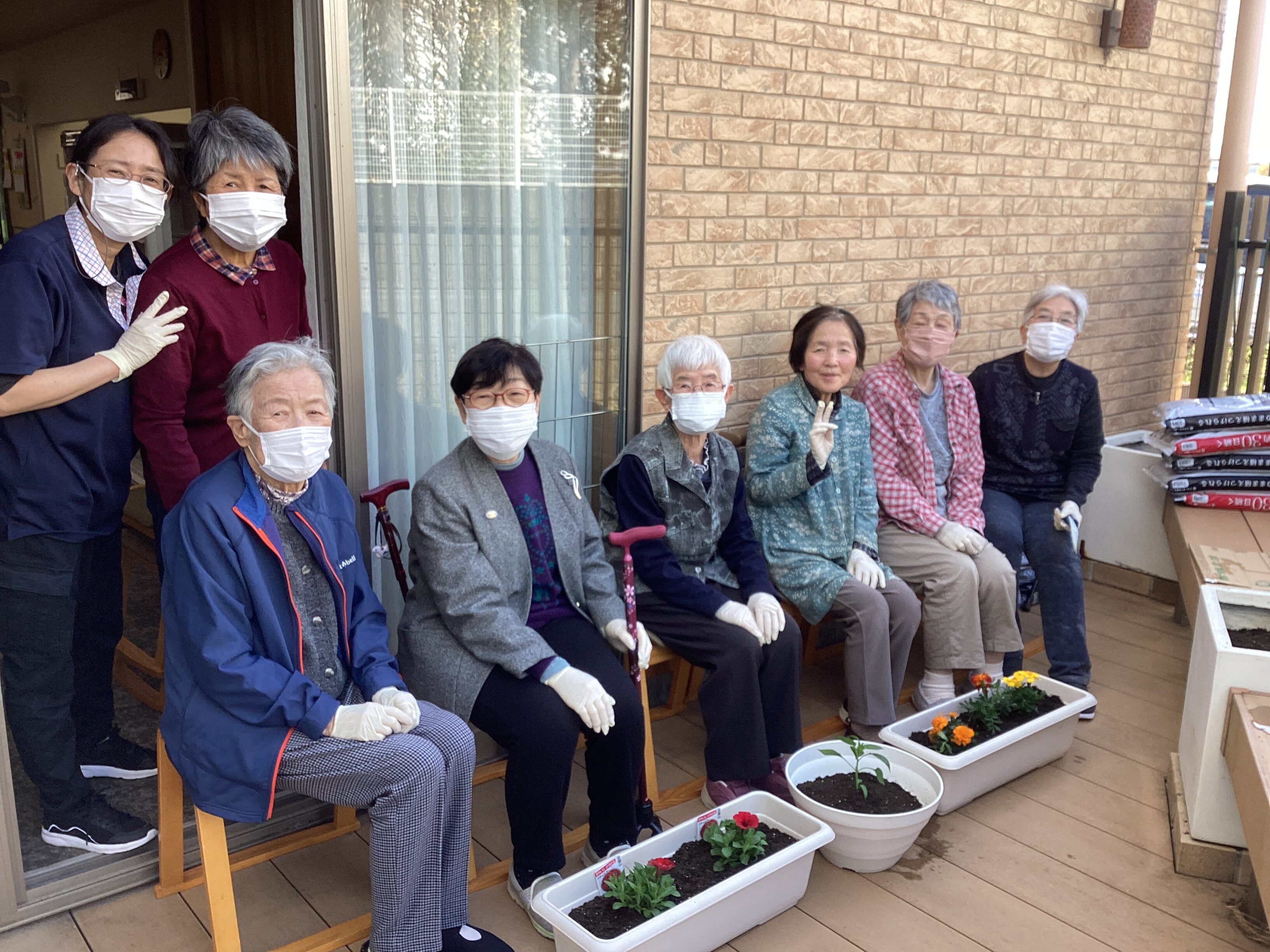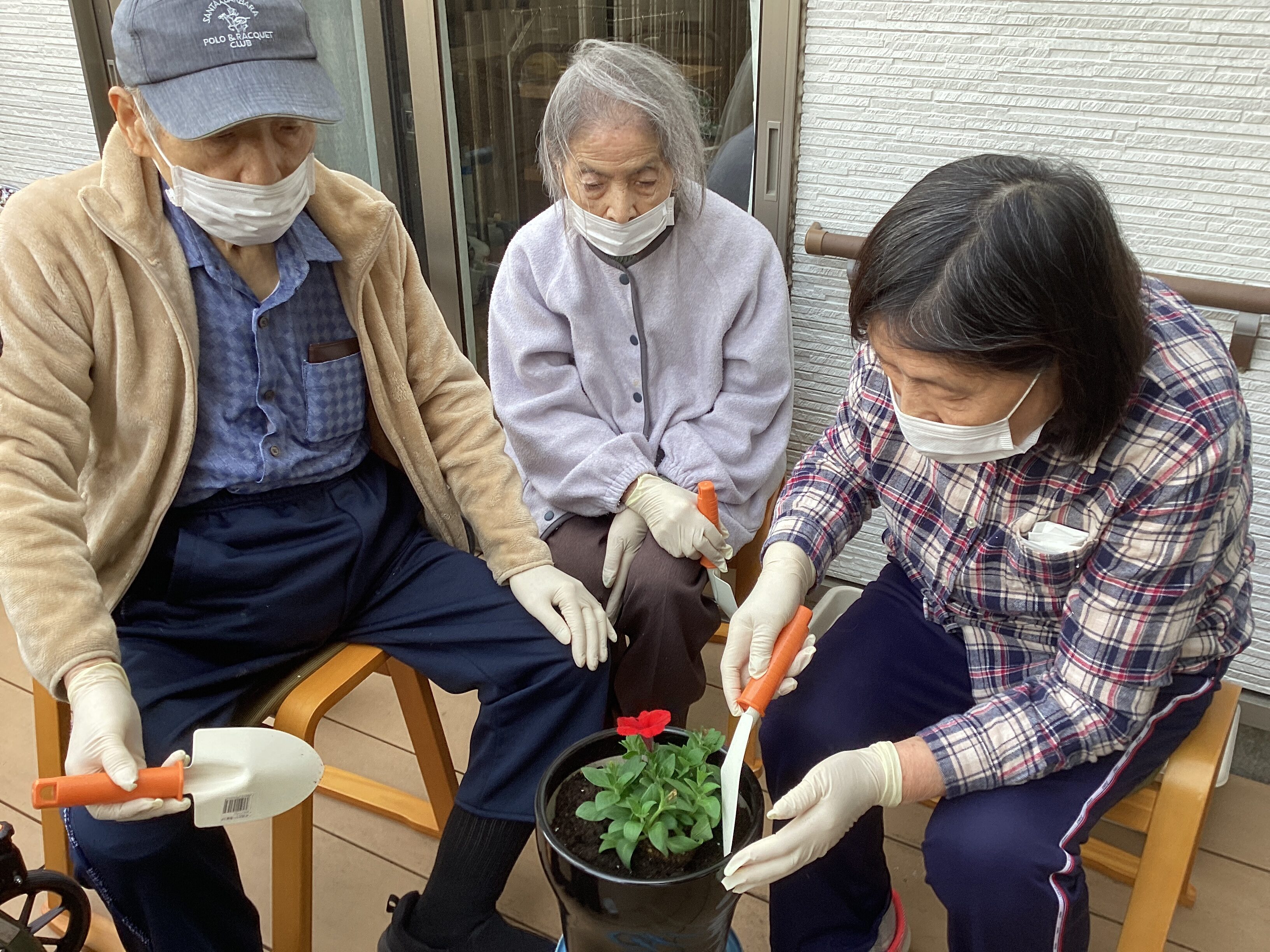 ミモザではいつも折り紙や紙器など様々な素材を使って、工夫をこらしたレクリエーションをご提供。この日はそこからちょっと出て、本物に触れてみましょう😄✨ 肥沃な肥料と共にプランターに植えるのは、色とりどりのお花たち🌈 生きたお花で生き生きと😊