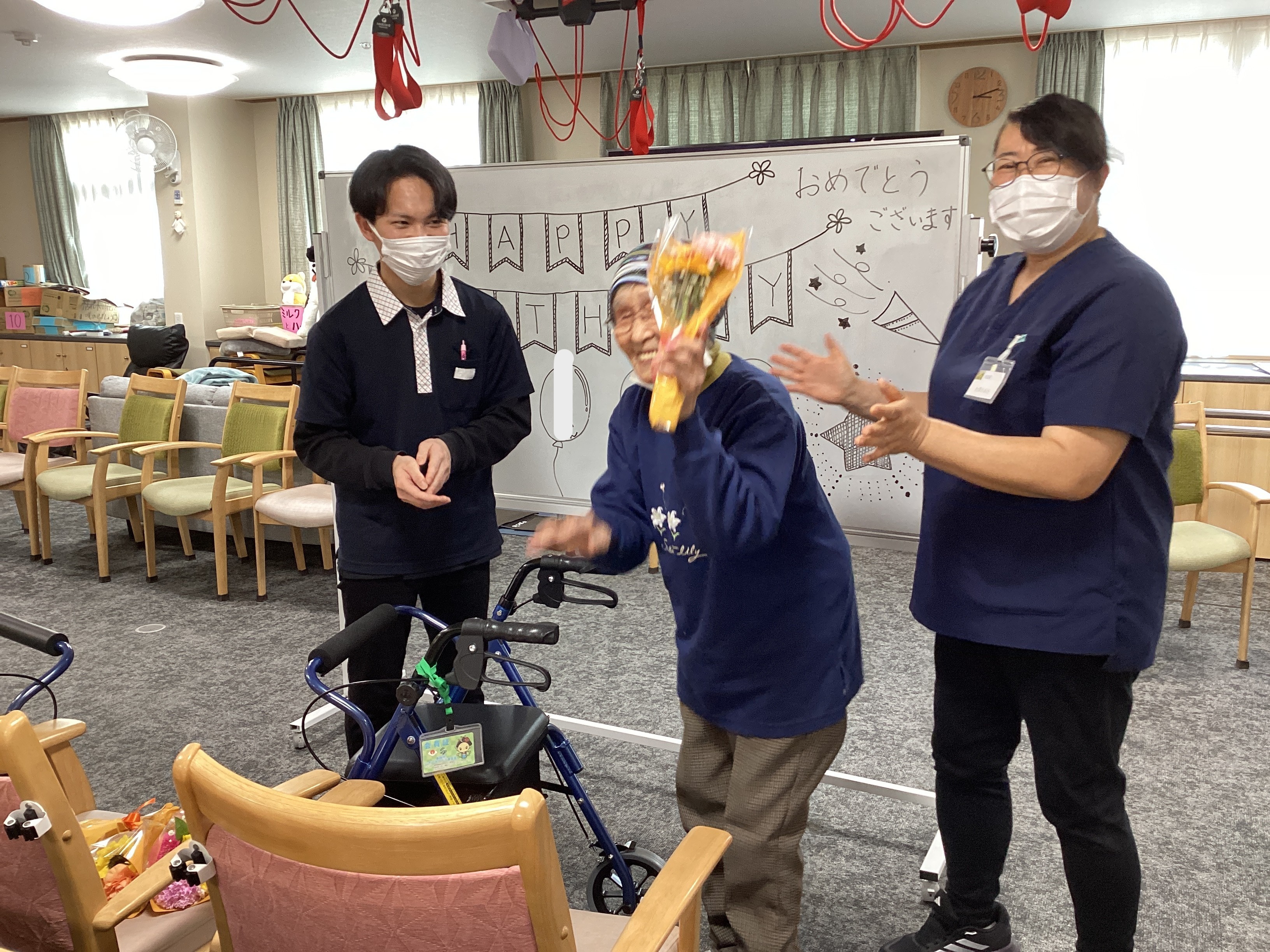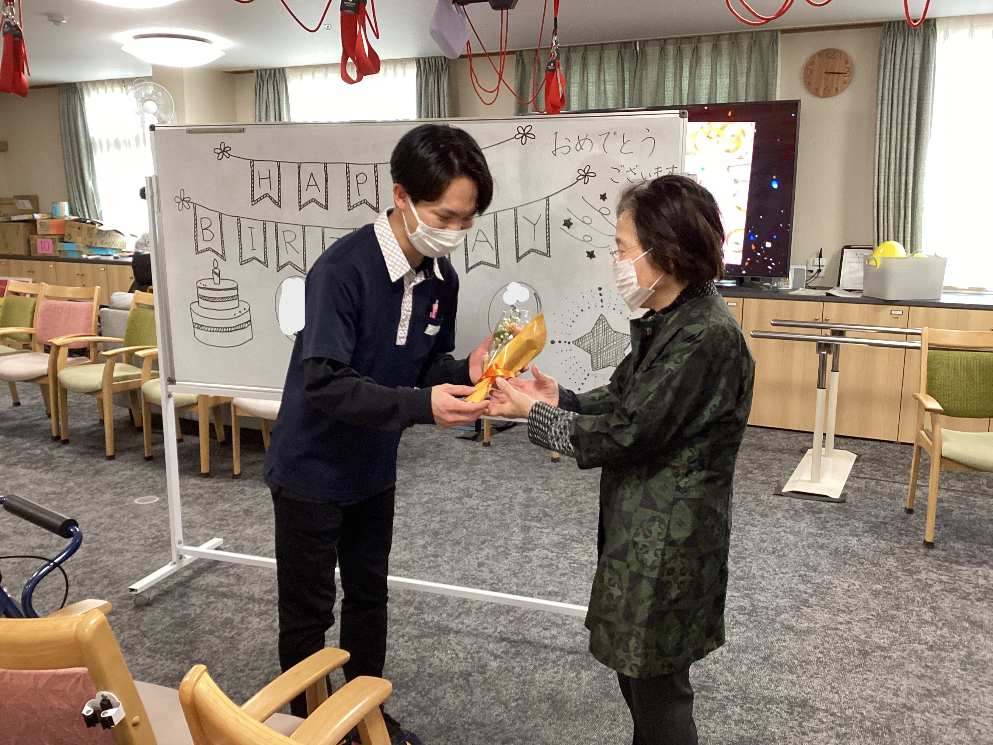 お誕生会👏今までなかった取り組みの一つ、この日は今月お誕生日の方を皆さんでお祝いさせていただきました!✨ お名前を呼ばれたら前に出て、拍手の中 ささやかですが、お花を所長よりプレゼント💐 職員もですが、大人になるとこういう機会も新鮮ですね😊