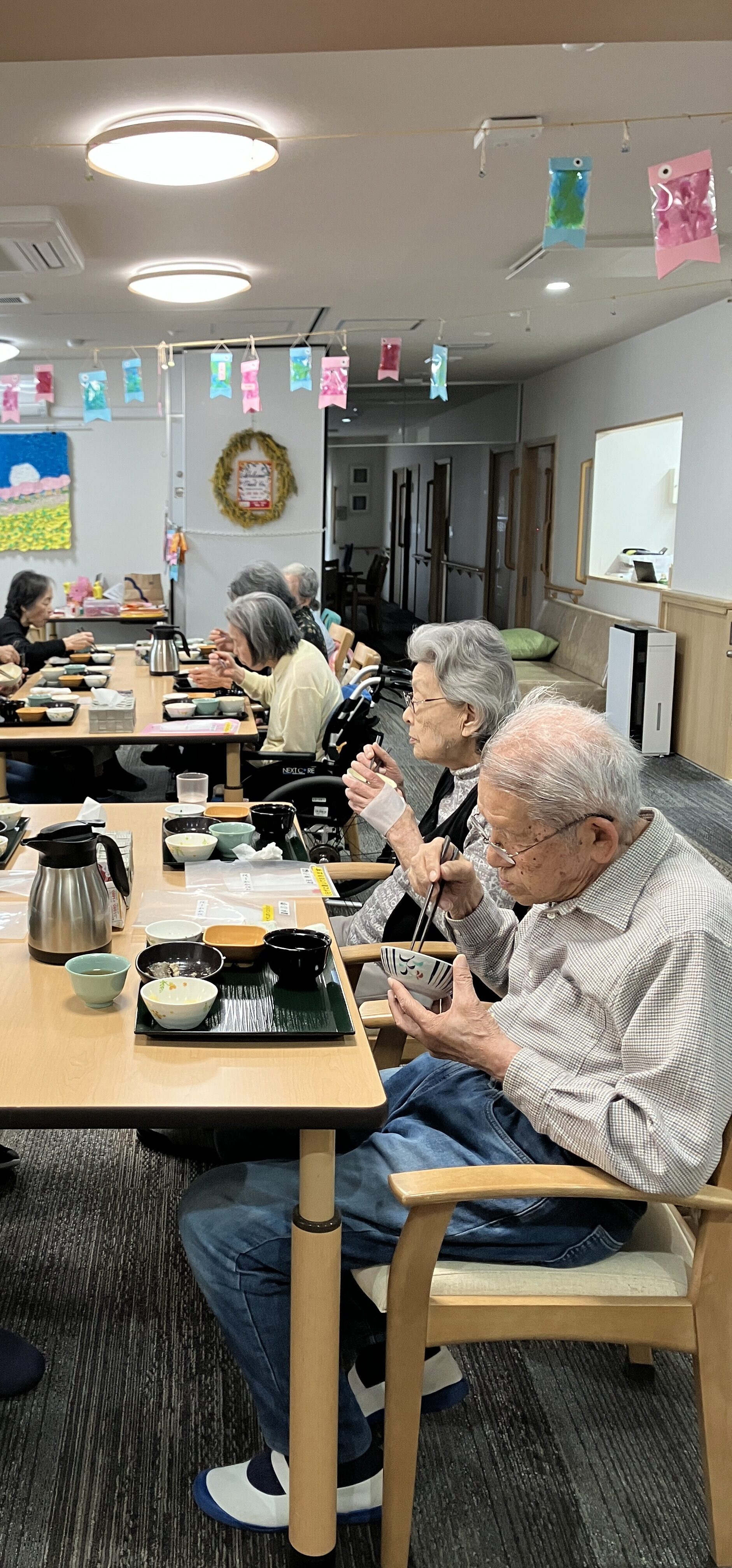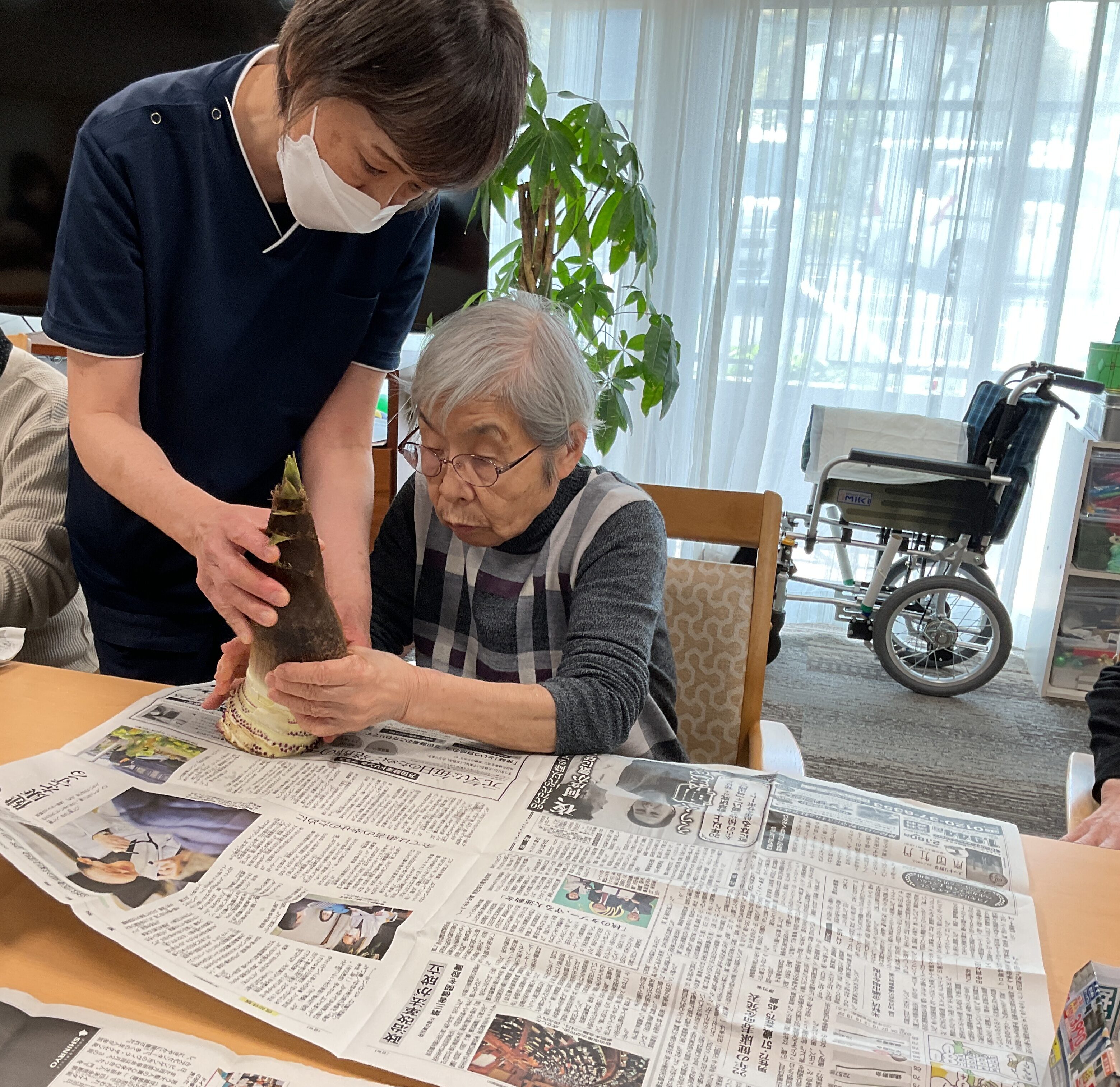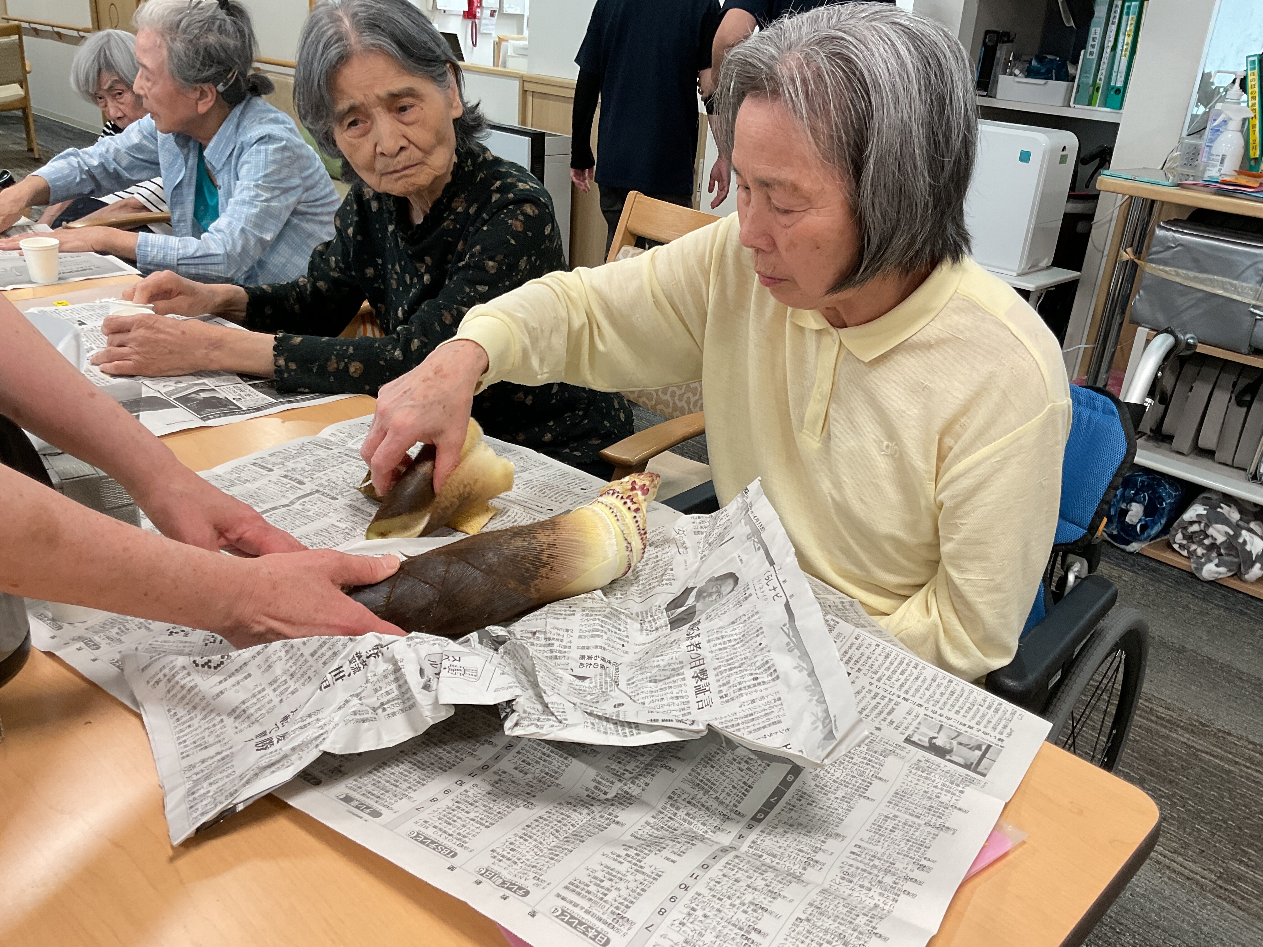 ミモザのオーナー様から大きな掘りたての筍を頂きました。新鮮なうちに皆様で皮むきをし、ぬかで茹でました。この筍を「何にして食べようかな?」と皆様と一緒に考えて、たけのこご飯を作りました。旬の筍はとても柔らかく美味しく出来上がりました。