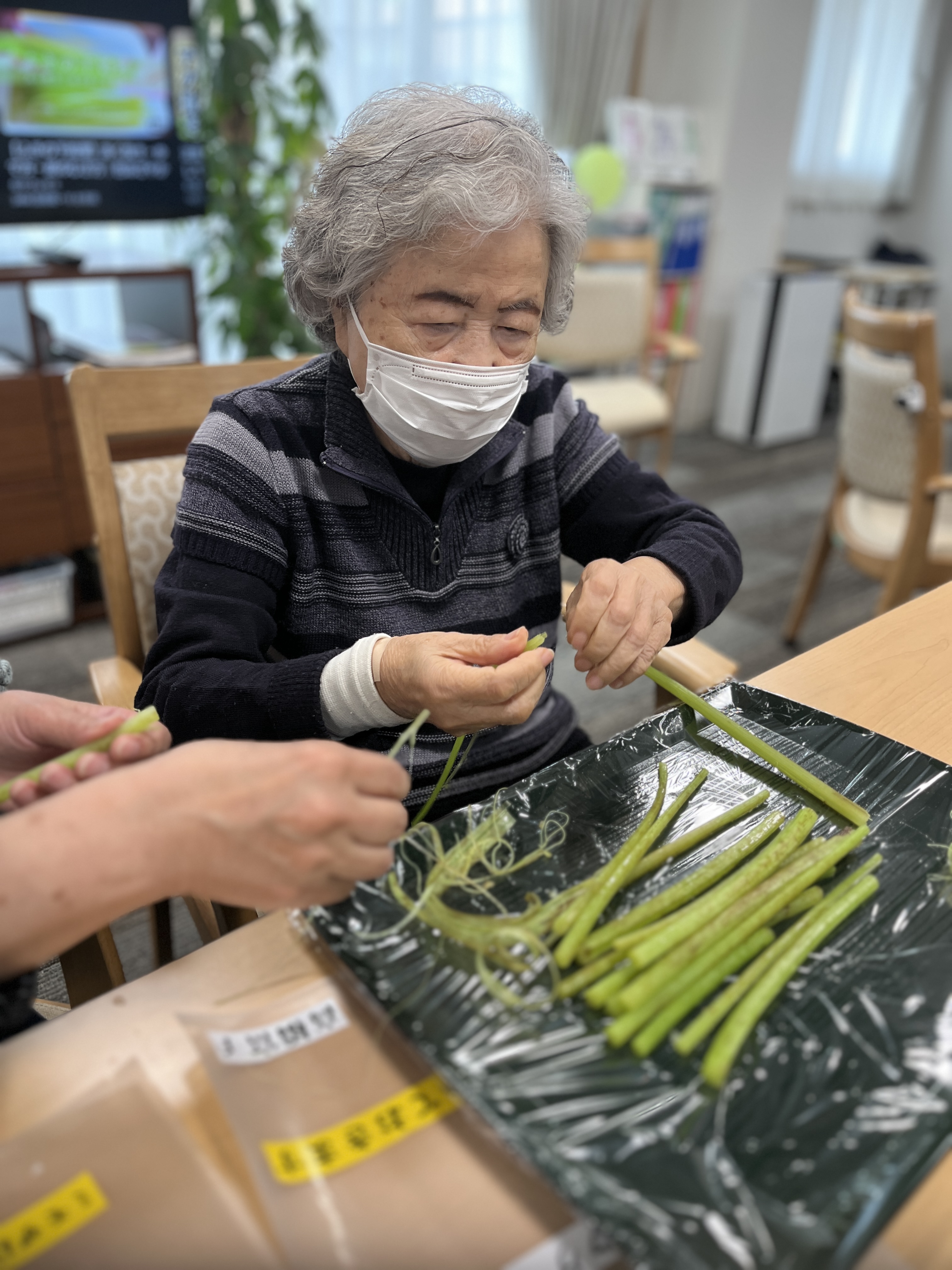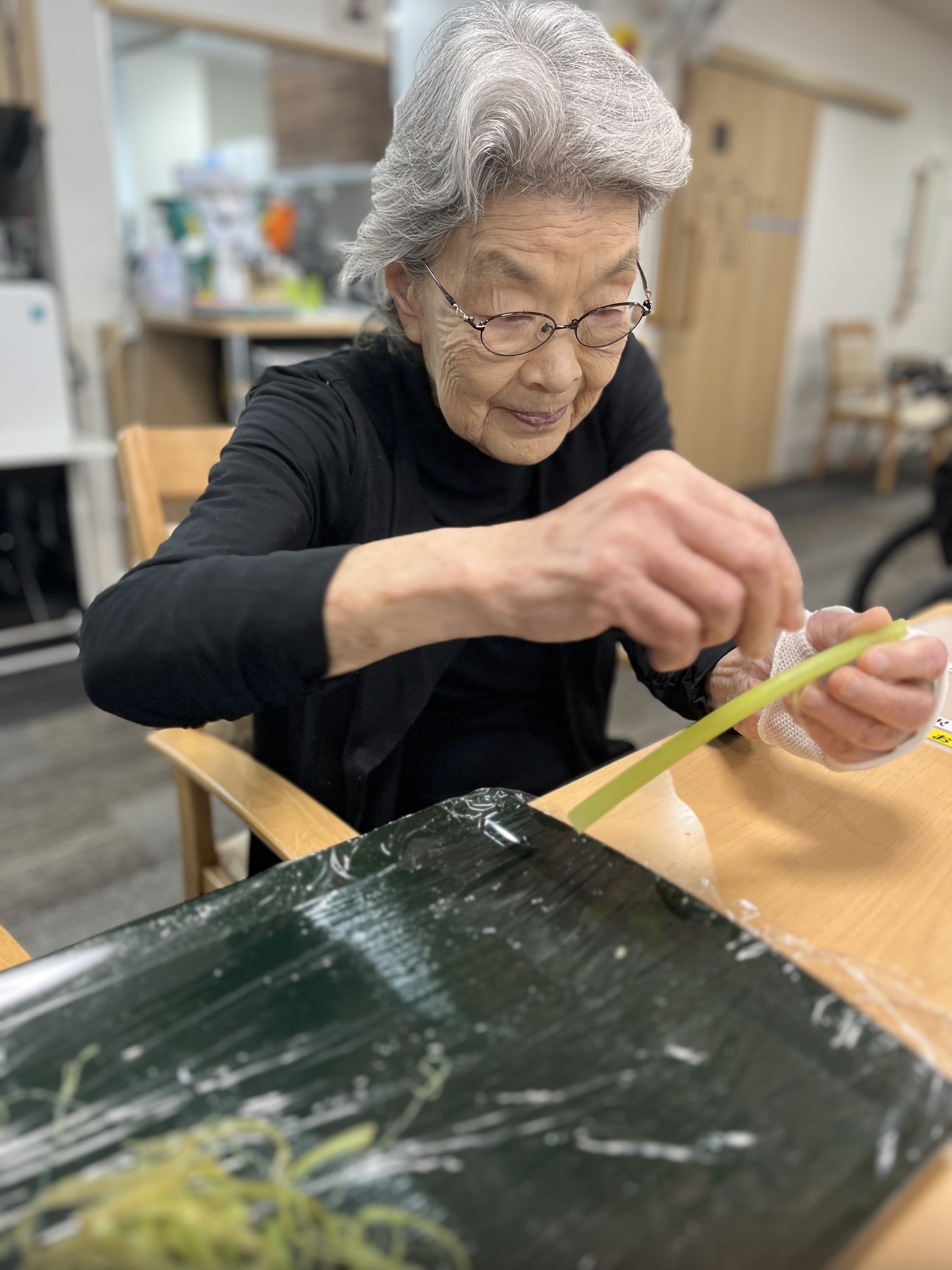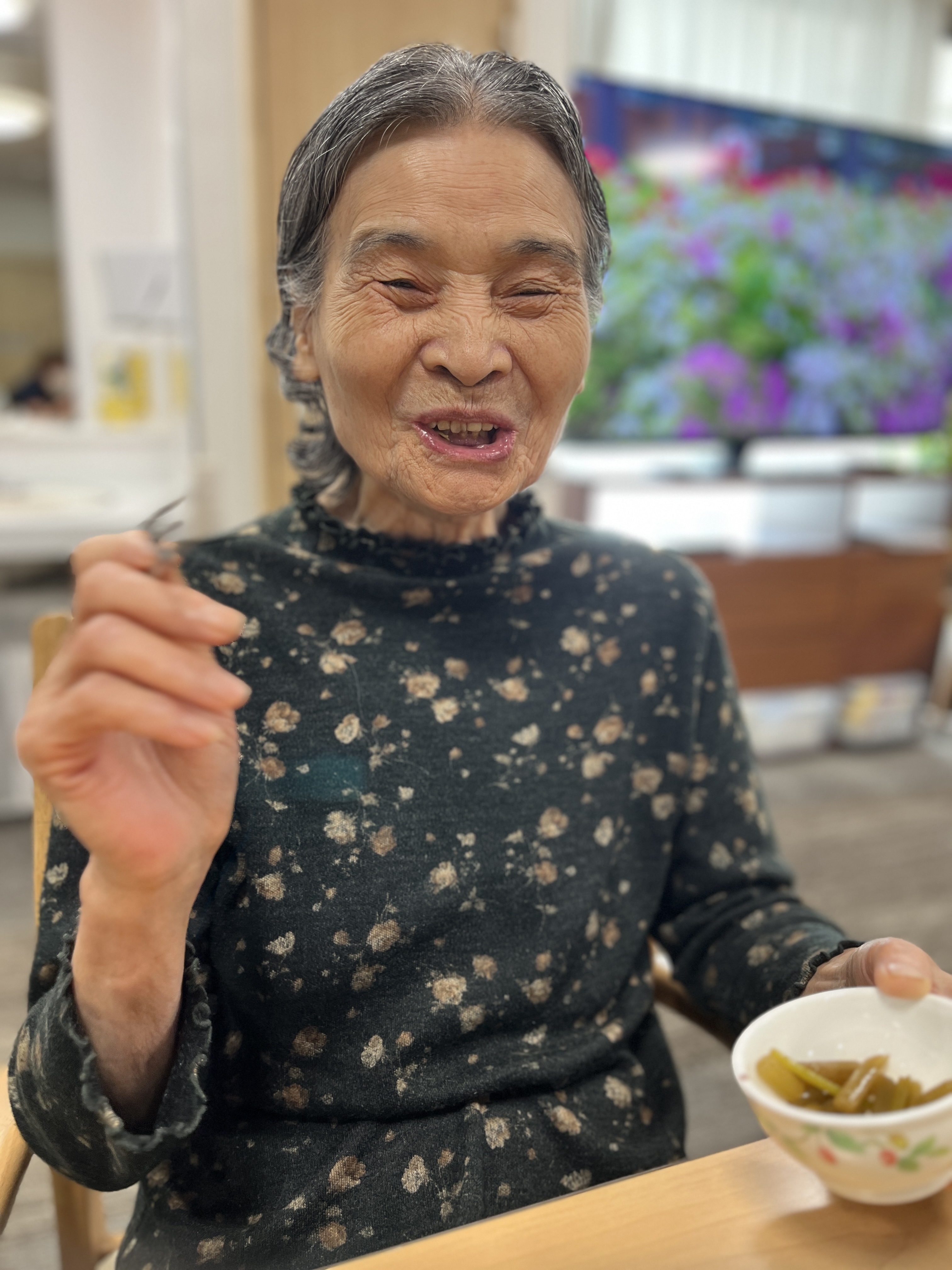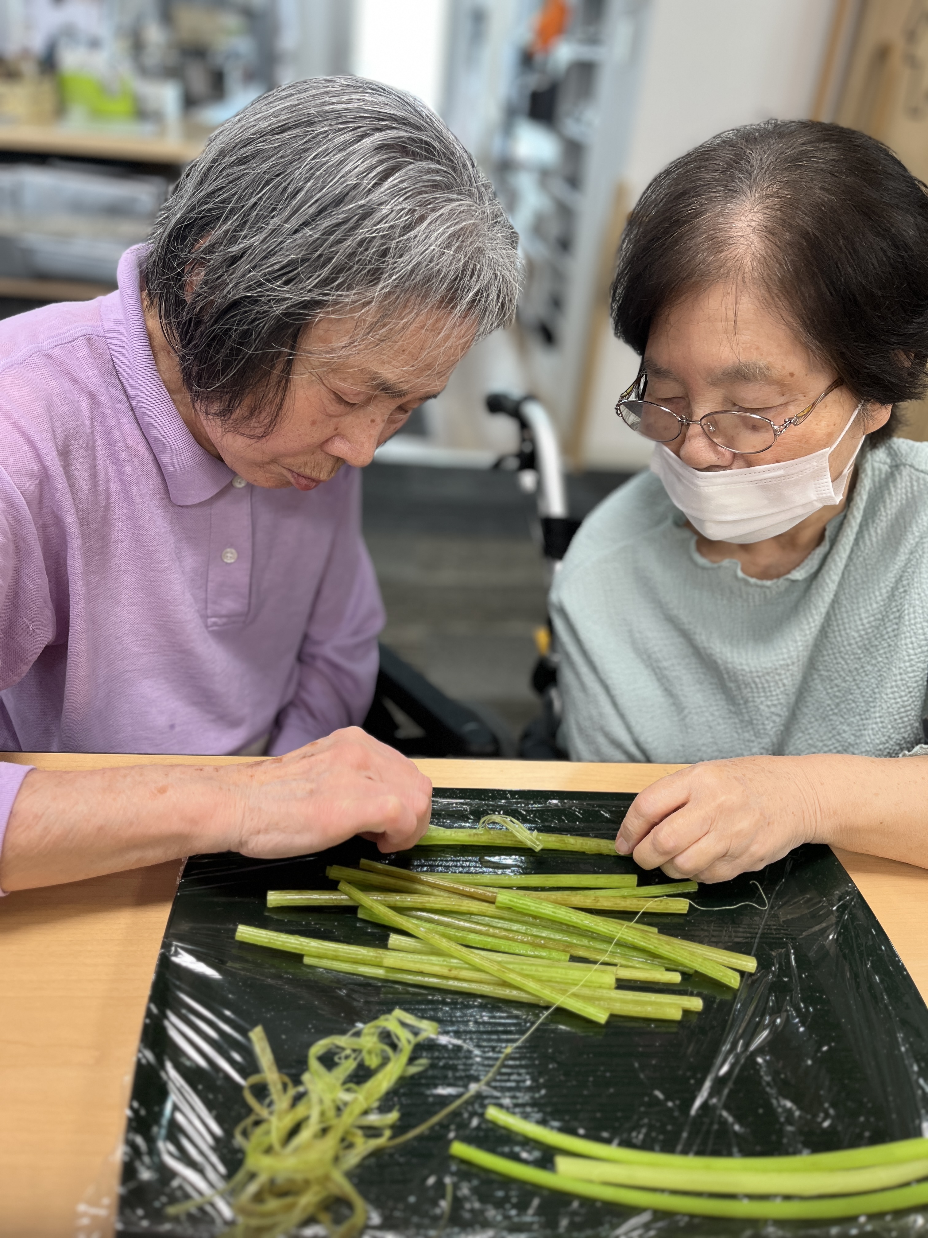 ご利用者のお庭で採れたふきです。朝採れ新鮮なふきを早速施設に持ってきてくださいました。皆様にふきの筋を剝いていただき、上品な煮物にしました。柔らかくて香りも良く、春の味に舌鼓を打ちました。あまりの美味しさに笑顔があふれます!