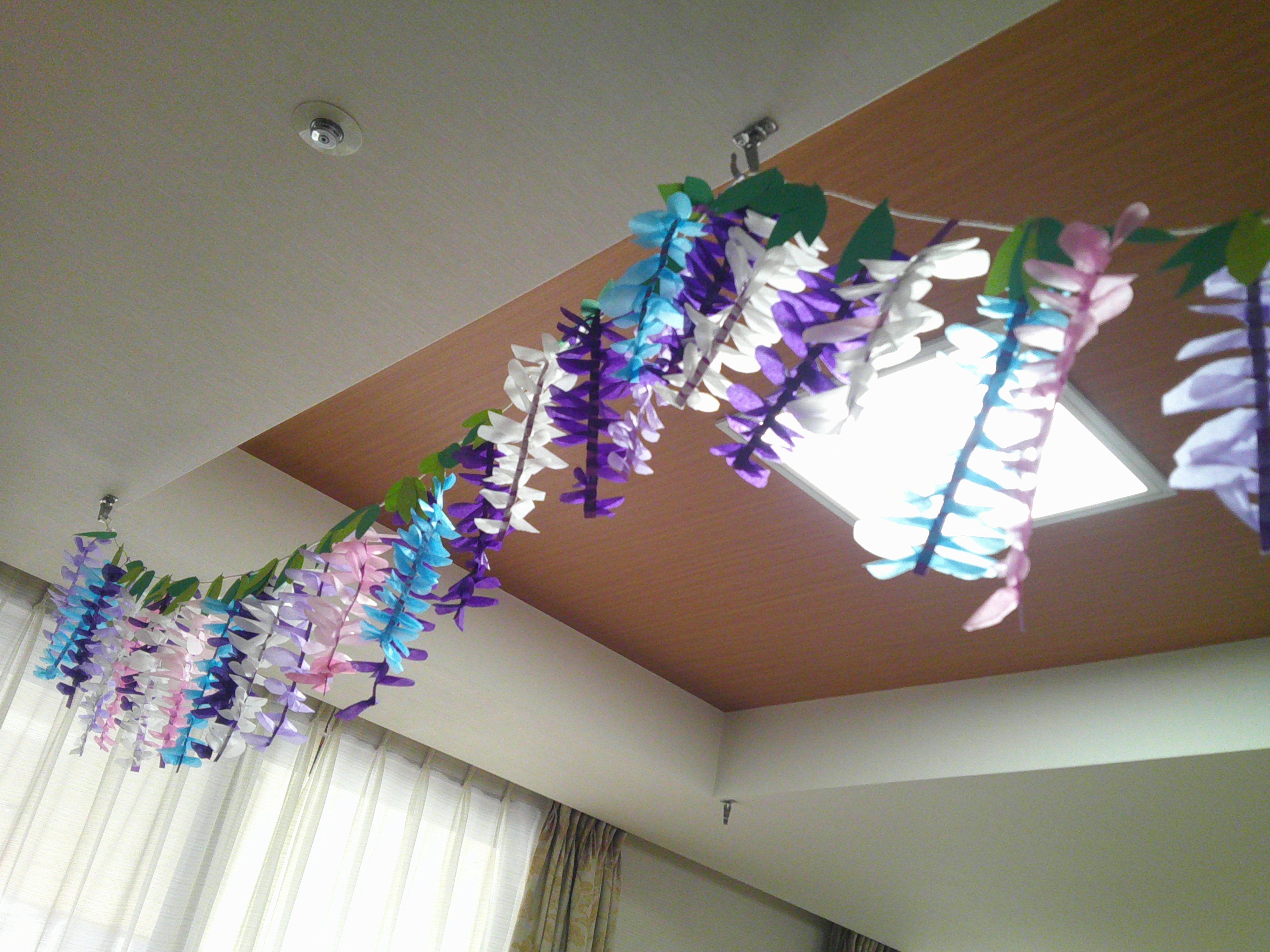 食堂入口に藤の花を飾りました☆一気に華やかになり、みなさん喜んでくださっていました!コツコツと作業をしてくださった方々、ありがとうございました(^^♪