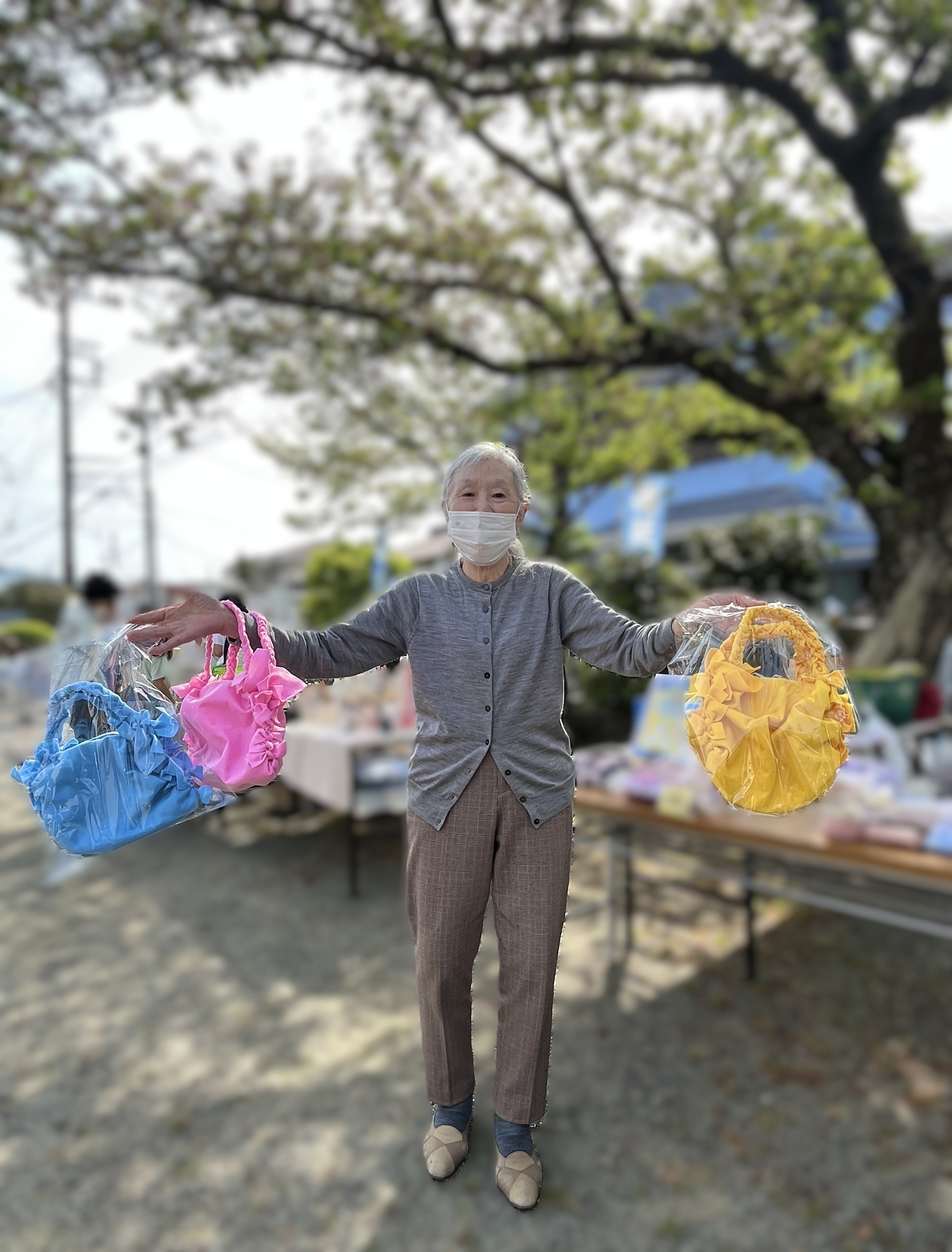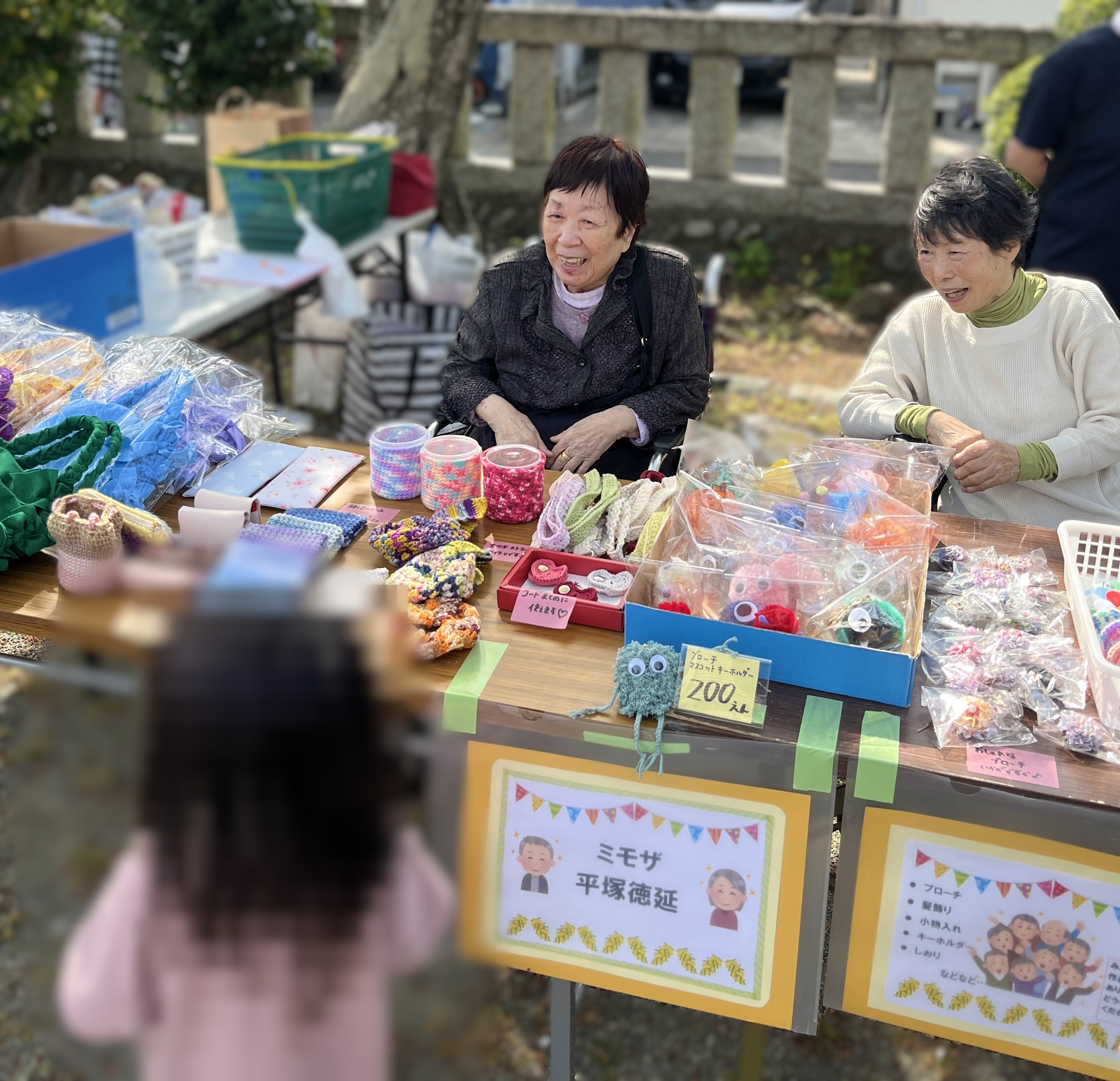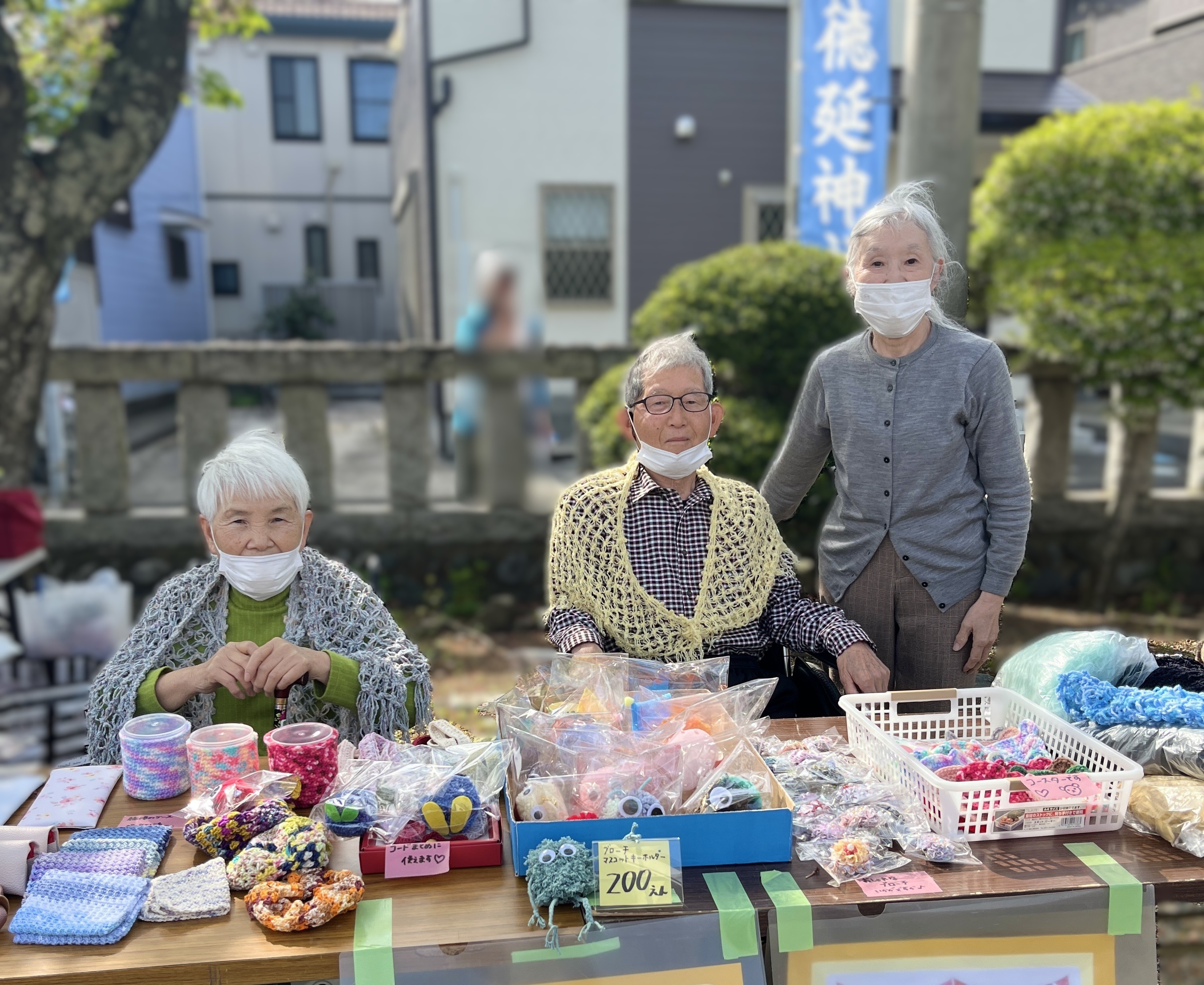 4月19日土曜日、施設からすぐ近くの徳延神社のお祭りのフリーマーケットに参加しました♪皆で制作したキーホルダーやバッグ等を出品し、青空の下、地域の方達との交流ができました♫
