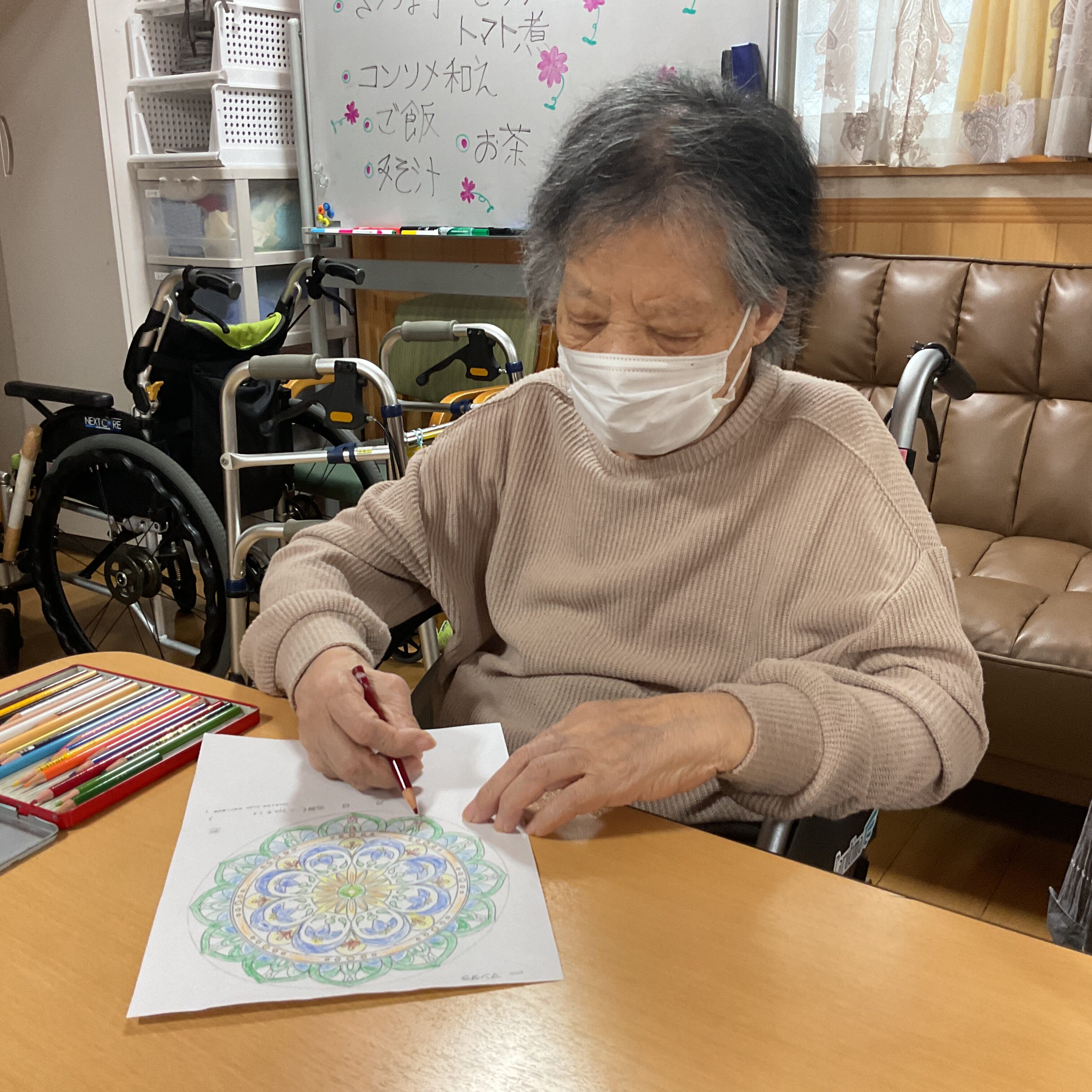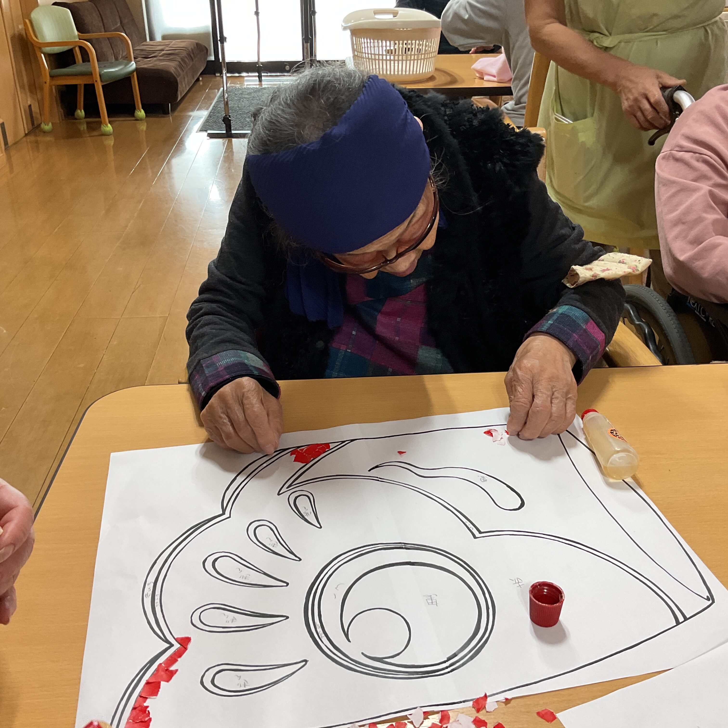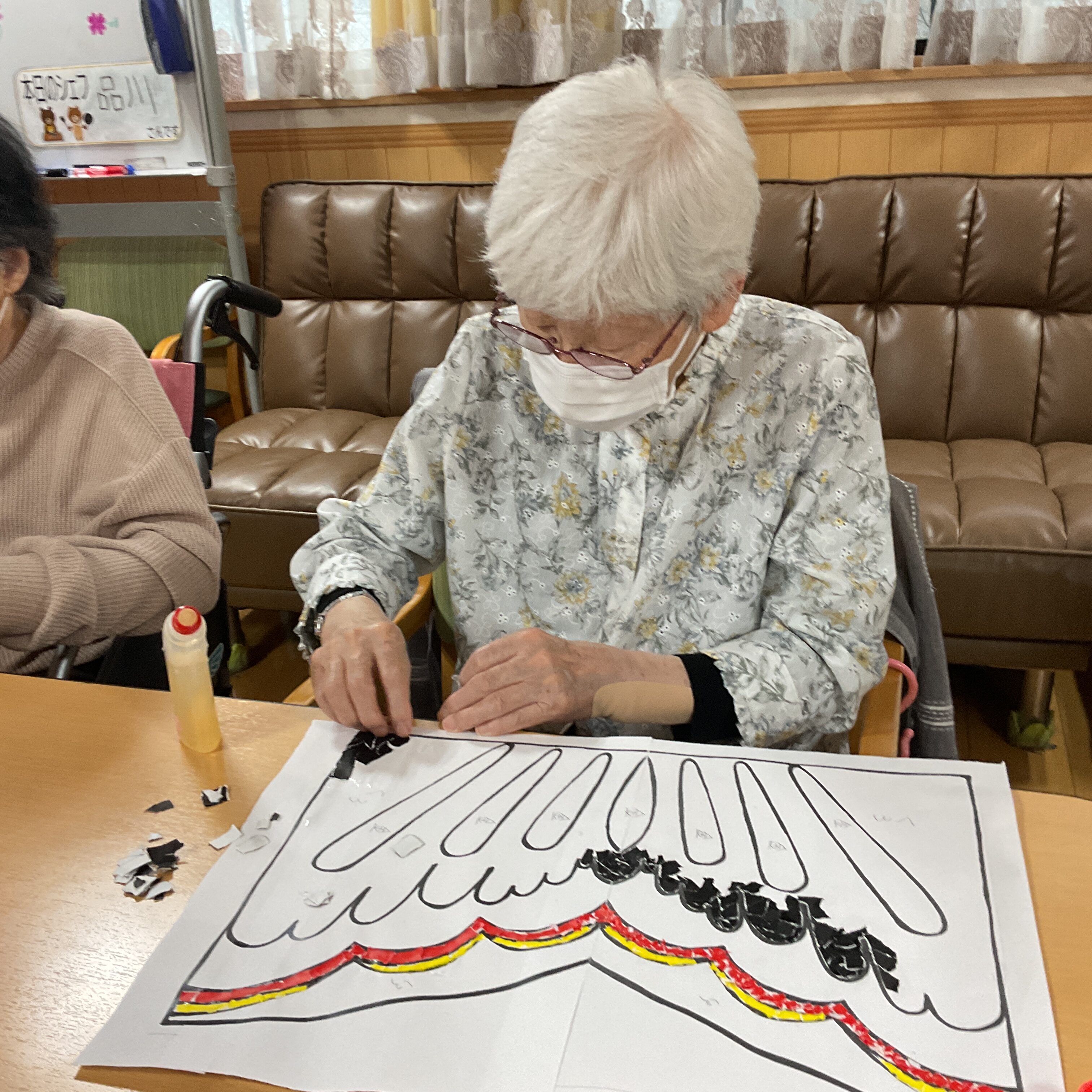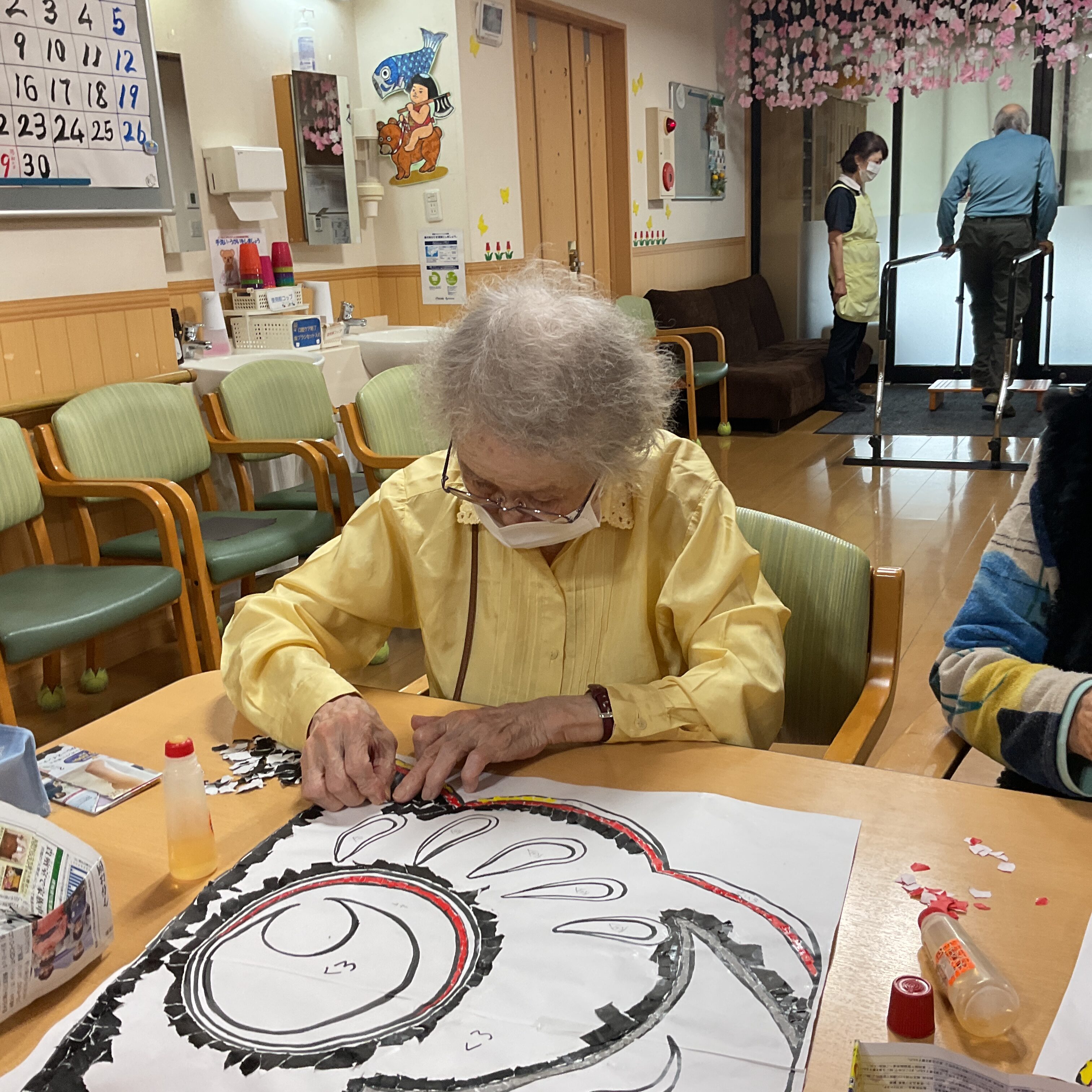 利用者さんの曼荼羅の塗り絵を鱗にして、鯉のぼりが完成‼ 塗り絵をしたり、貼り絵をしたり、みんなでコツコツと頑張りました!(^^)! 青空をスイスイ泳いでます⁉(≧▽≦)