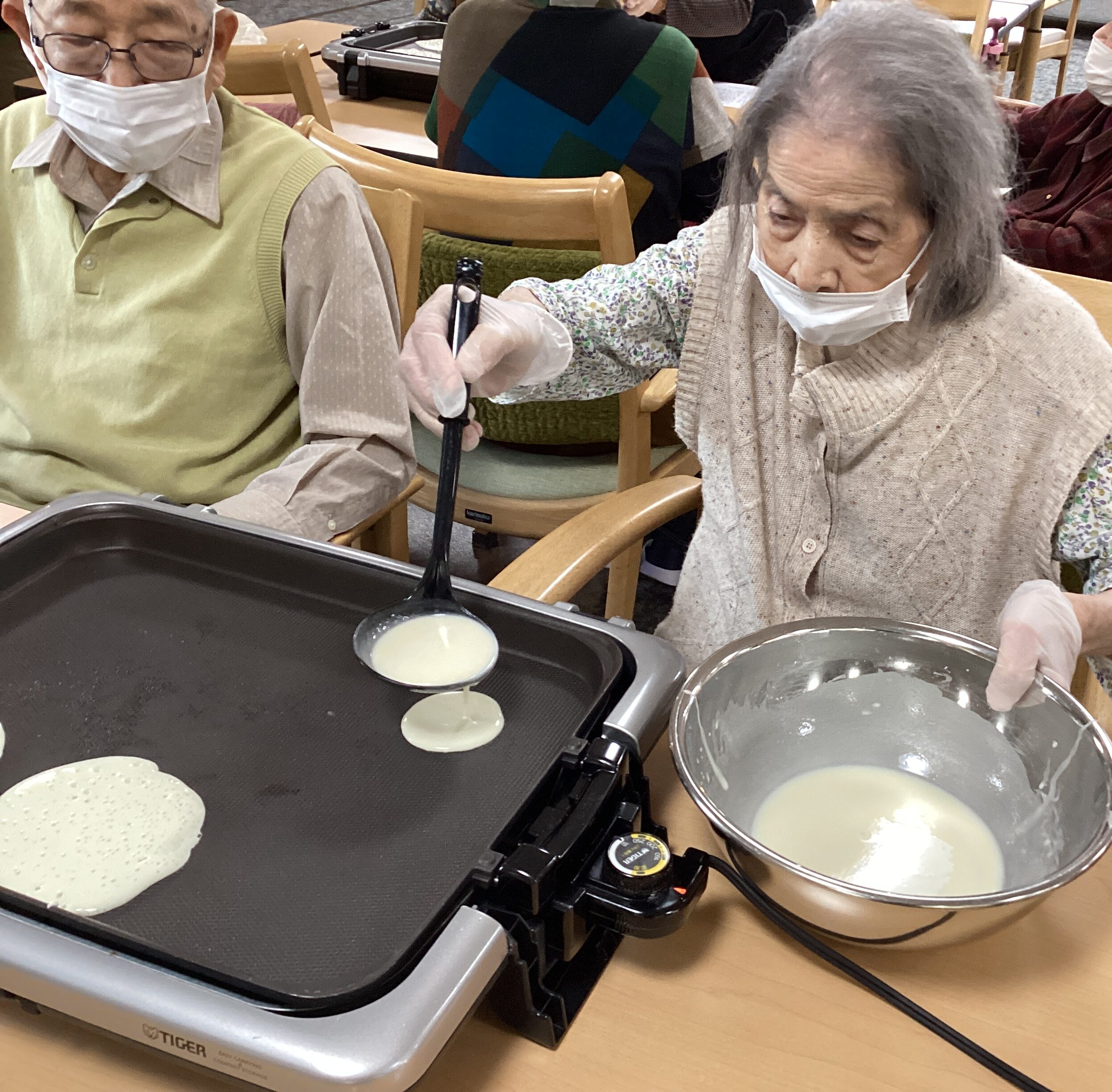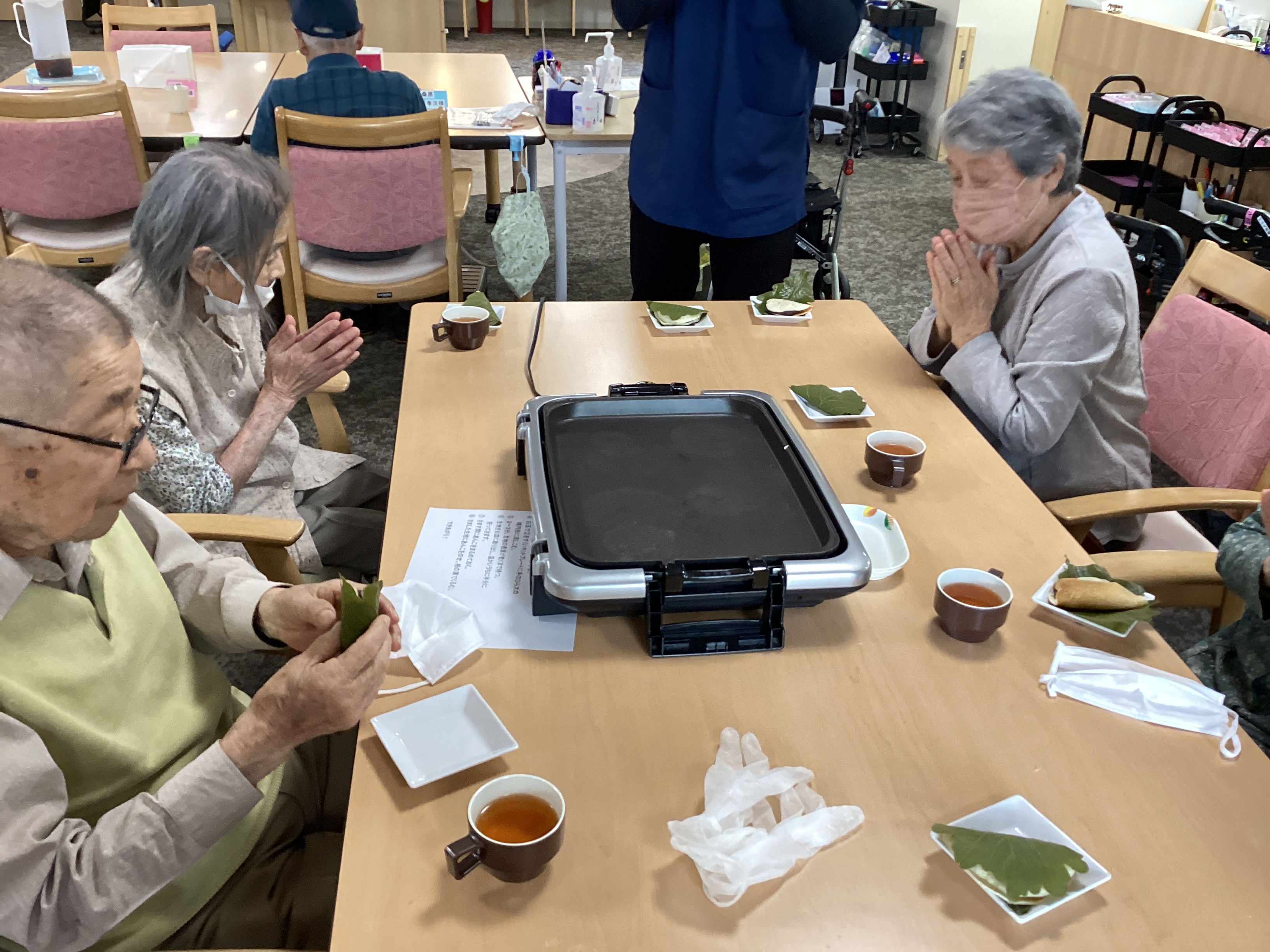 今月の手作りおやつは、かしわ餅😊 おもちで包むのももちろん美味しいですが、今回はちょっと一工夫の皮です👍 飲み込みも心配なく、するする食べていただけます✨ 柏に包めばこの季節の風味を感じられますね😘