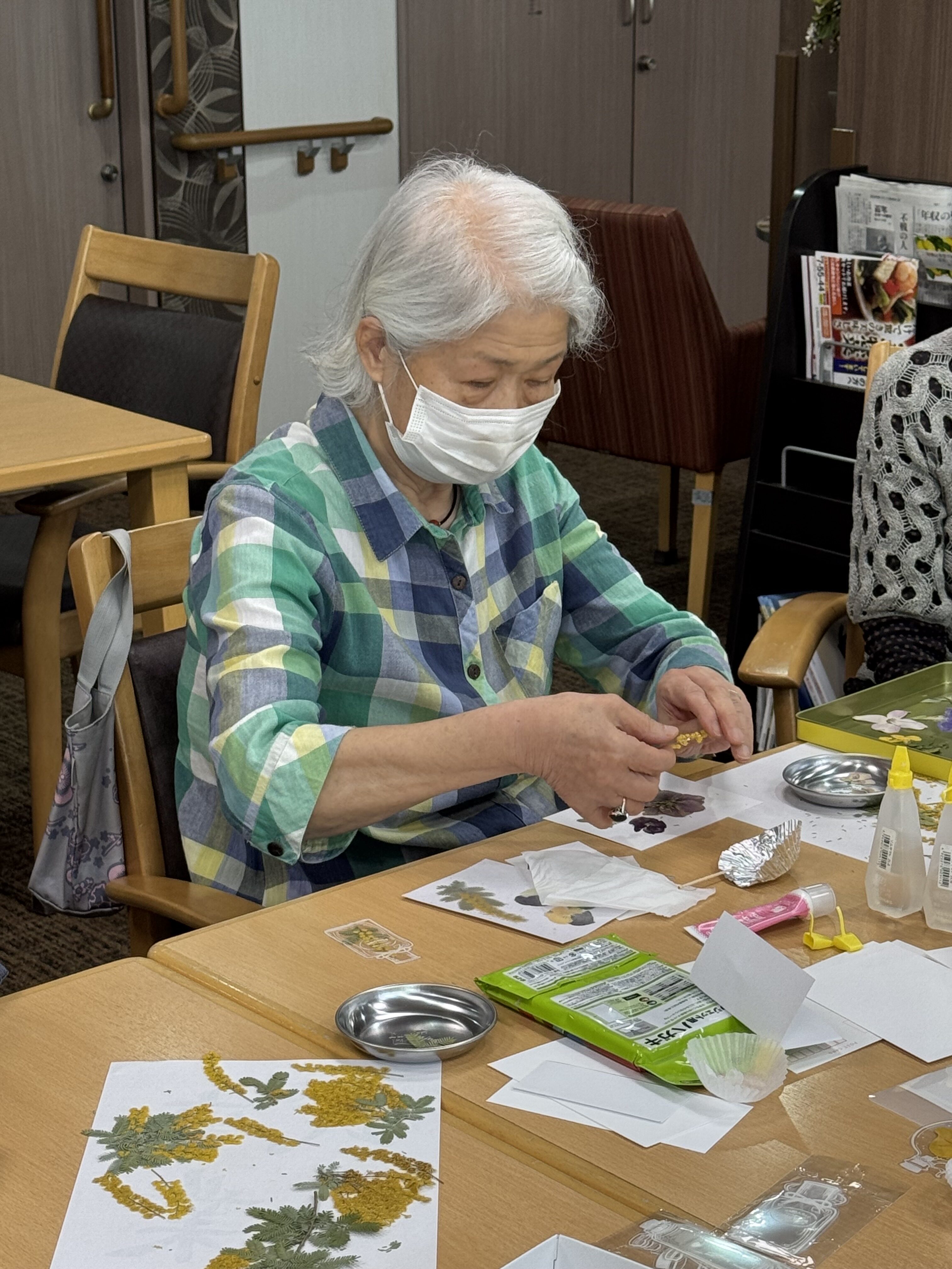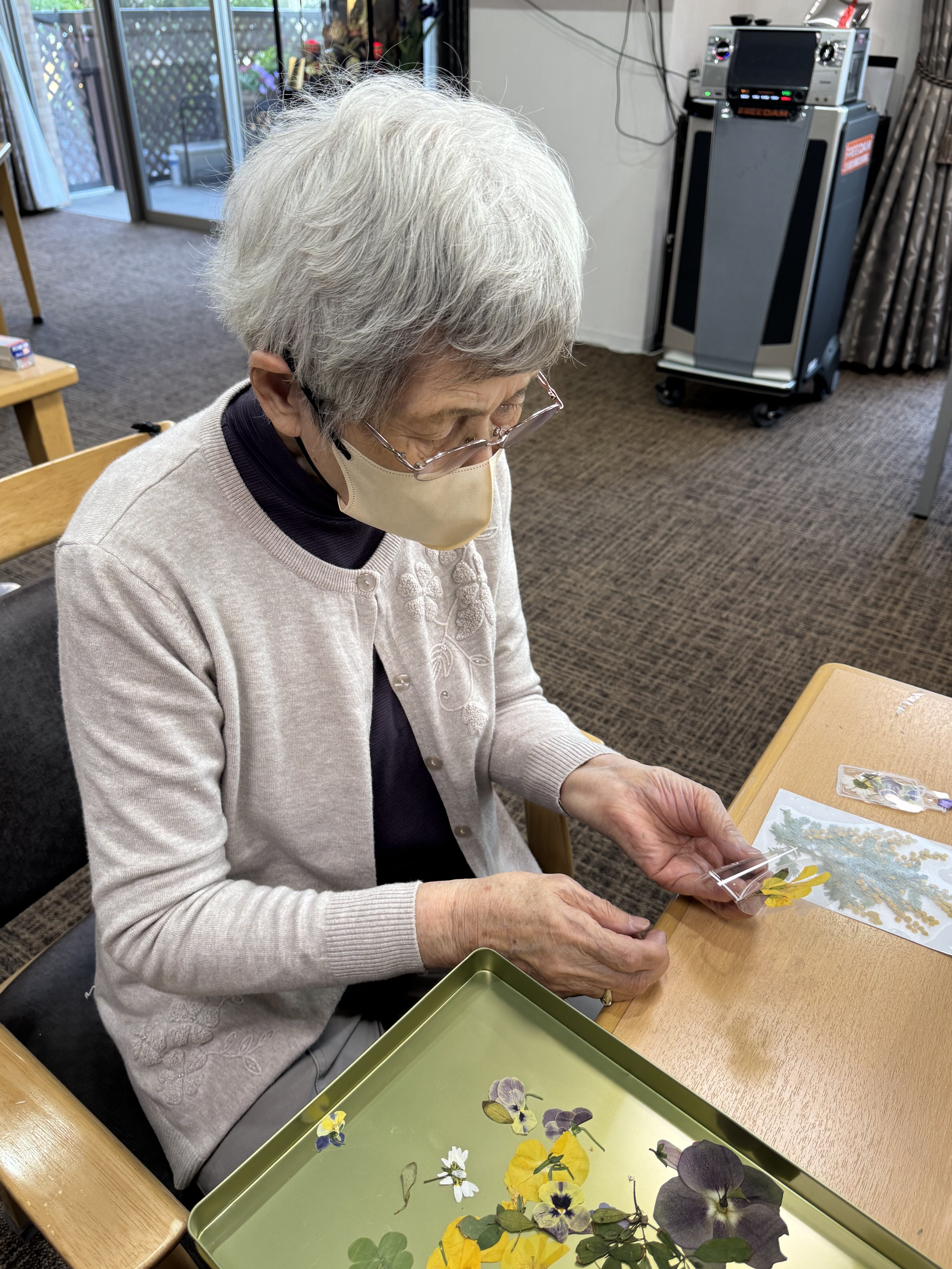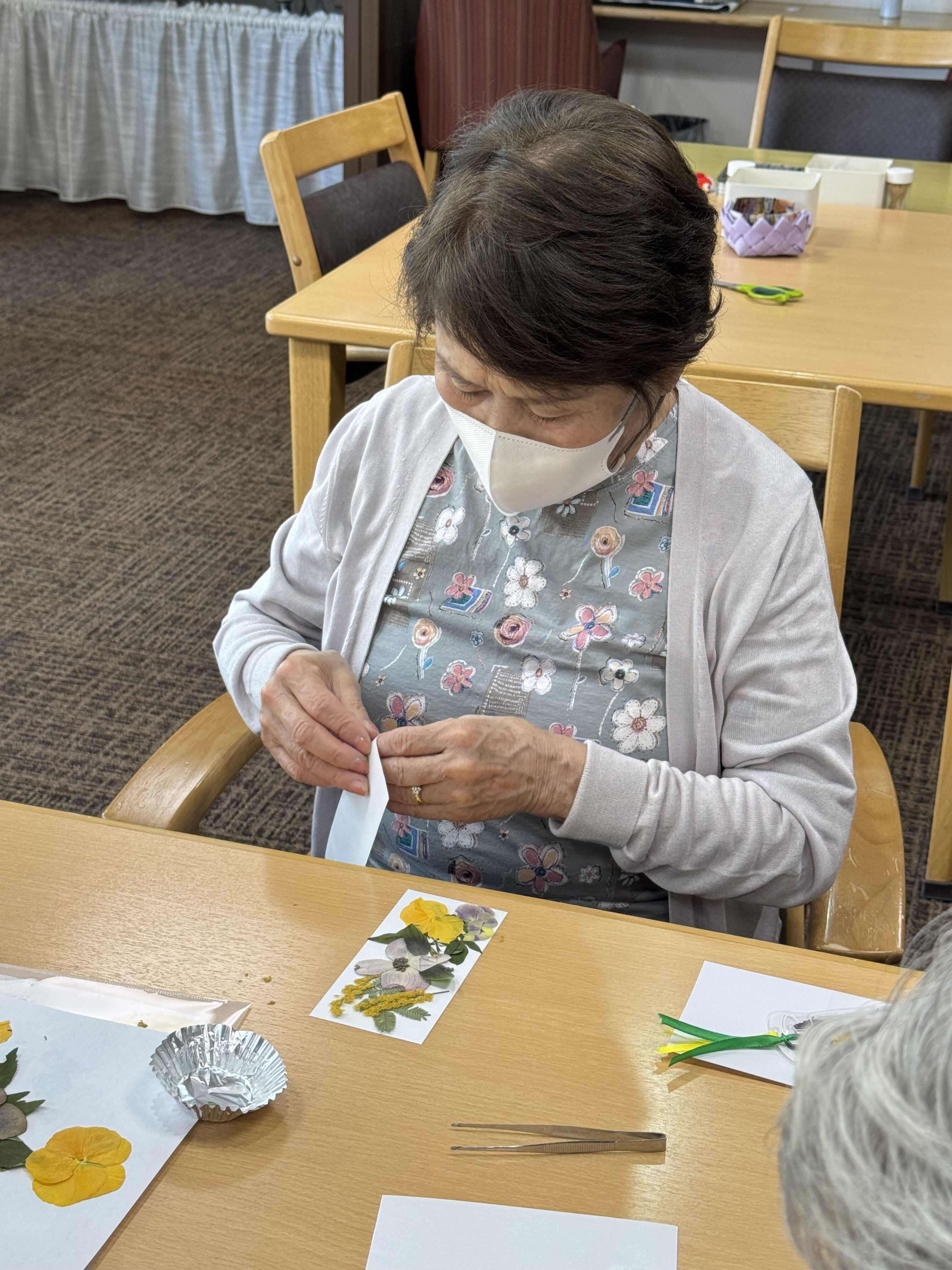 花梨苑で咲いていたお花を押し花にしました。レイアウトや色合いを悩みながら楽しい時間でした。