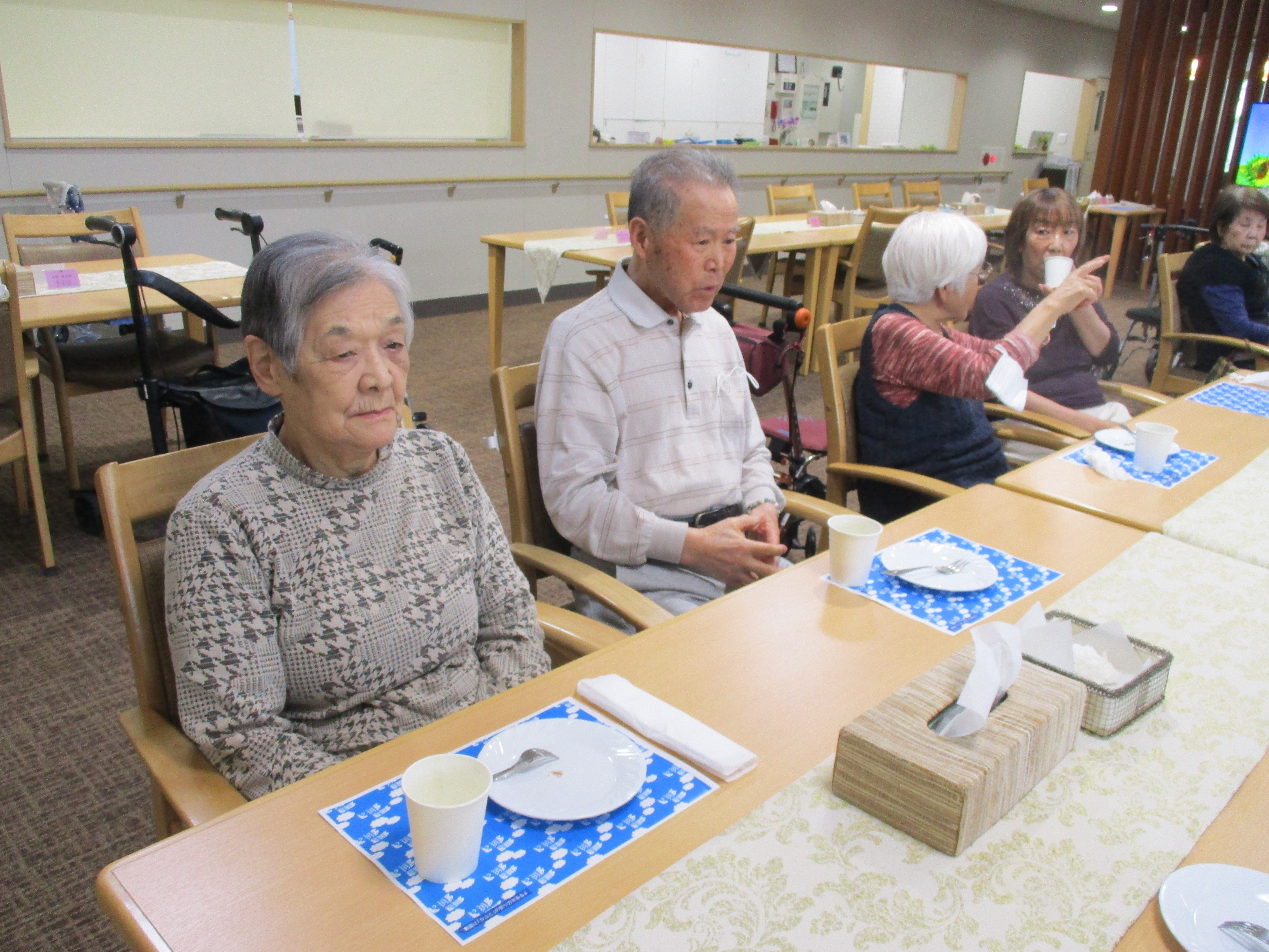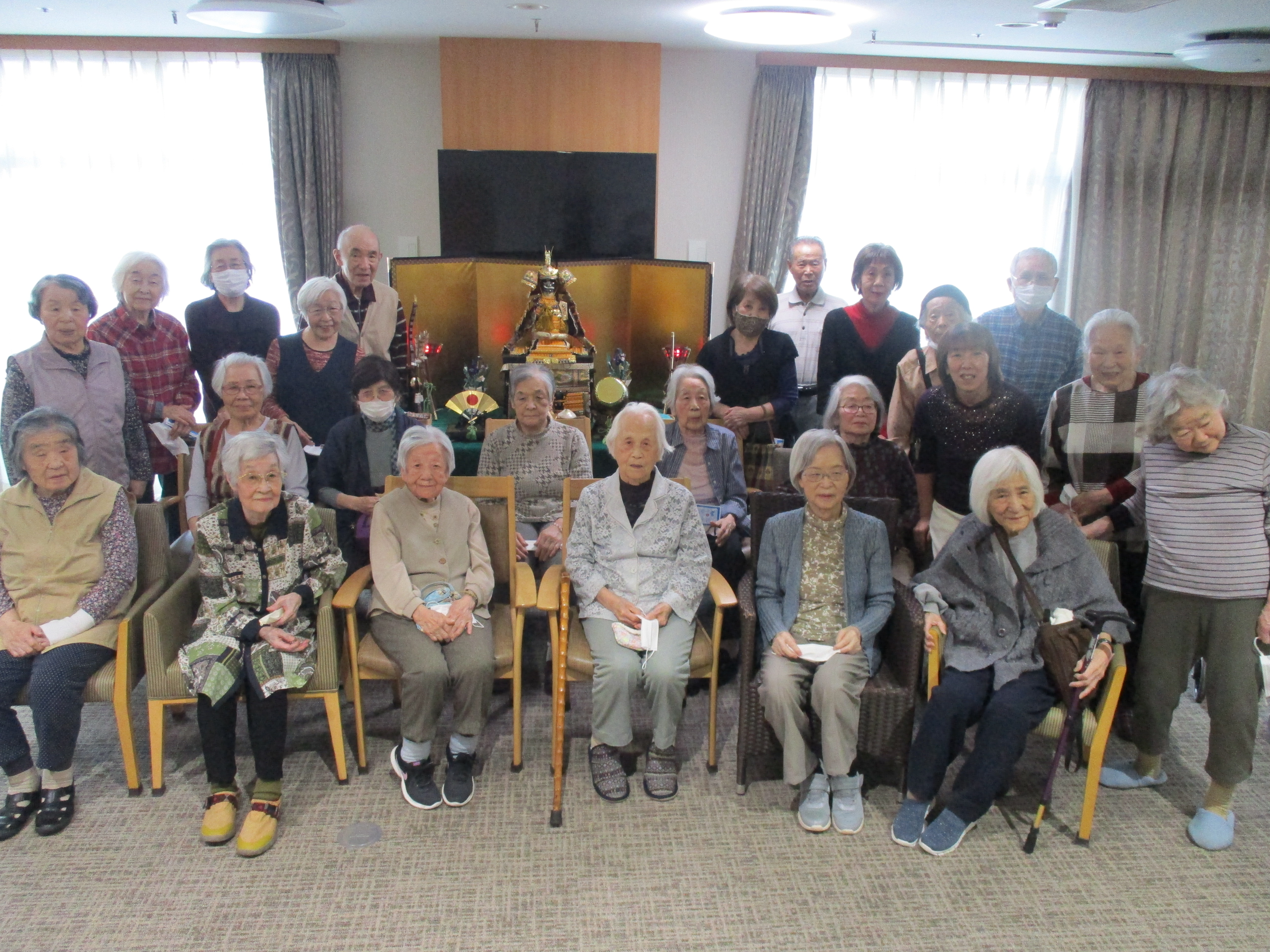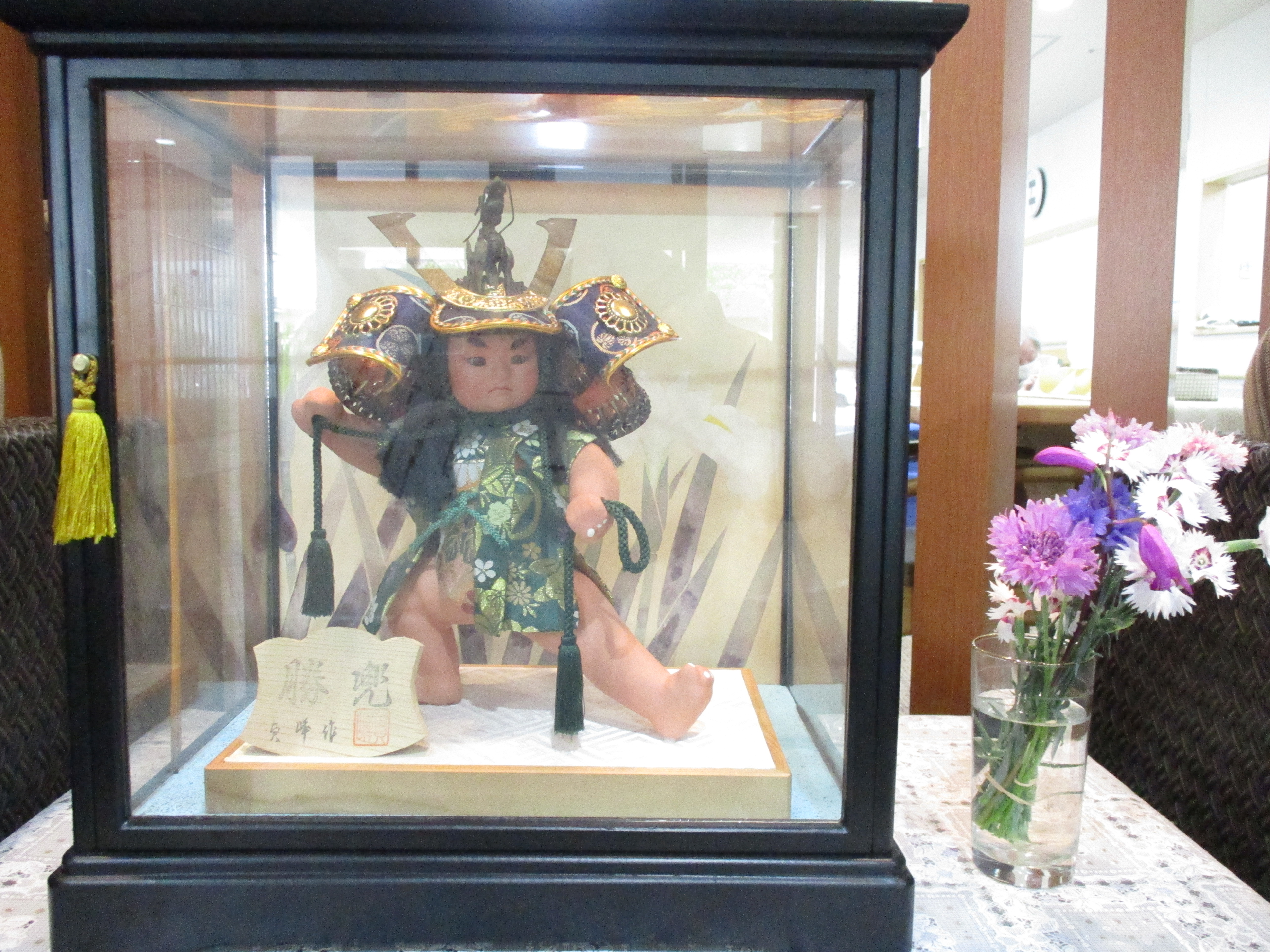 五月の節句 皆様で五月人形の前で写真を撮りました。 その後は、緑茶ときんつばを召し上がって頂きました。
