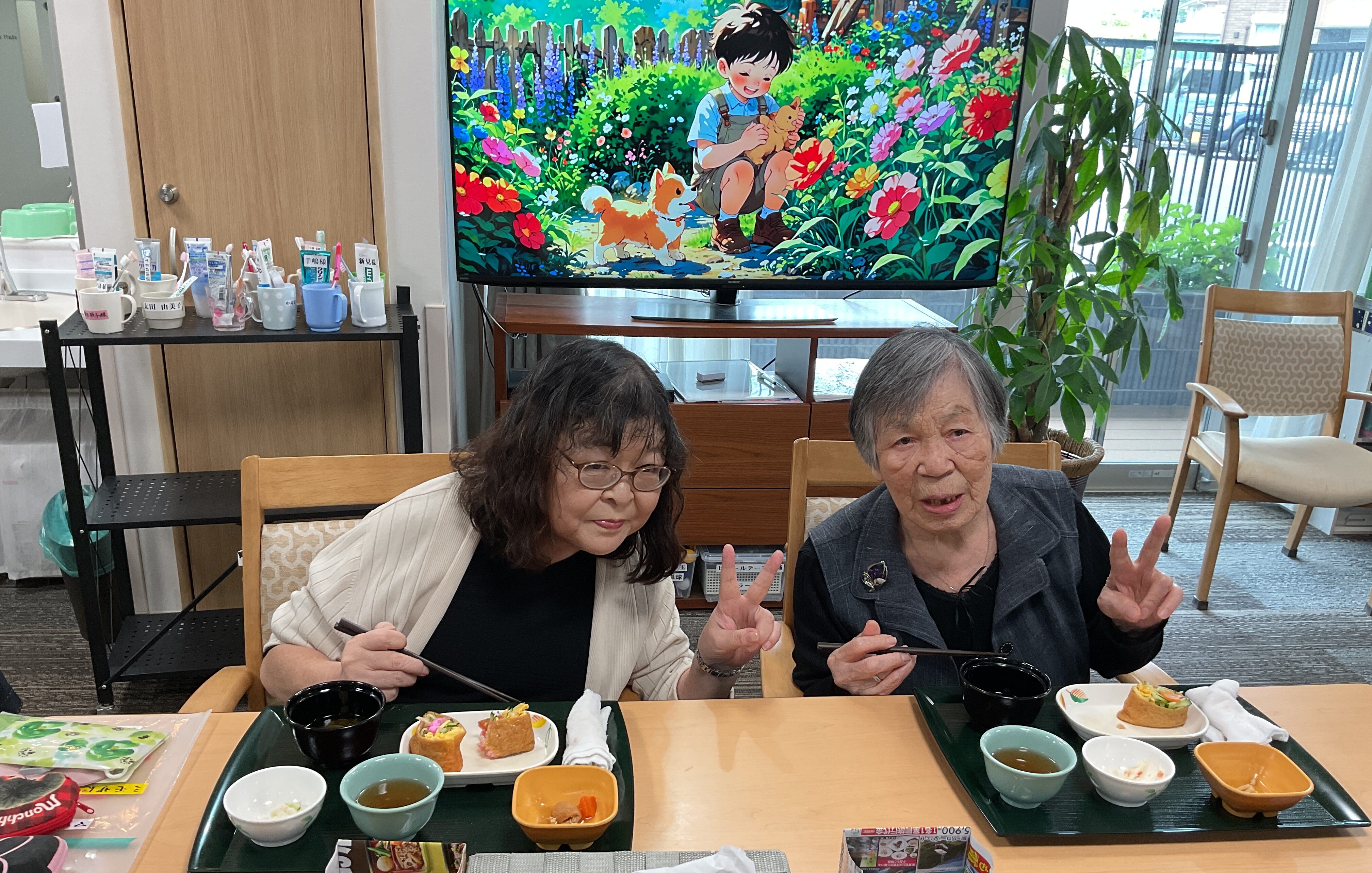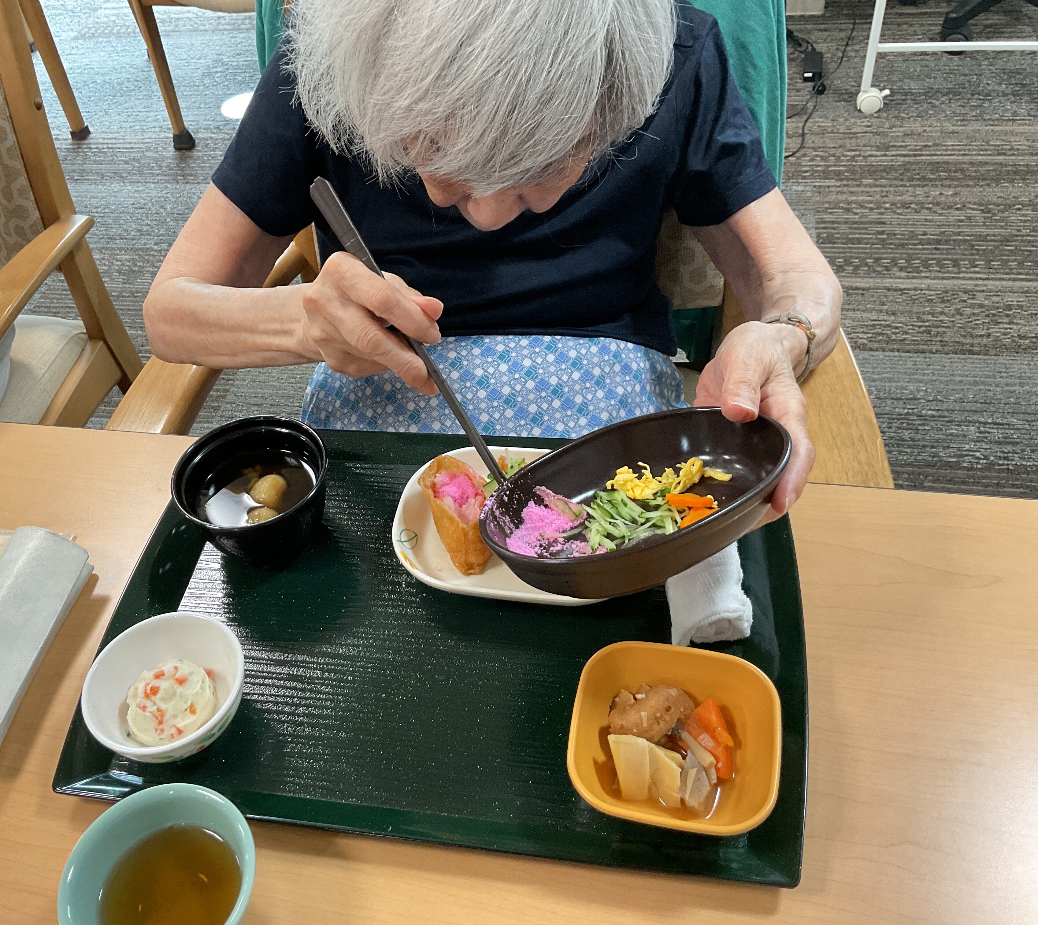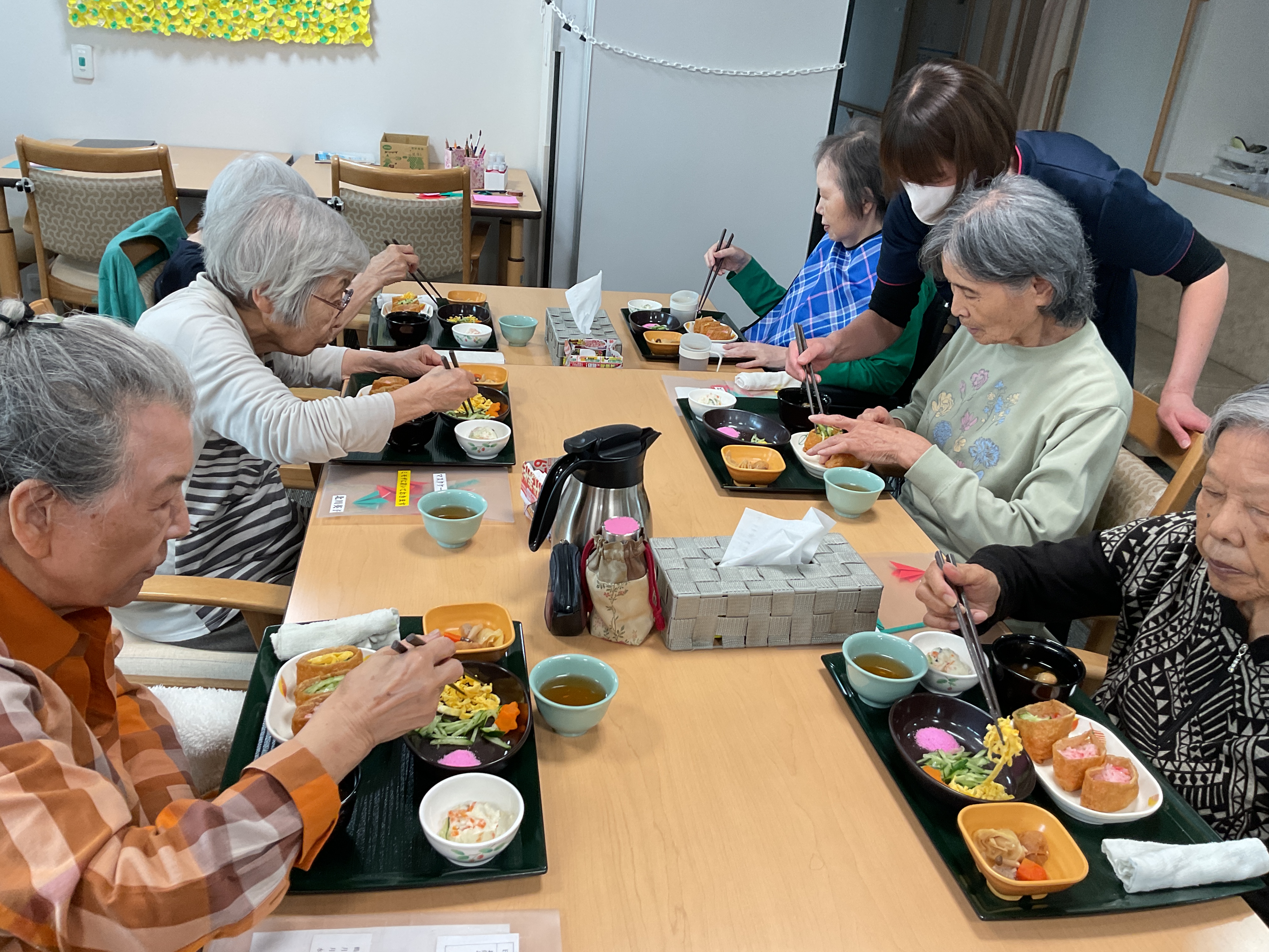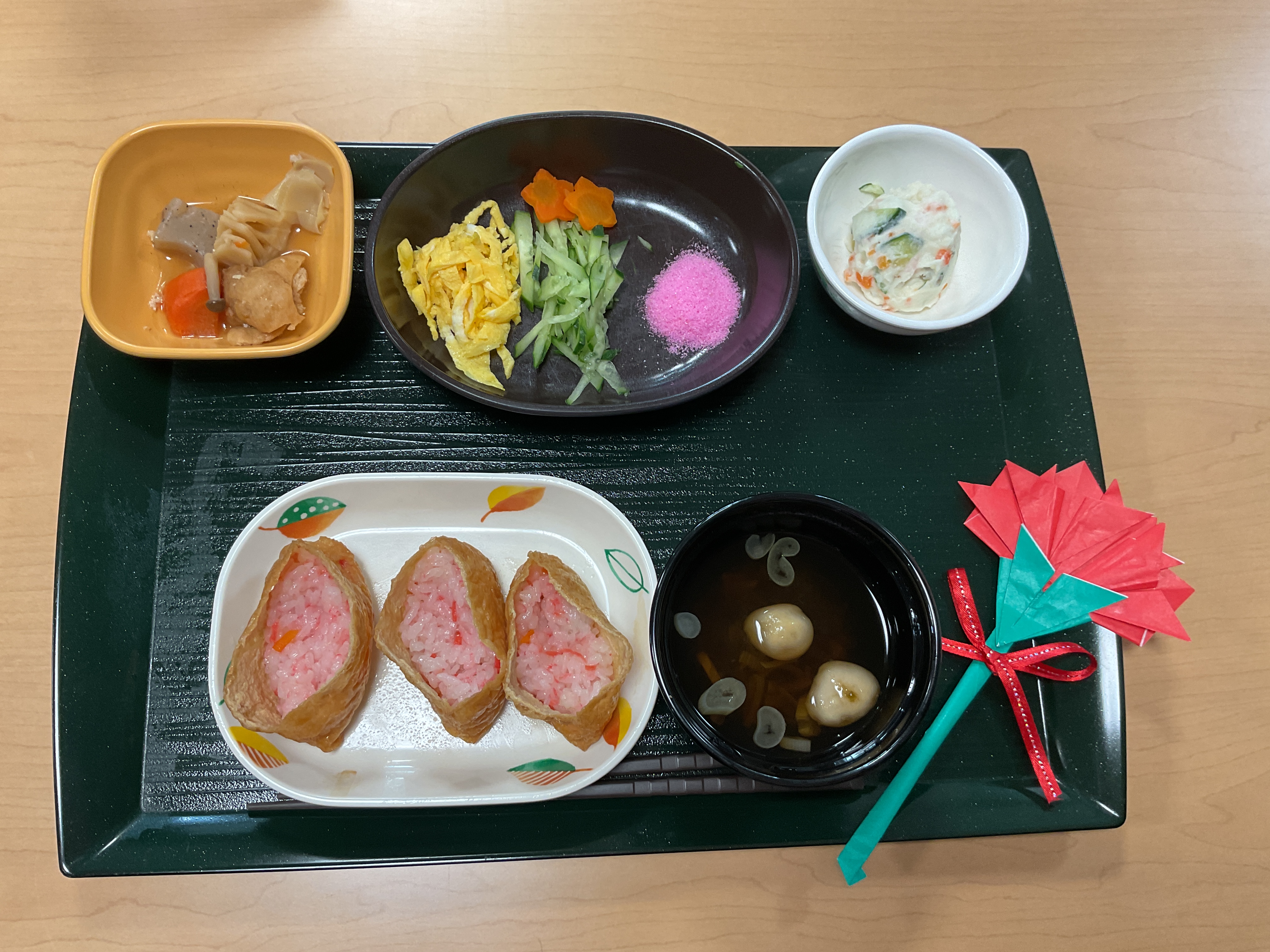 明後日は母の日ですね。今日は特別メニューです!ご自身で稲荷ずしに飾りつけをしていただき色鮮やかに仕上げました。他に筍の煮物やポテトサラダ、とろろ昆布のお吸い物を用意し、最後に手作りカーネーションを添えました。とても美味しくて大好評でした!
