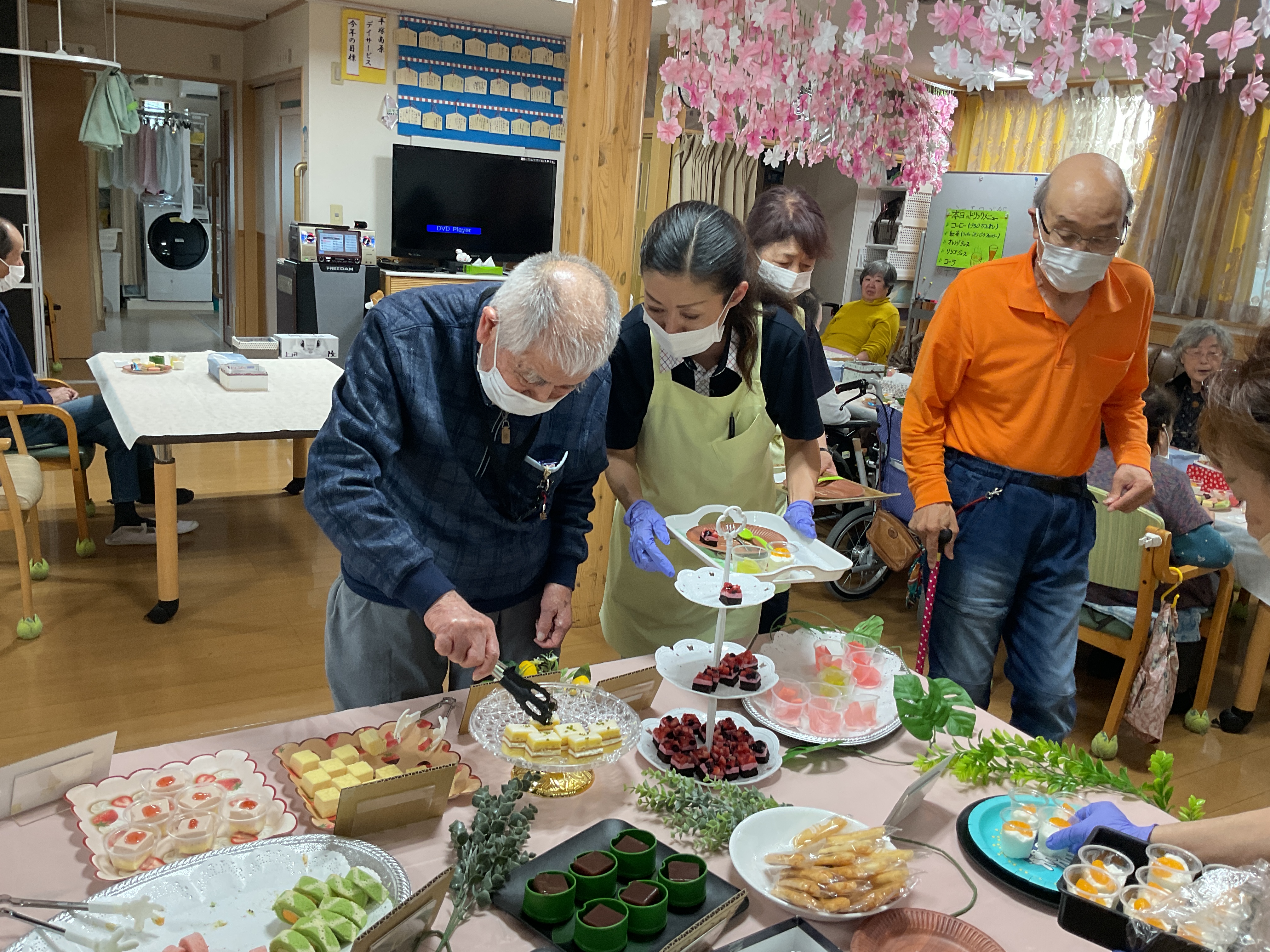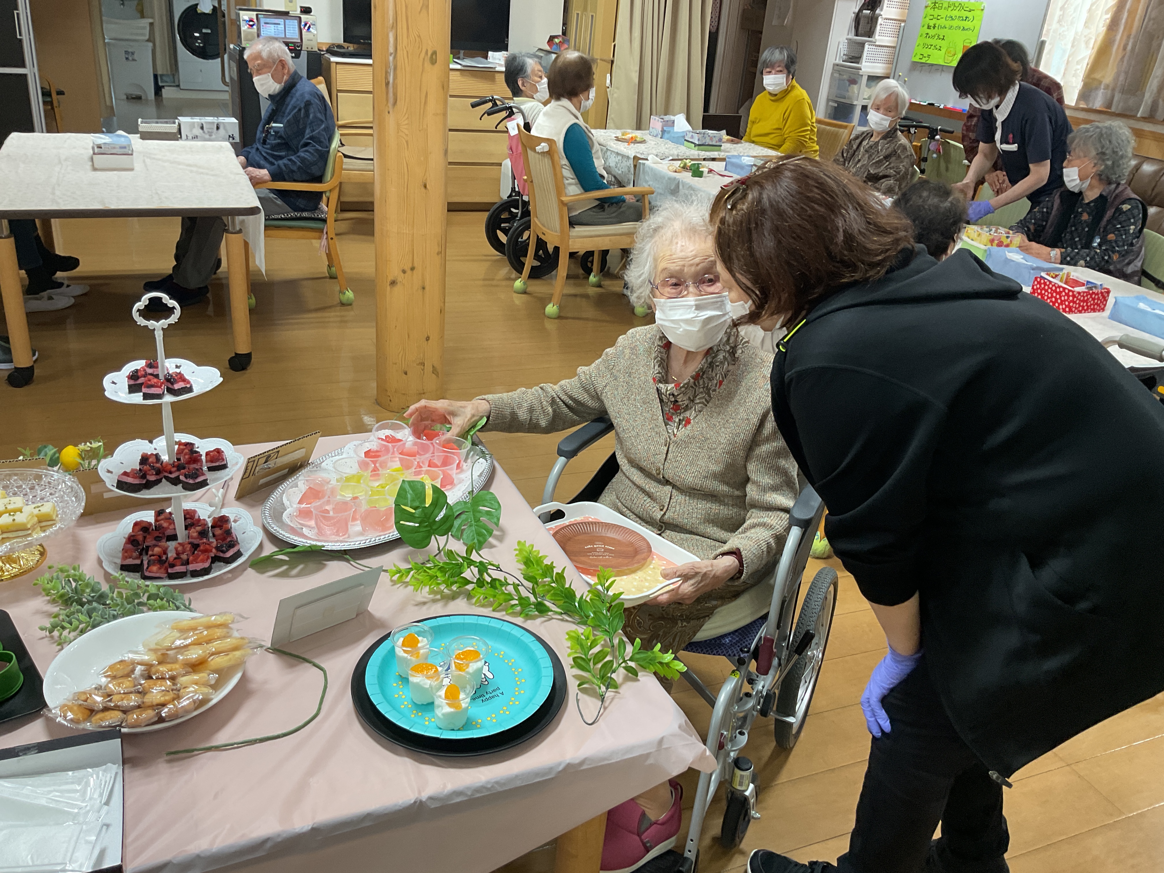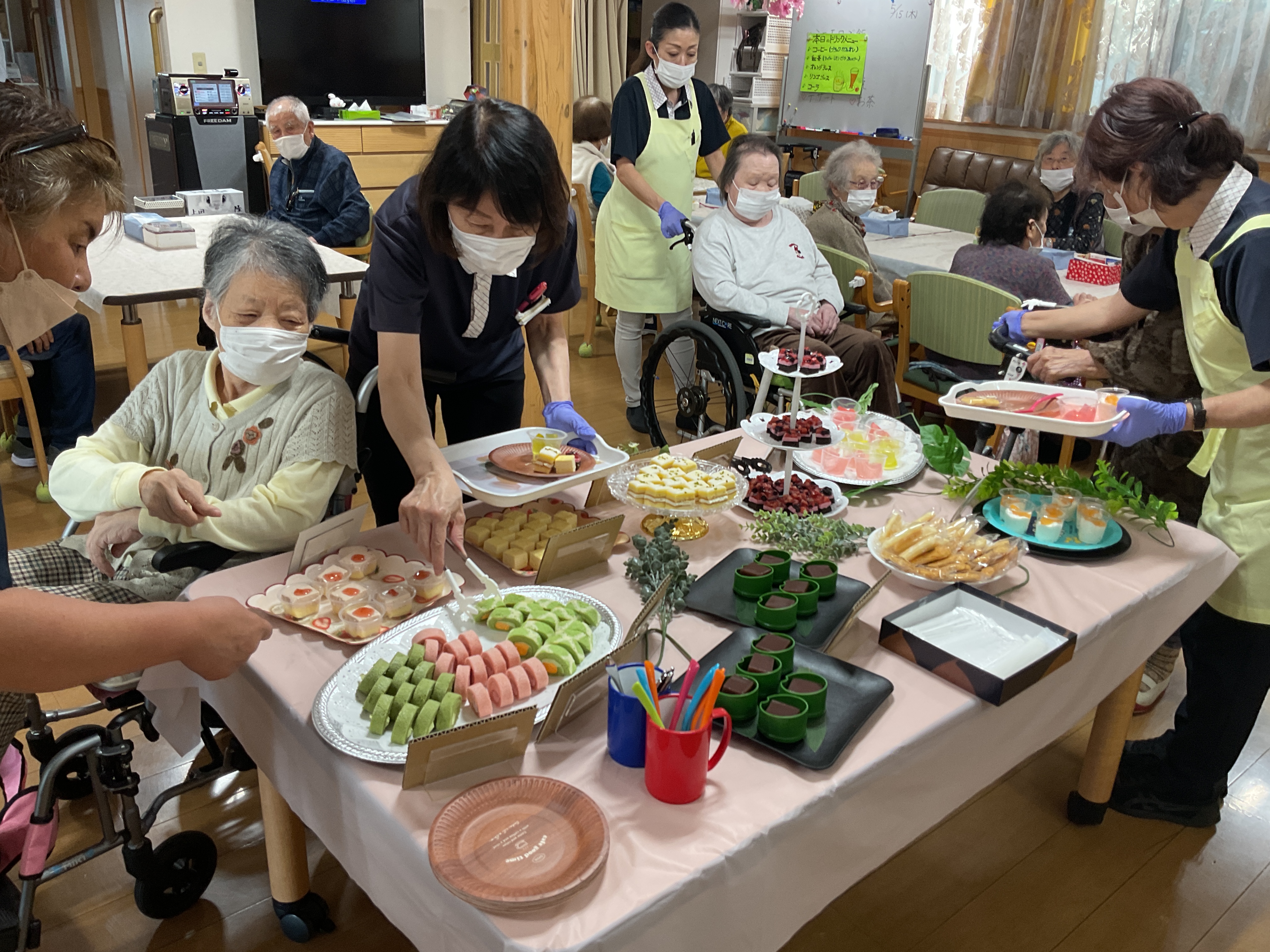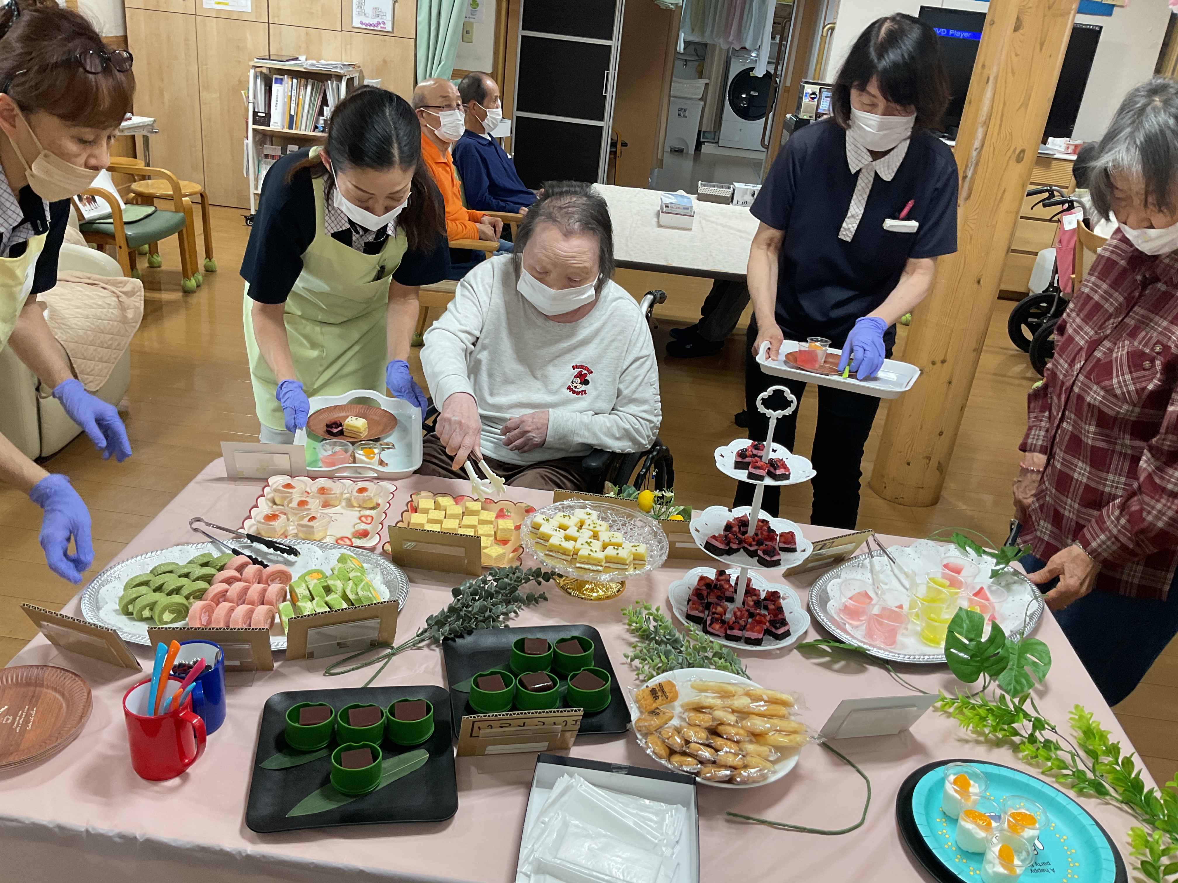 5月14日(水)のおやつ時間に「スイーツビュッフェ」レクをしました♬ 好きな物を好きなだけ取って頂き、ワイワイと楽しんで頂きました 皆さん2~3回は取りにきたり((笑))「甘い物は別腹ねぇ~」「美味しい~」とニコニコ笑顔がとても嬉しかったです♪