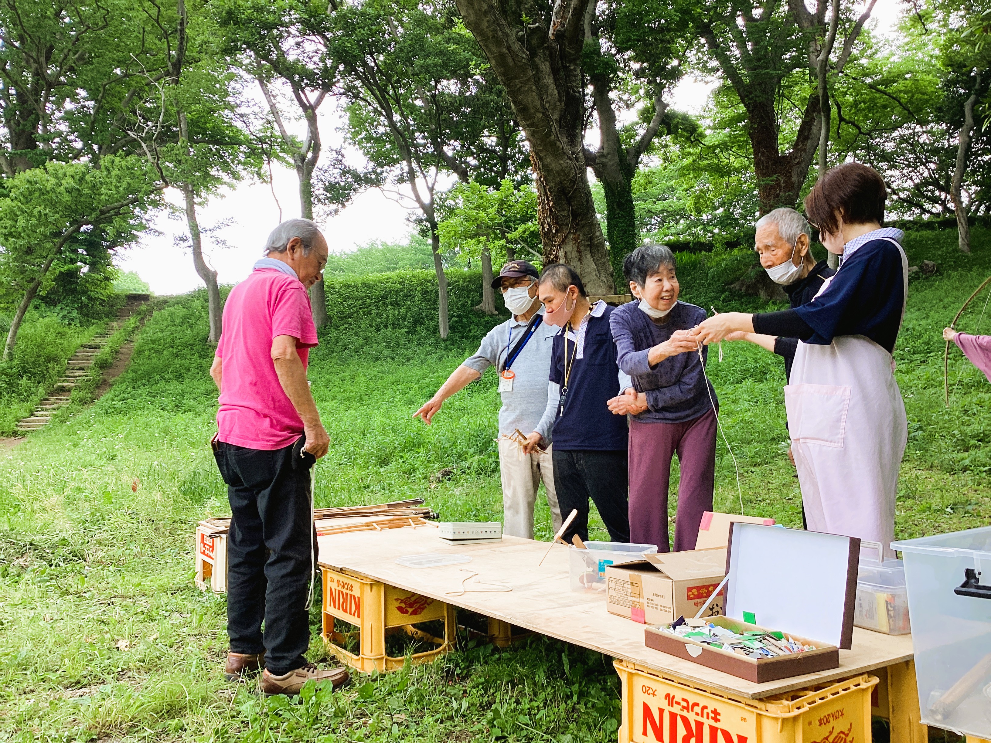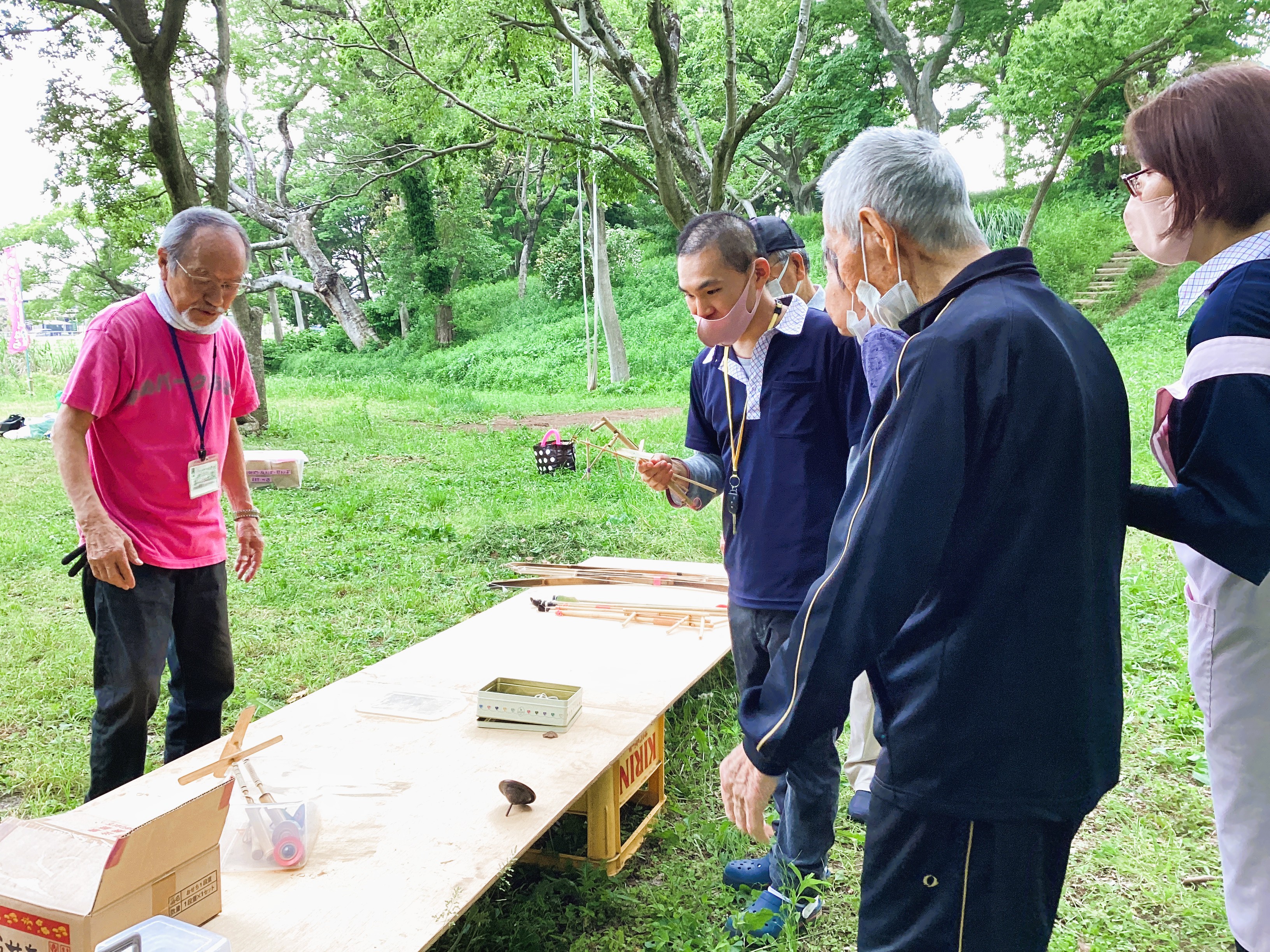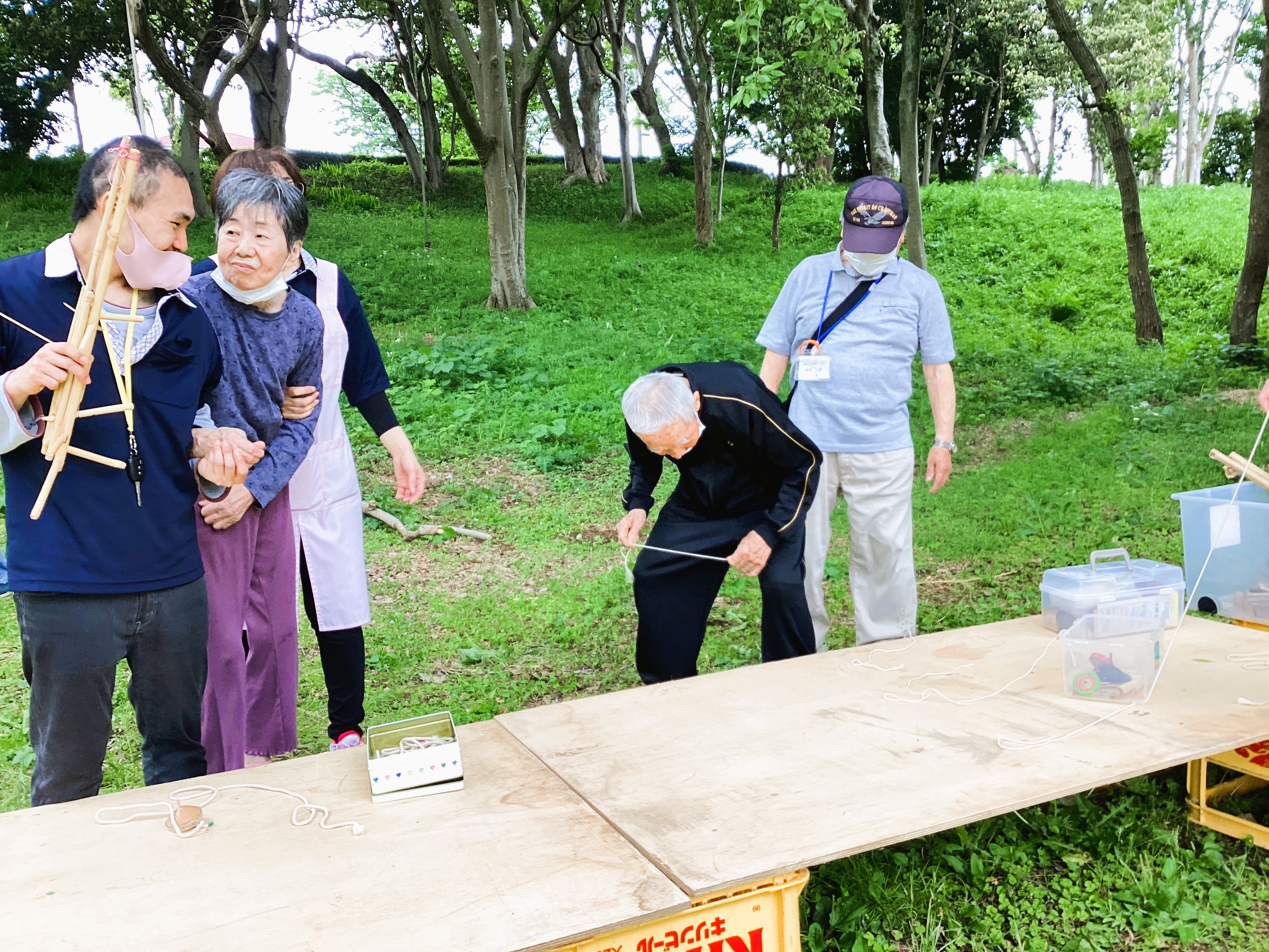 「よく回るこまはどれだろう?」 ご利用者様とボランティアさんが真剣にコマを吟味して、、 こま回し体験!!! 職員の方が興味津々な様子もあったりして💦 一緒に楽しめて嬉しかったです!!