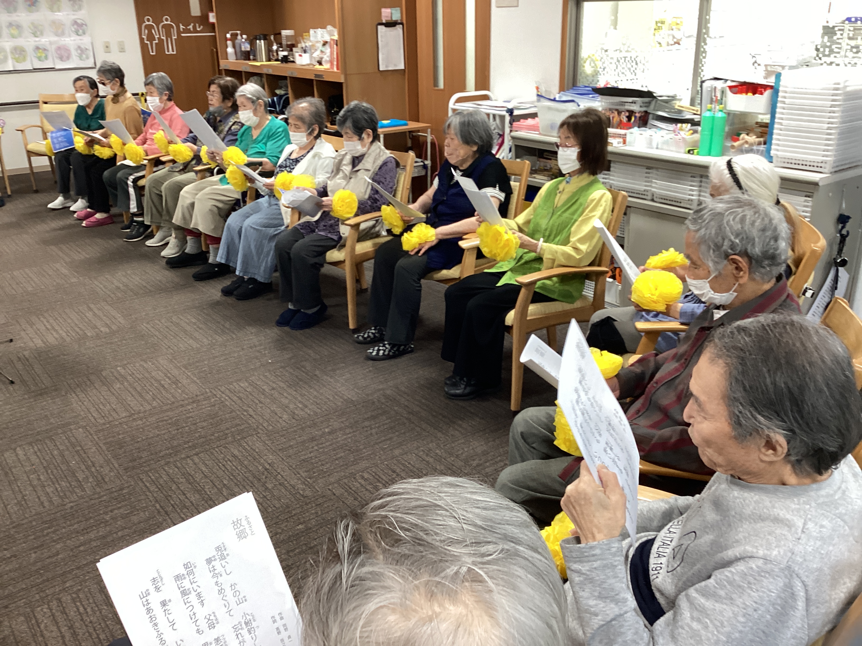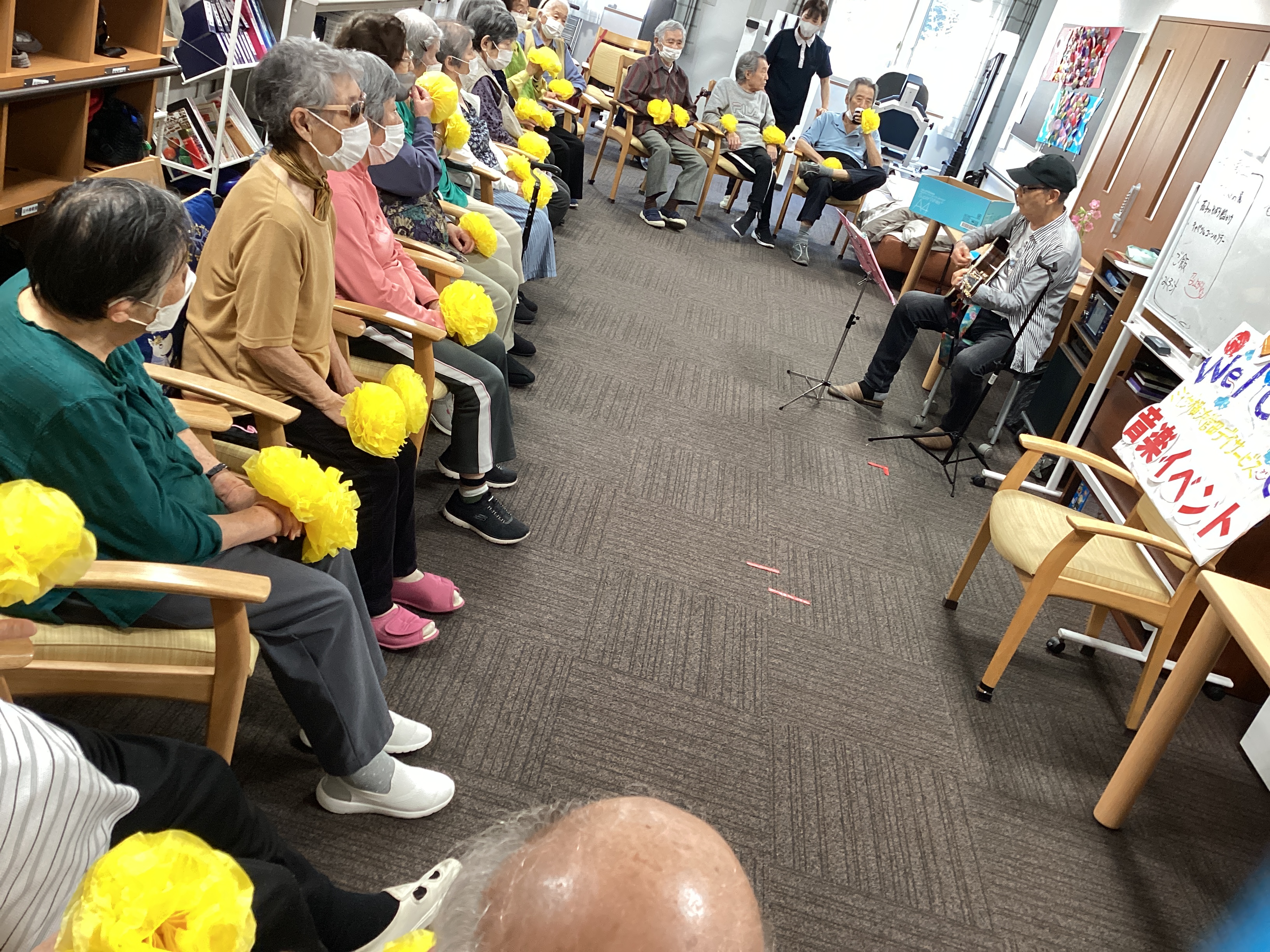 またまた横浜菅田にギターおじさんが来てくださいました。 最後に、ハーモニカが吹けるご利用者も伴奏に加わり 皆さんで「故郷」、「みかんの花咲く丘」、「夏は来ぬ」を大合唱しました。