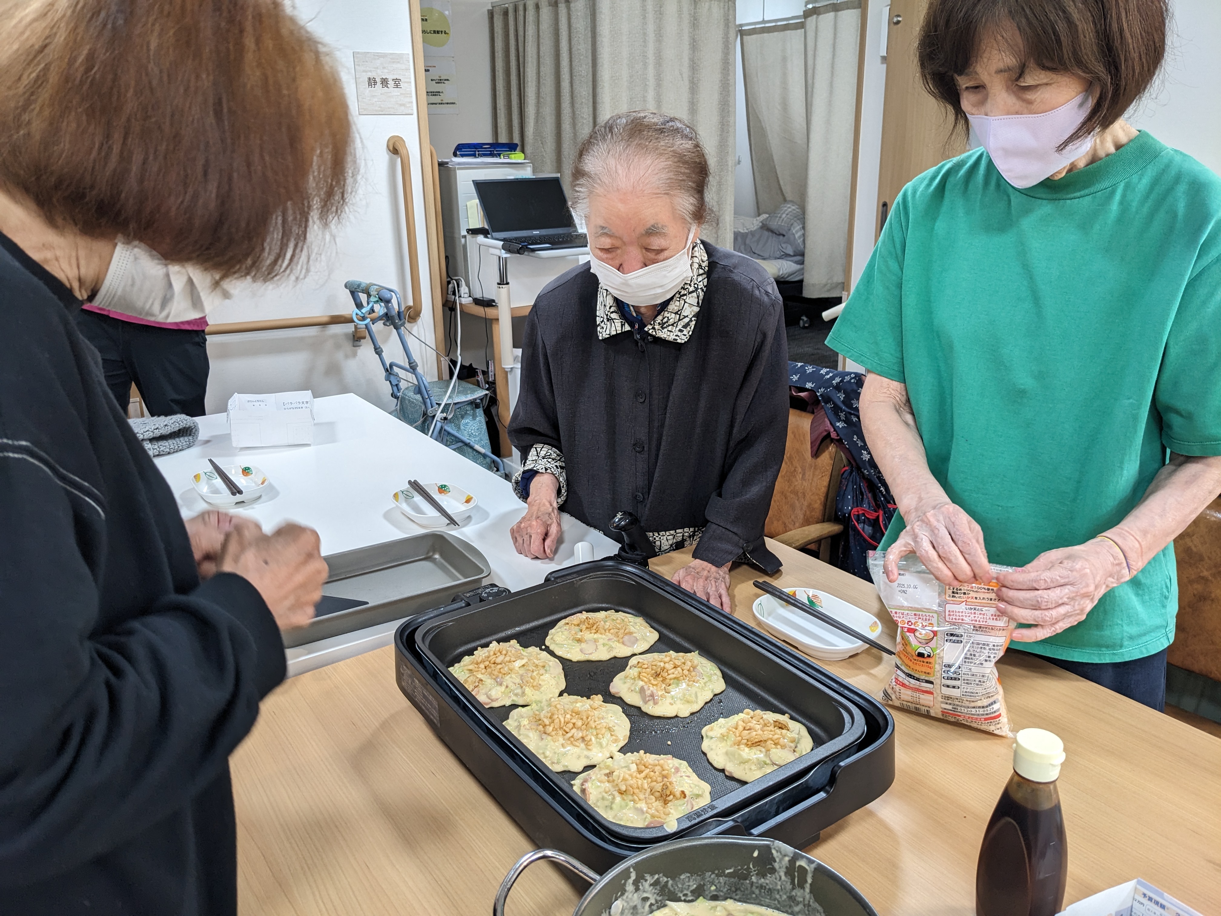 あらかじめ職員がタネを作っておき、利用者の皆様にホットプレートで焼いていただきました。