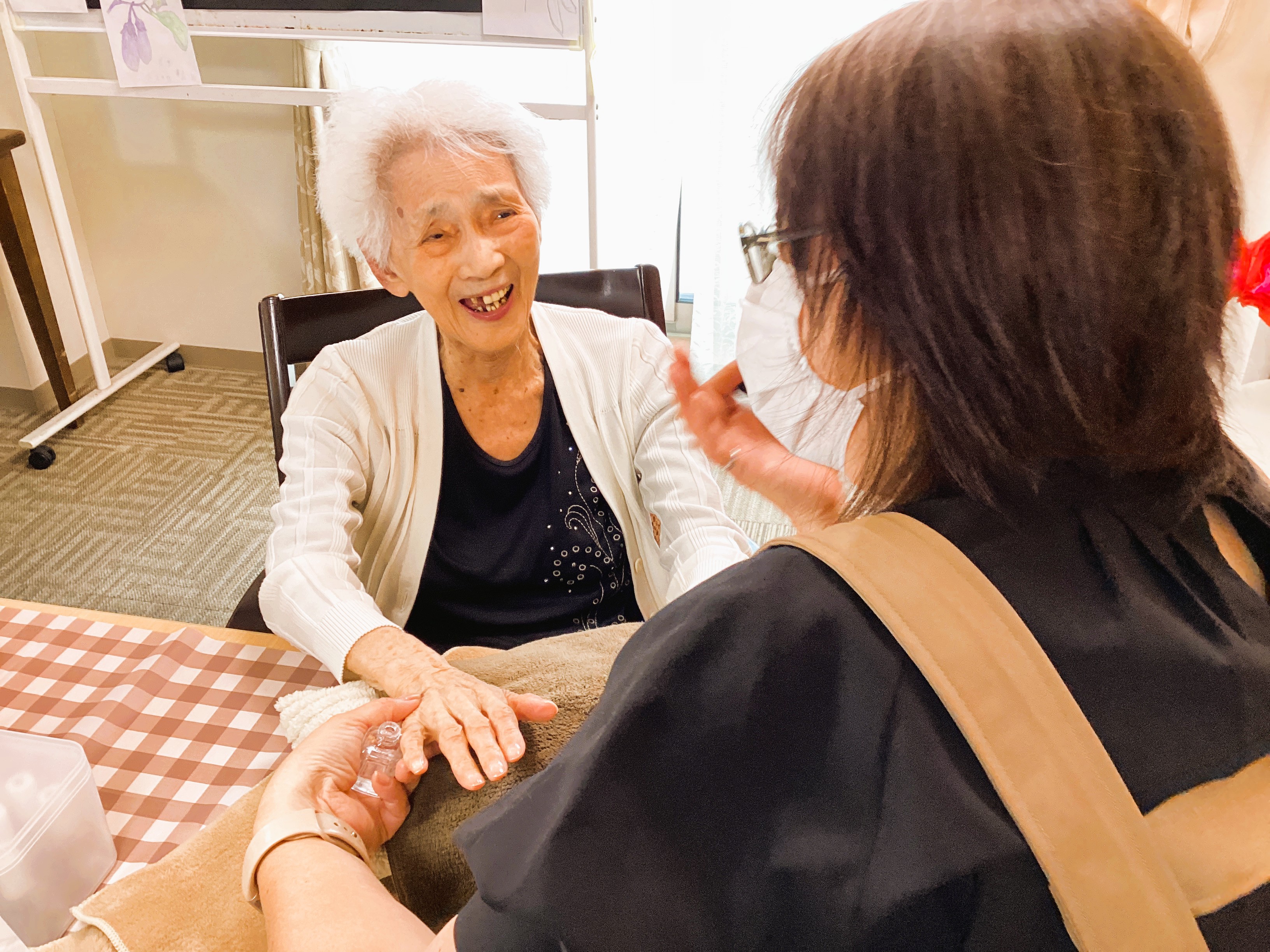 ほのかなアロマの香りに包まれて手を取り合いお話をしながら ご利用者様の希望に沿ったネイルを施術して頂きました✨ プロの手腕に職員もうっとり、、まさに癒しと美、笑顔溢れるサロン体験☆ 私もやってもらいたいっ!!