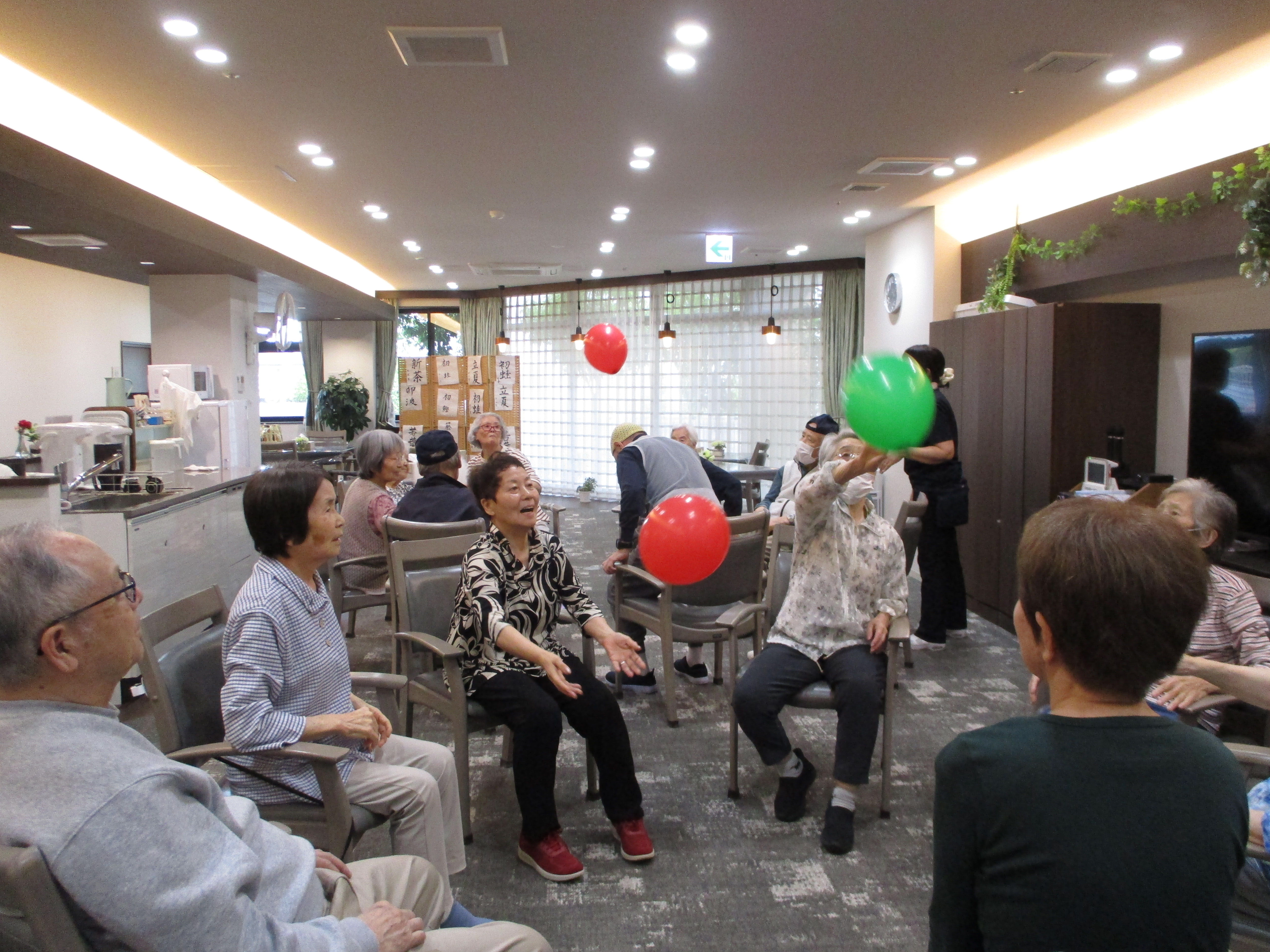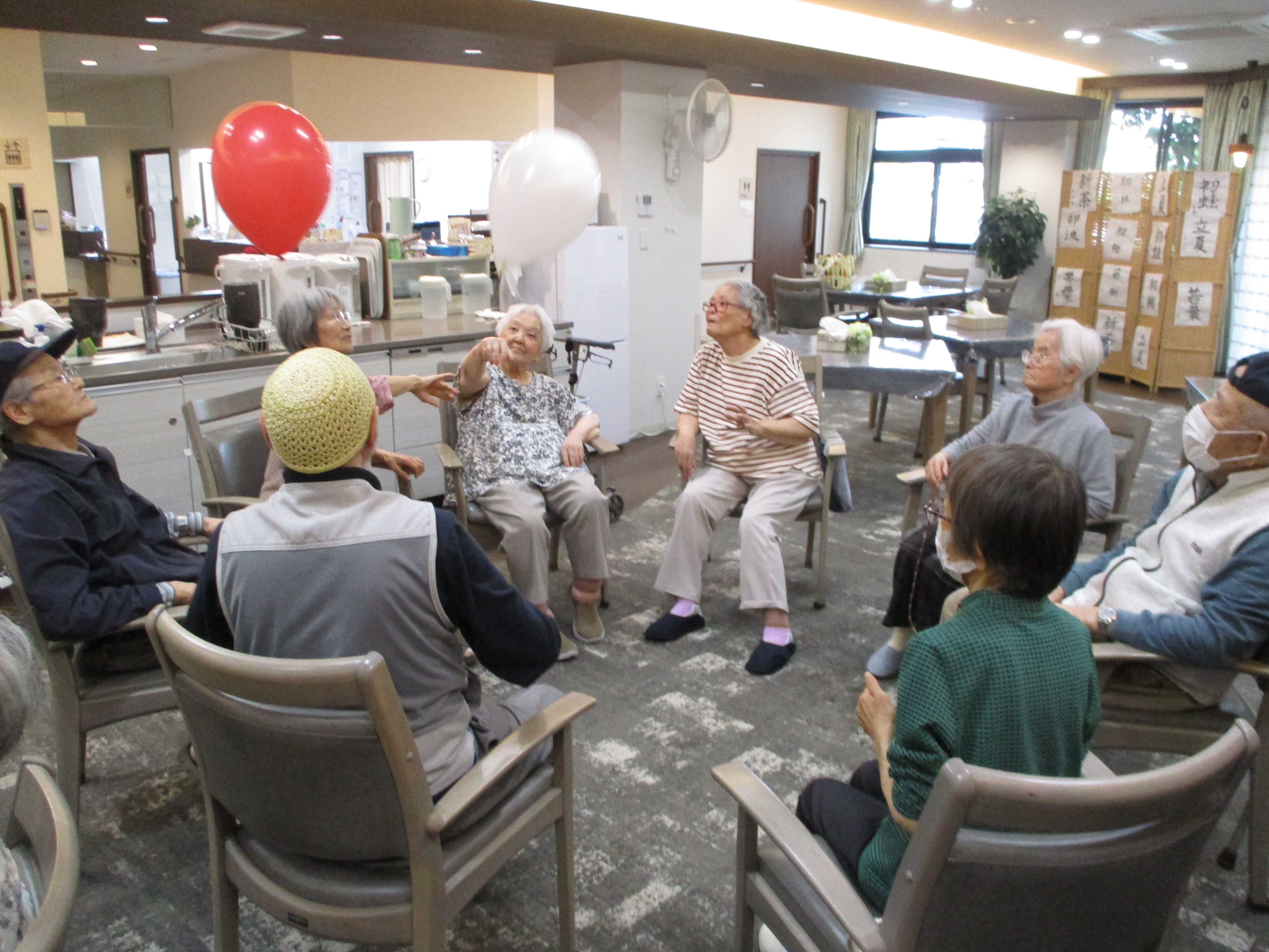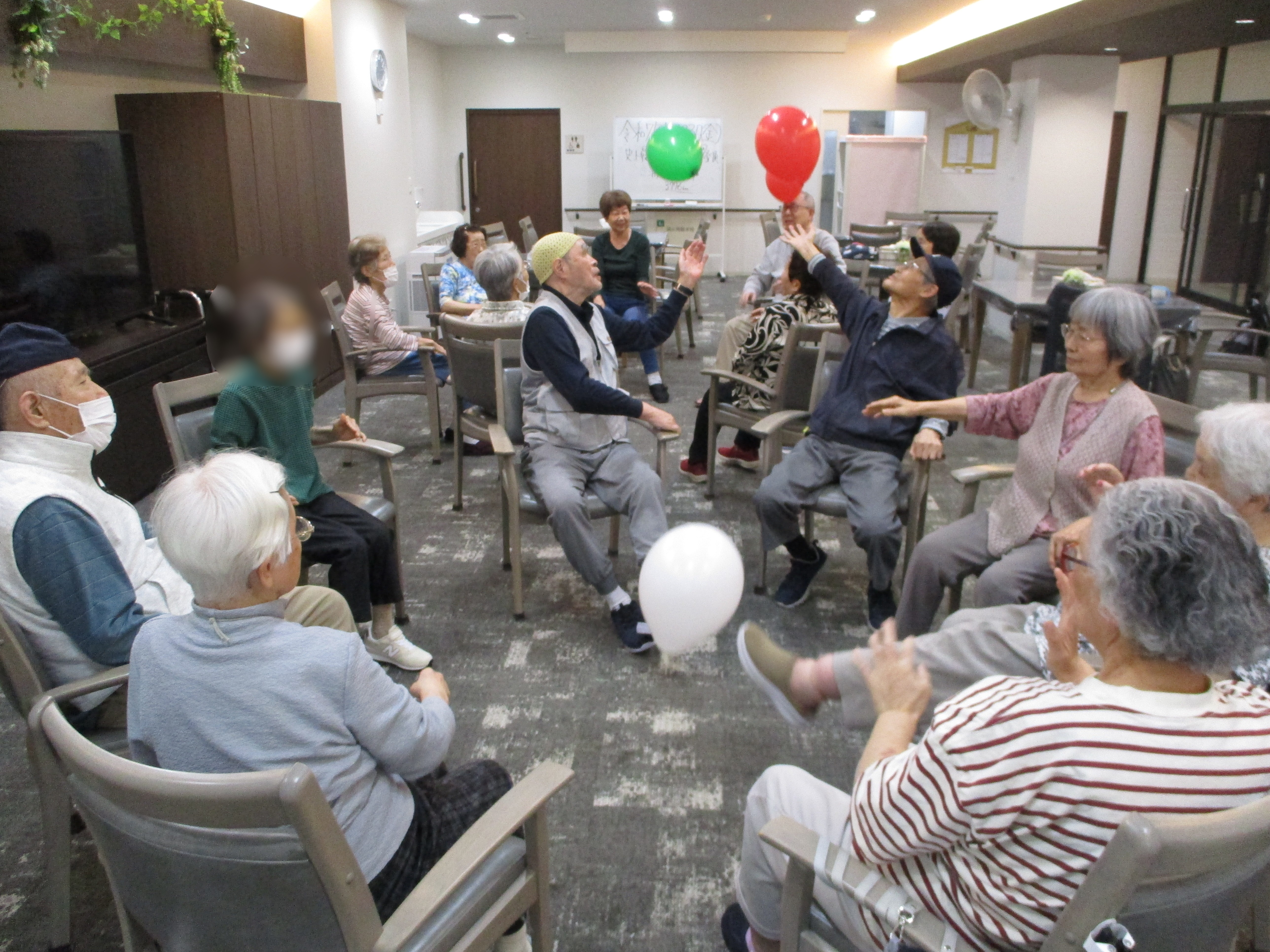 今日は風船バレーの日でした。大変多くのご入居者の方々にご参加いただき盛り上がっています。普段使わない筋肉も動かしながら大盛り上がり!最近は1つの風船では物足りず3つの風船が宙を飛び交っています。