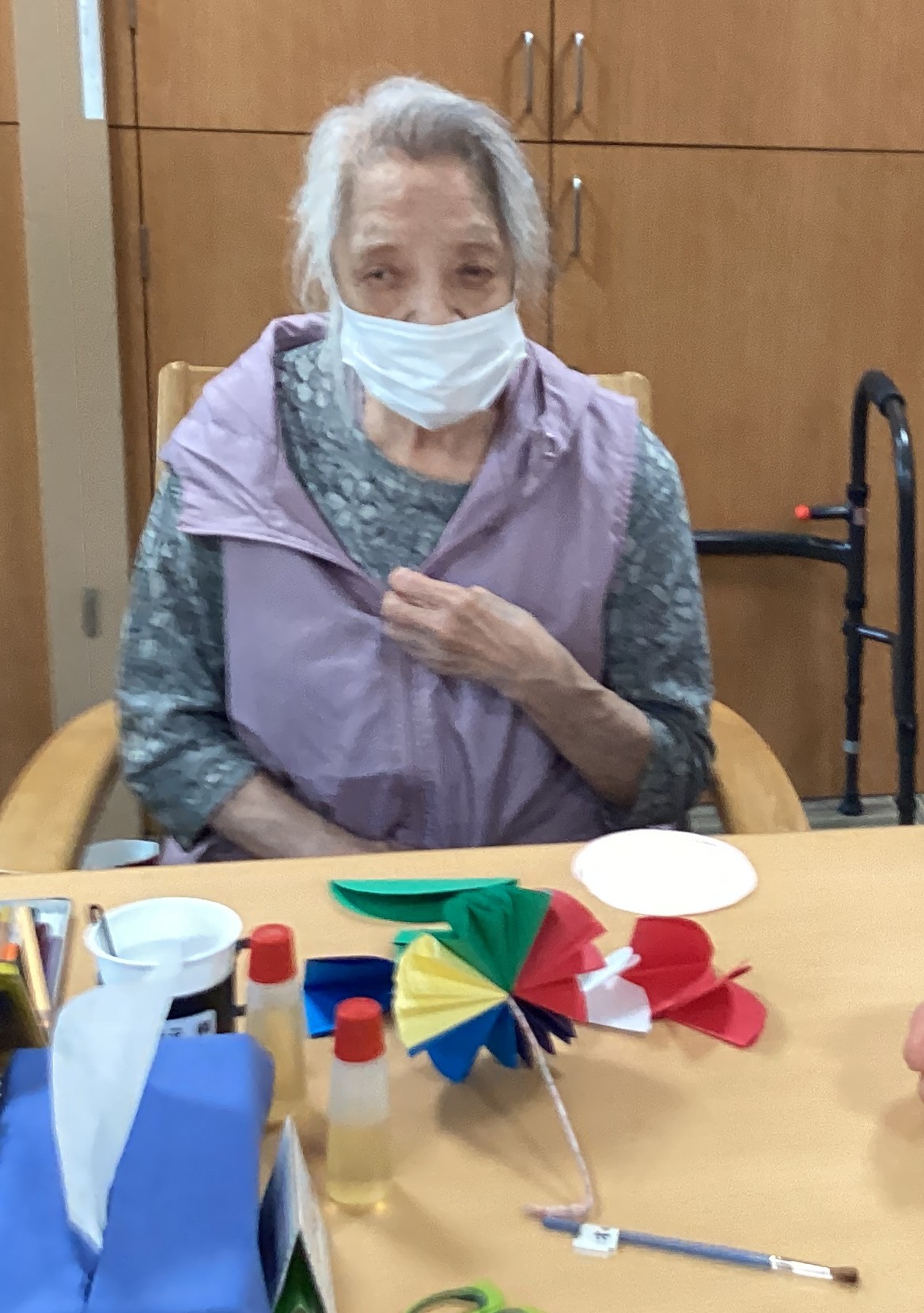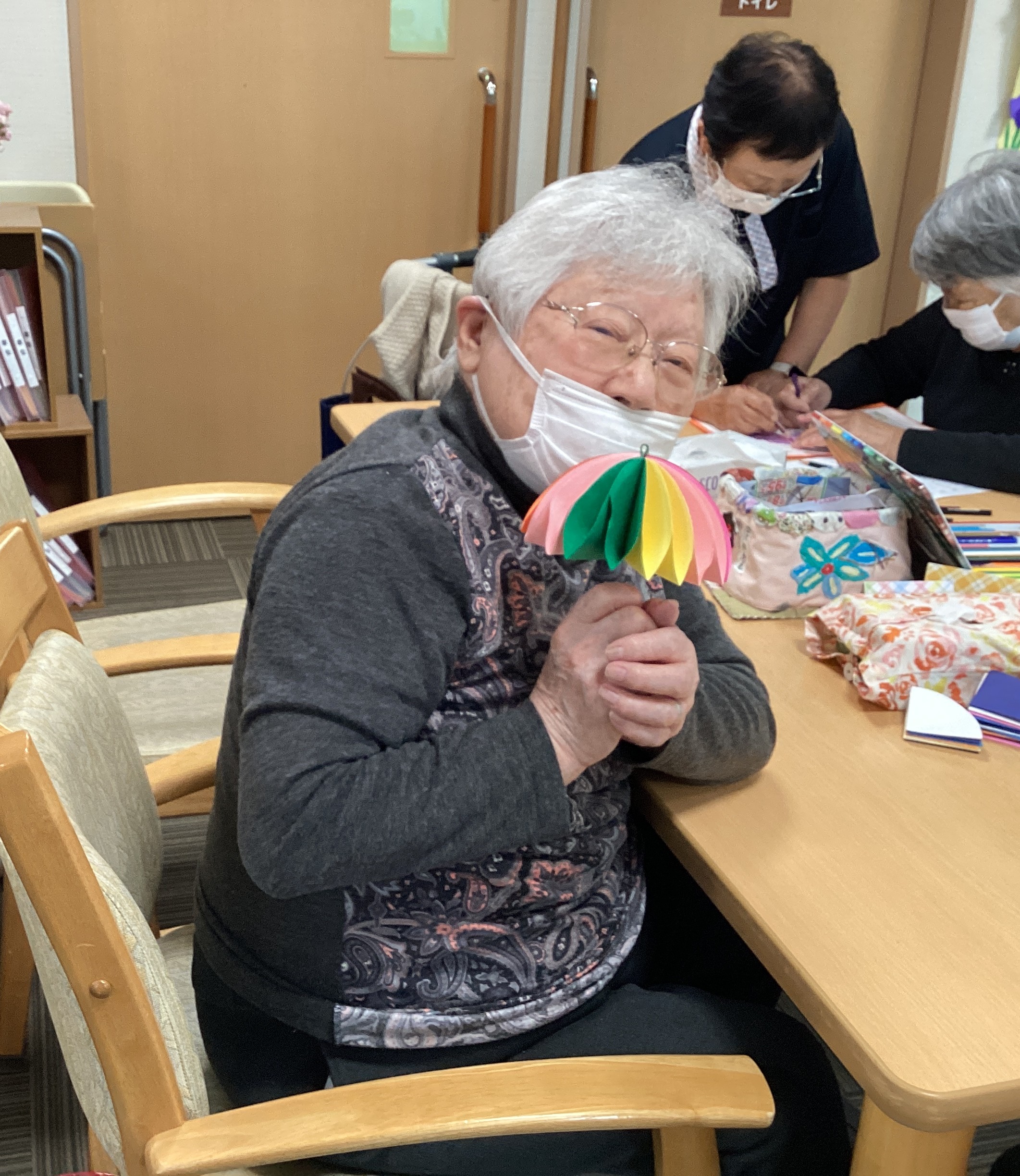 色画用紙でカラフルな傘をたくさん作りました。持って帰りたいというリクエストが続出するくらい皆さんに喜んでもらえました。