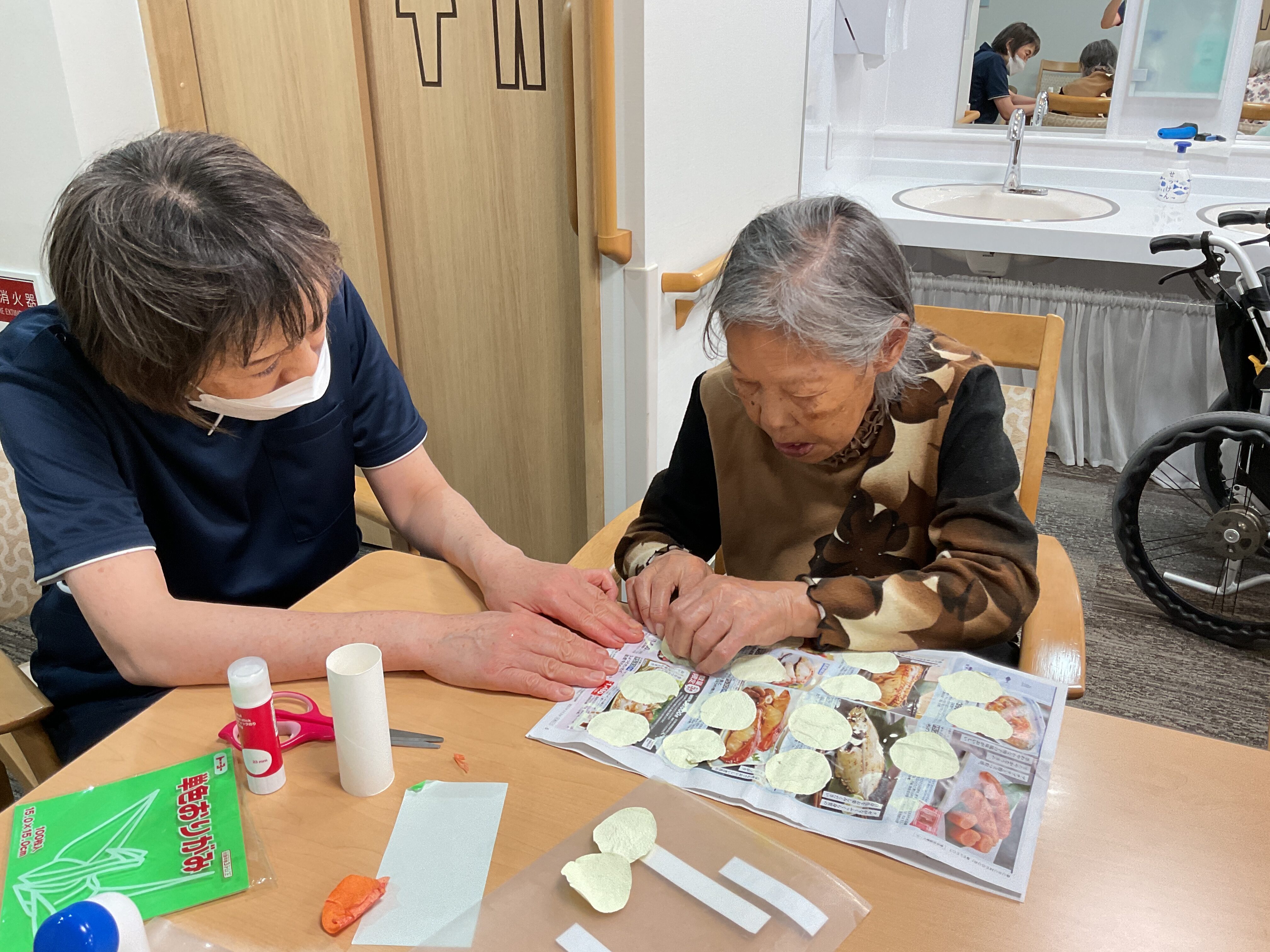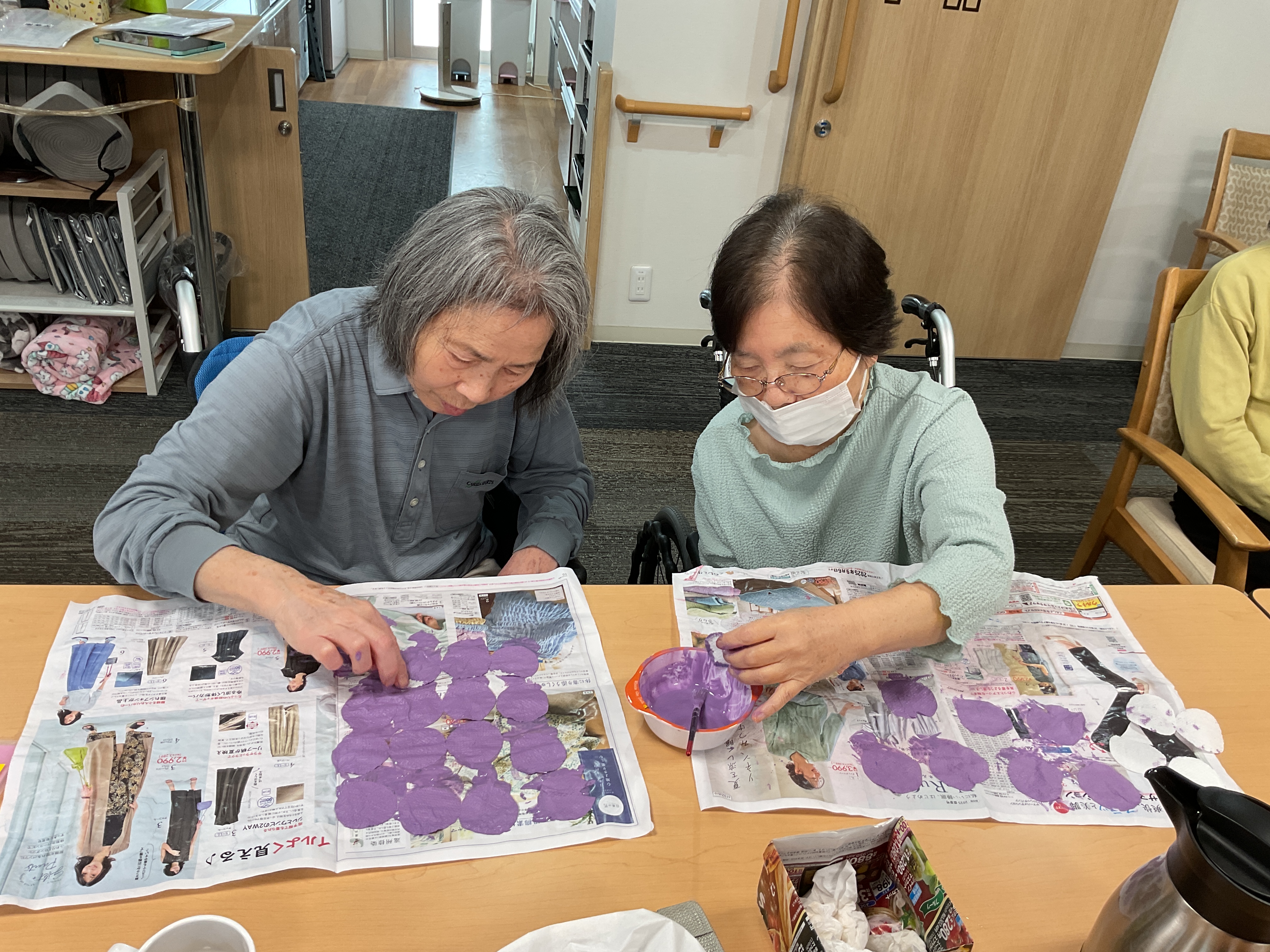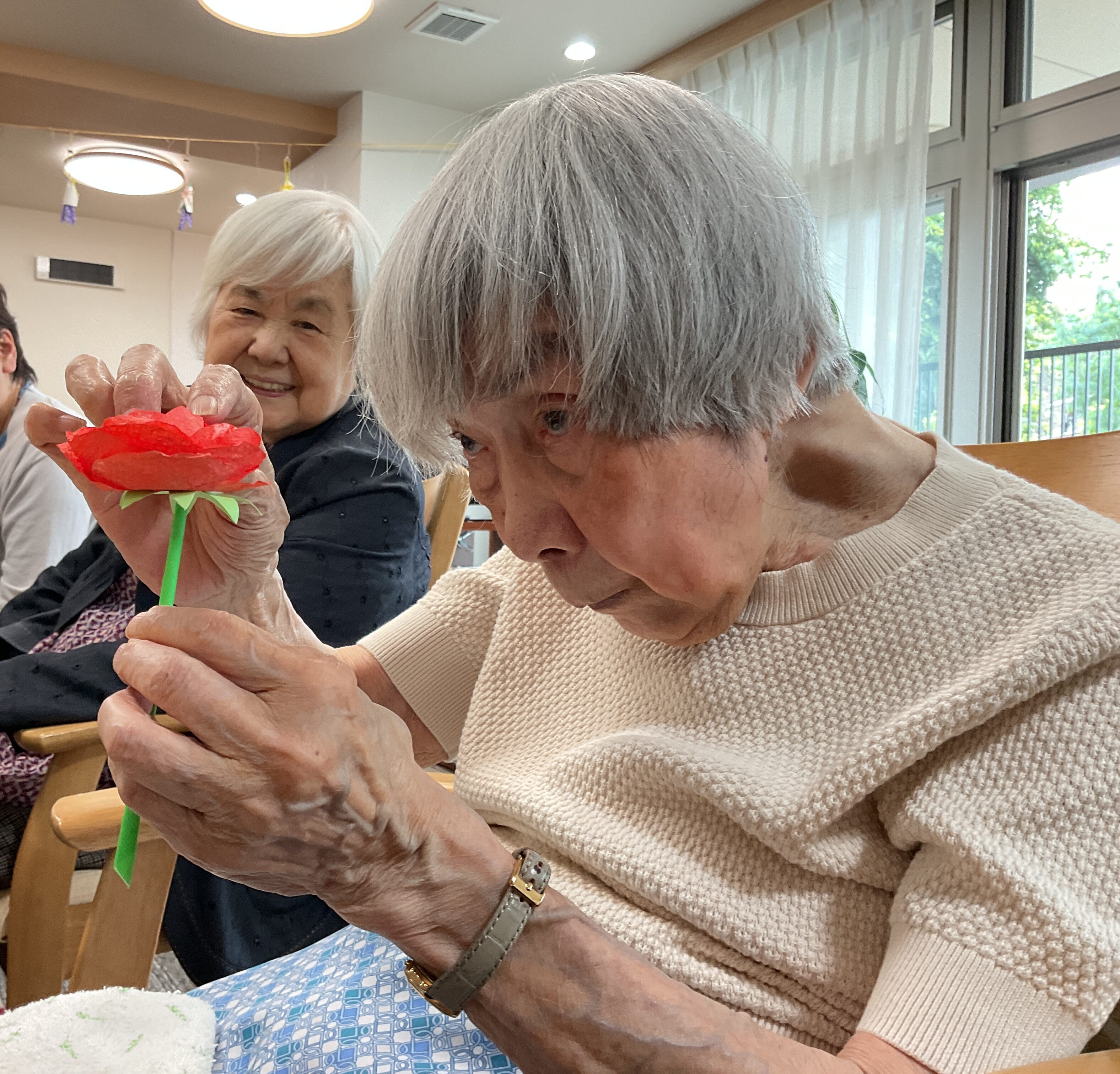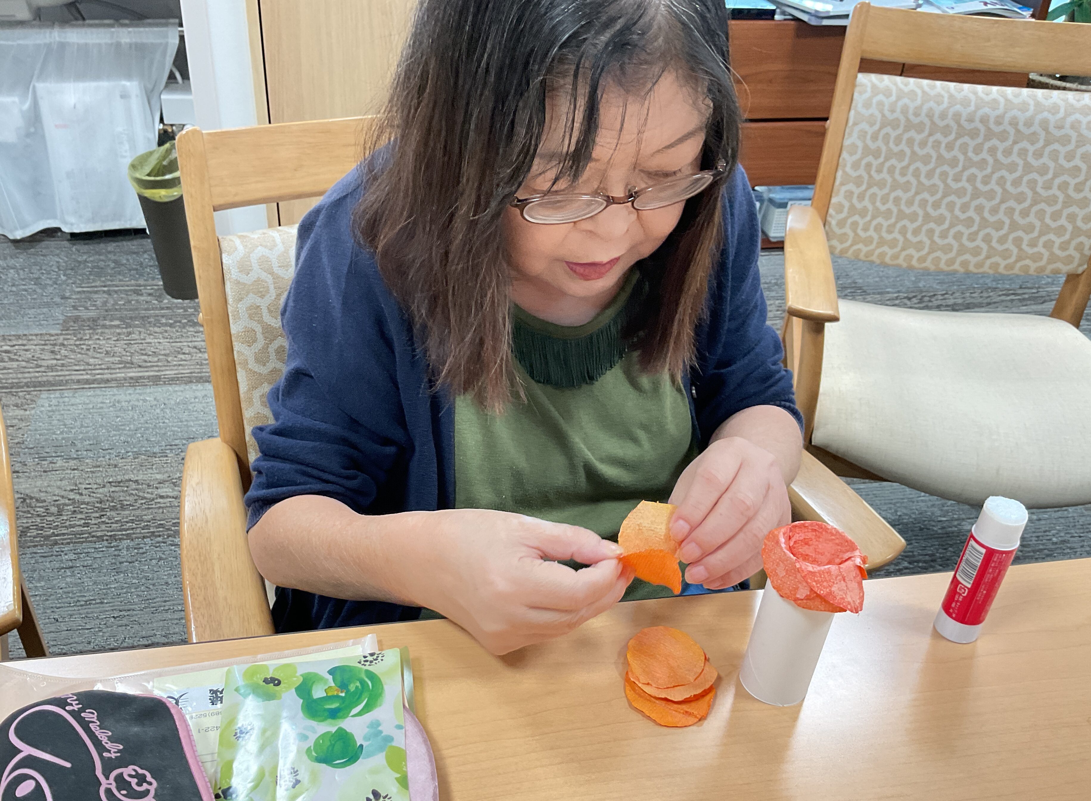 この綺麗でかわいい花束は本物そっくりですが、実はなんとキッチンペーパーで作った手作りのものです!絵具で花弁一枚一枚染色し、トイレットペーパーの芯に少しずつずらしながら貼り付けていきます。作業を進めていくとどんどん上達し皆様職人並みの腕前です!