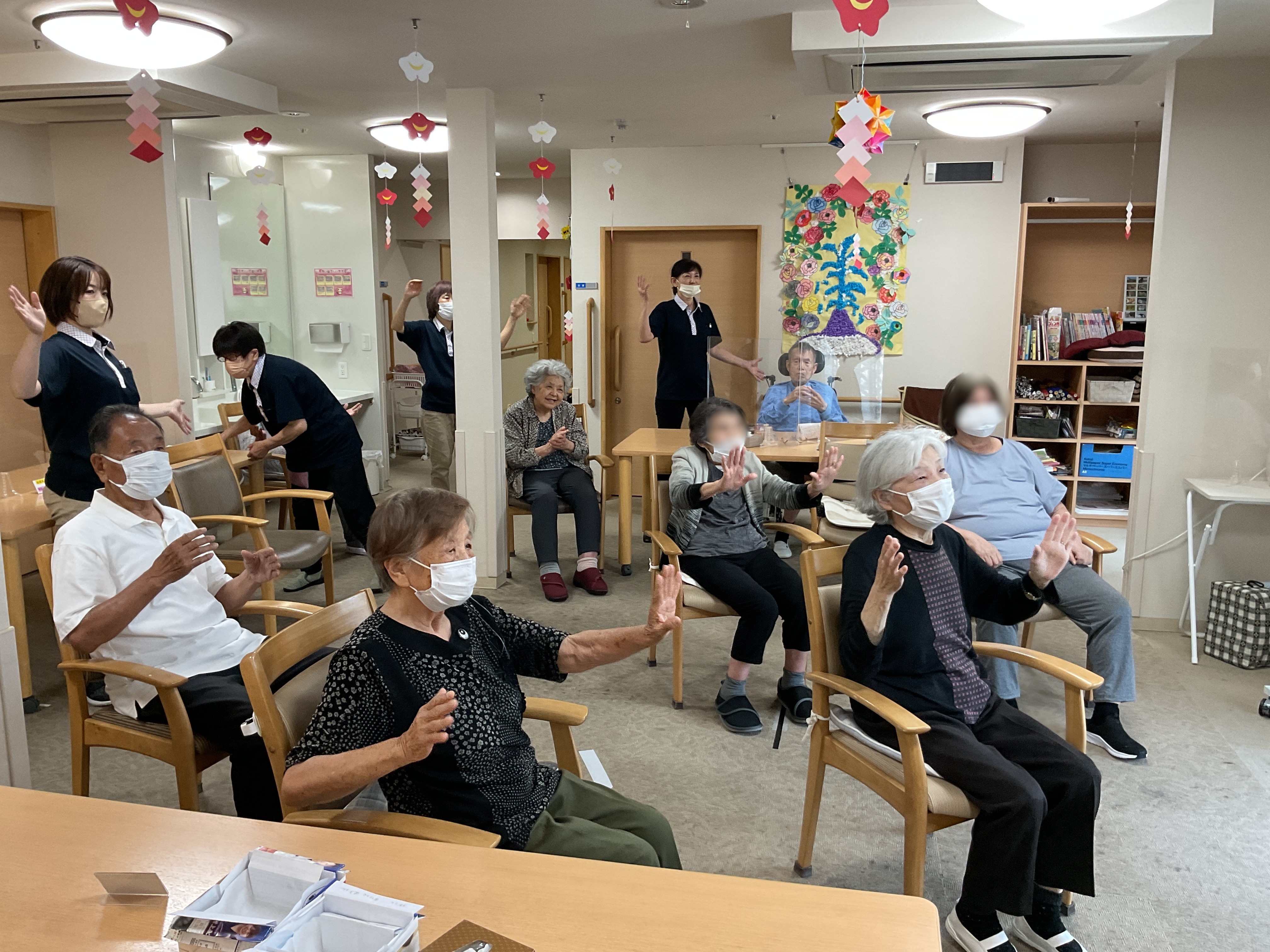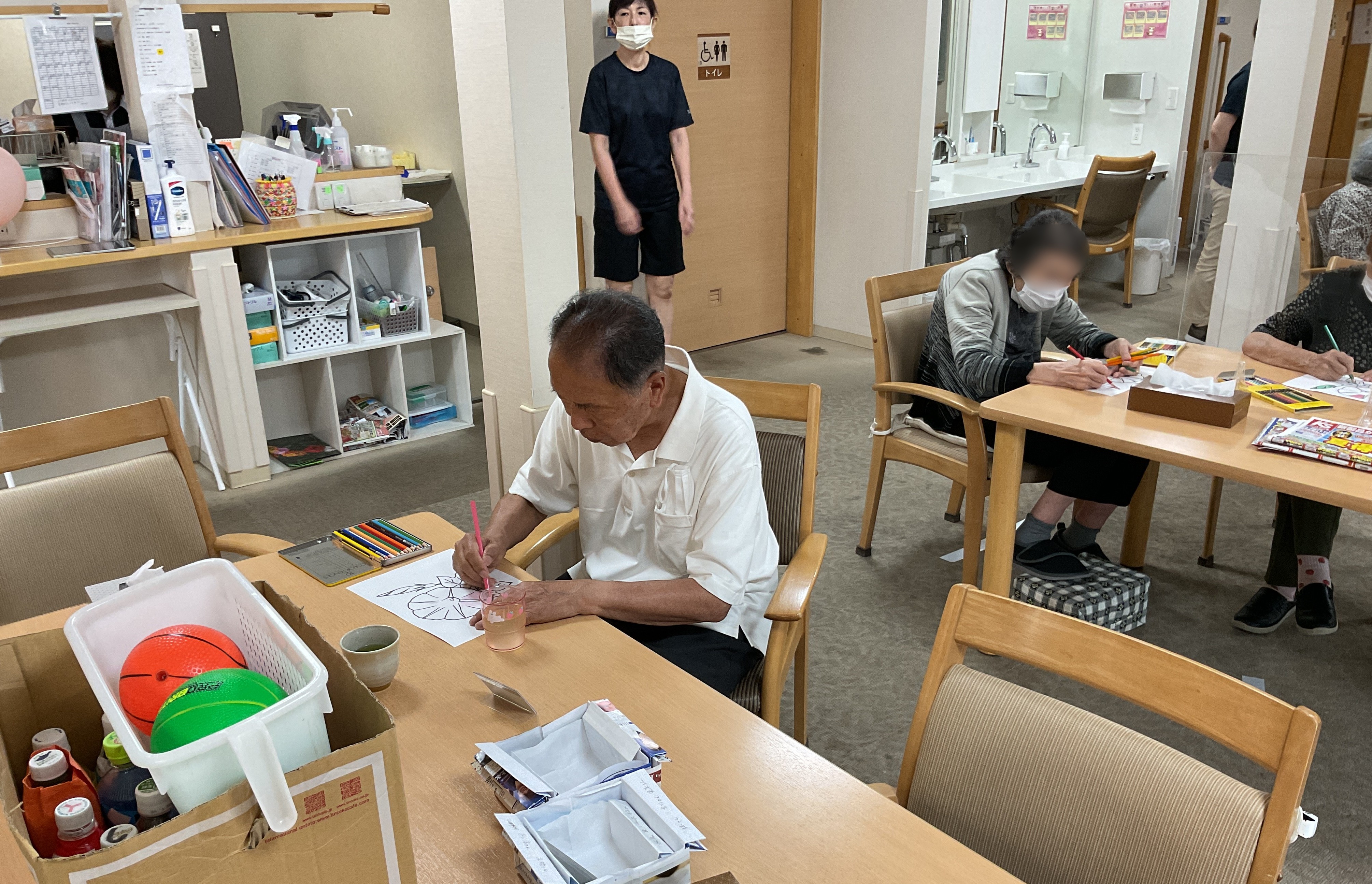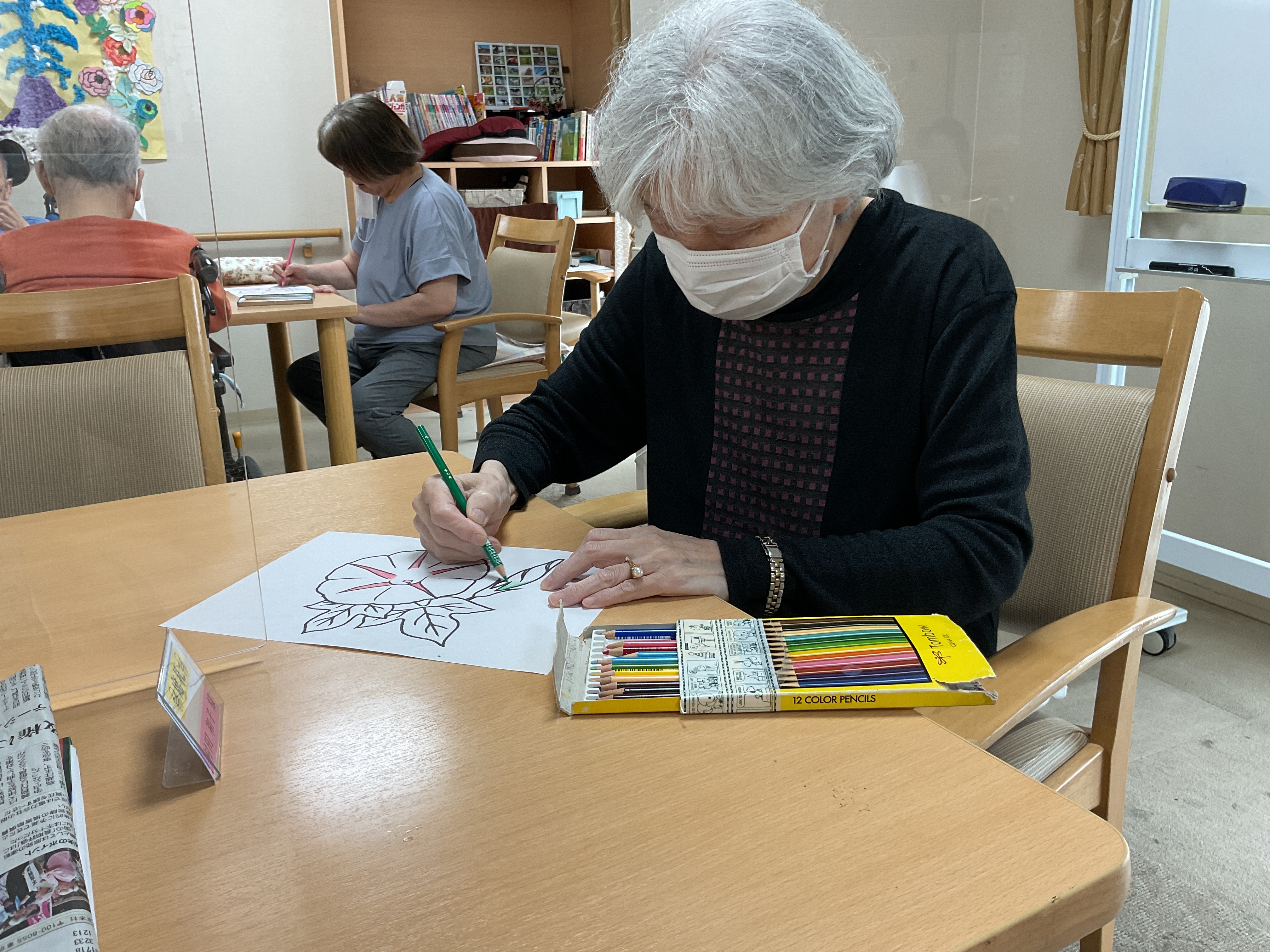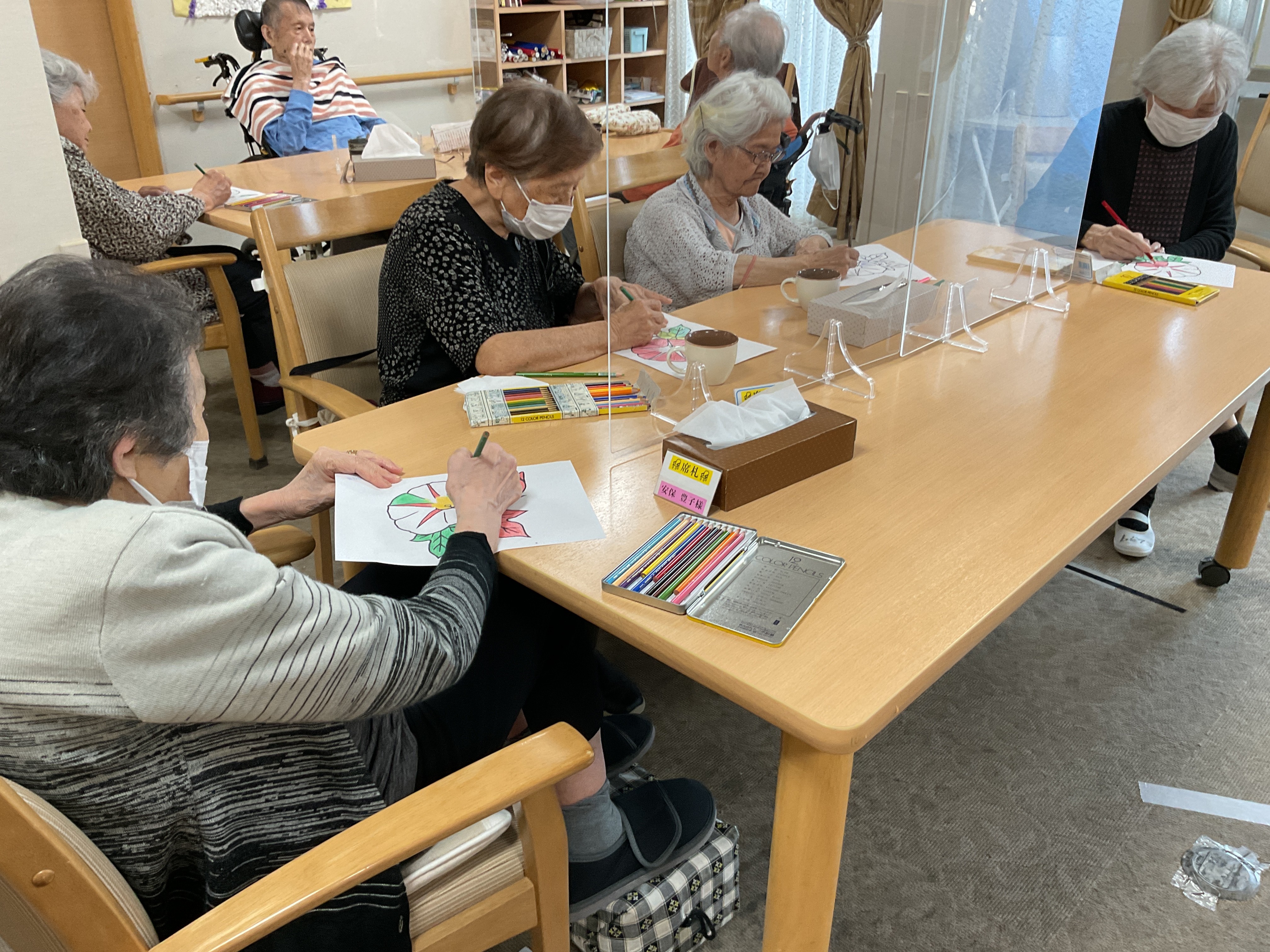 朝顔の塗り絵を、思い思いの色で塗っておられます。みなさん本当にお上手ですし、集中力がすごい!