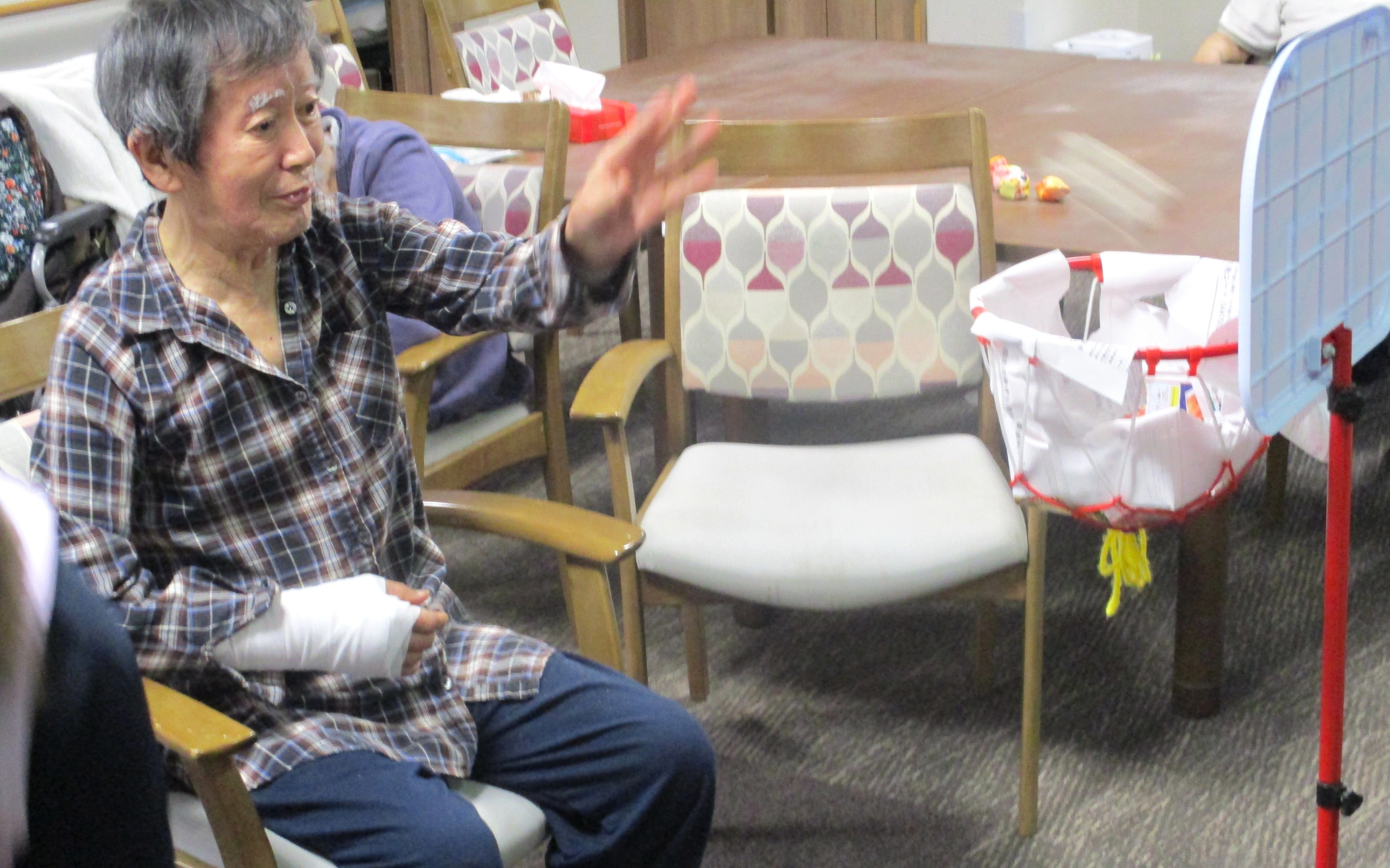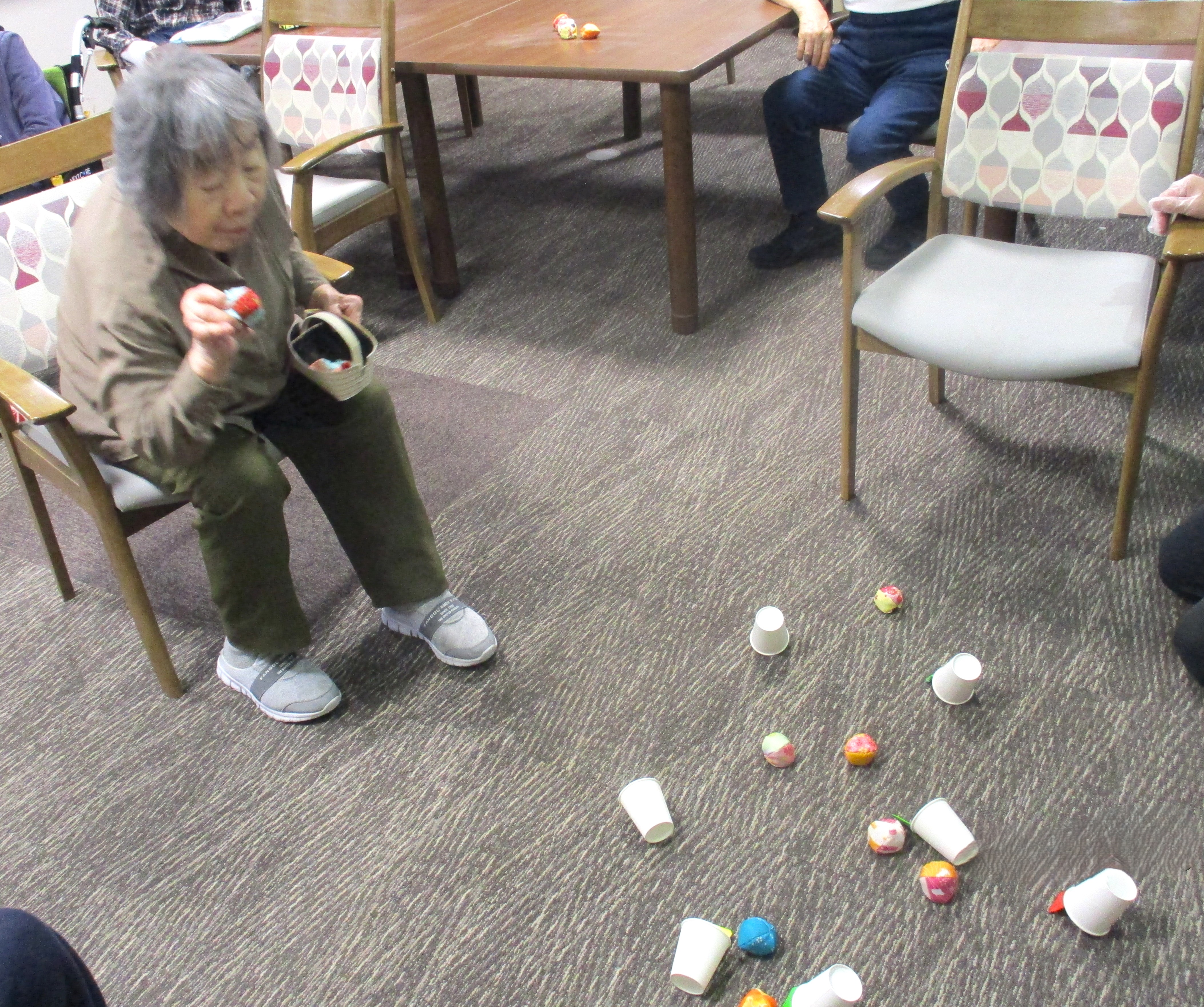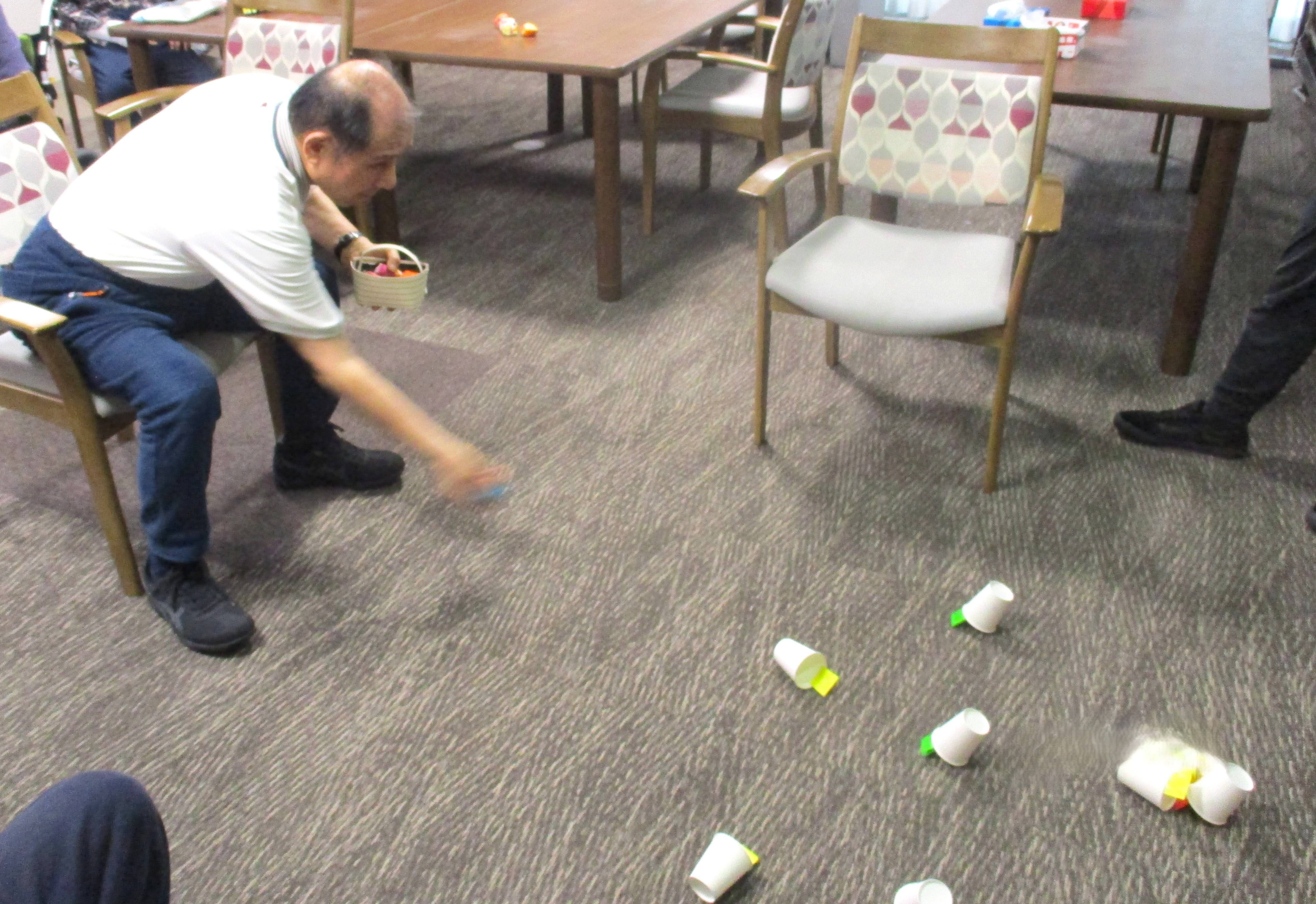 床に置いた紙コップやゴールに向かってボールを投げて点数を競うゲームをしました⭐ 皆様、とても楽しまれていました🥎