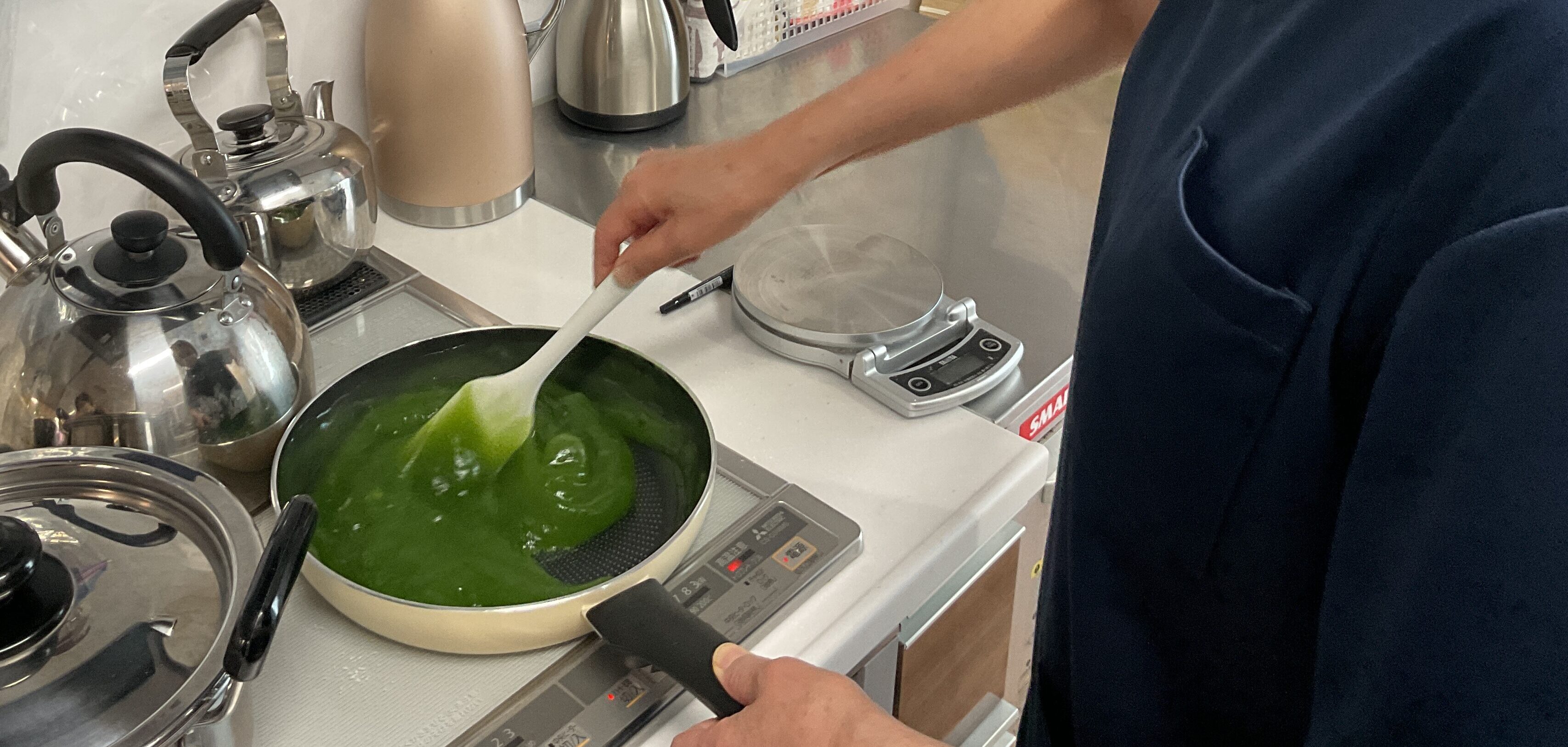 今日は水まんじゅうを作ってみました。主な材料は片栗粉です!片栗粉に抹茶、砂糖、水を入れ火にかけるとだんだん粘りが出てきます。それをラップに落とし丸めたあんこを入れて包みます。冷やしたら出来上がり♡暑い日は冷たいデザートが美味しいですね!
