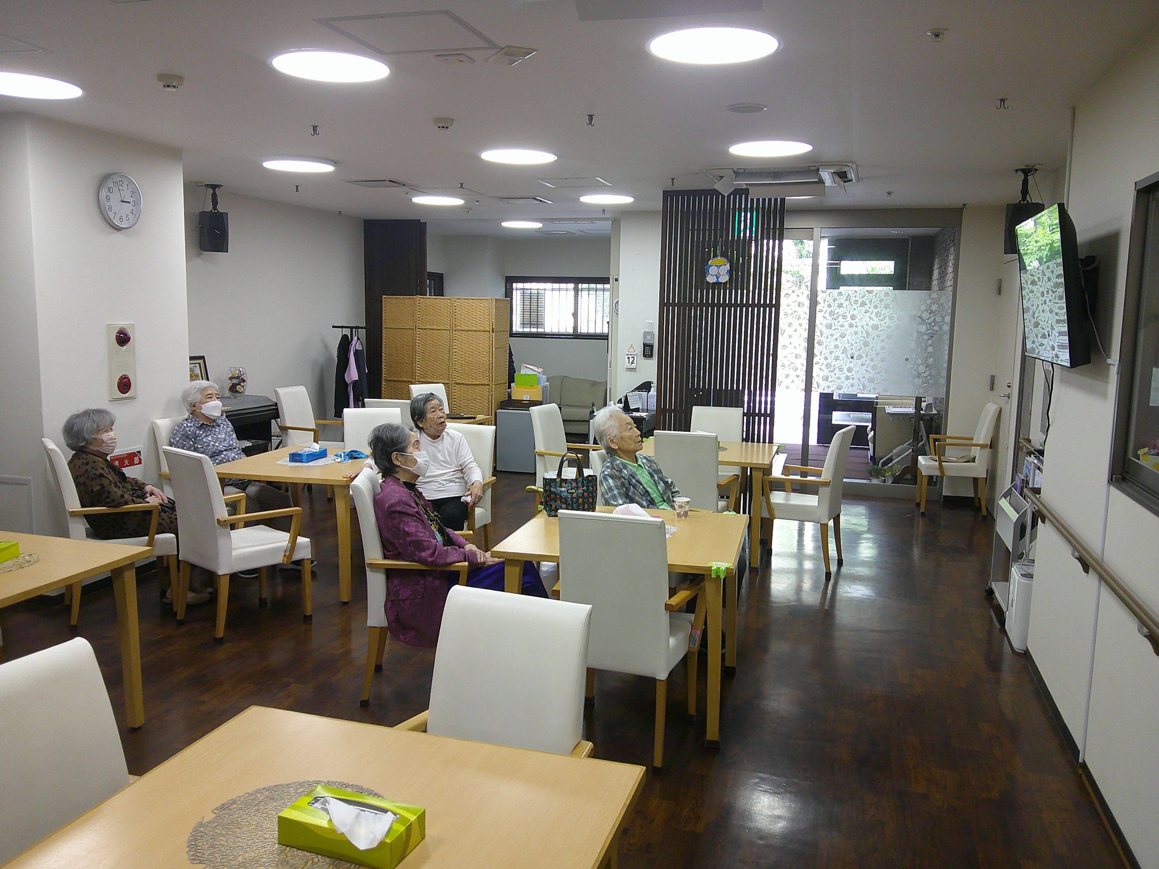 月に一度の「みんなで歌おう」は童謡や唱歌を大きな声で歌うレクリエーションです。 字幕を見ながらジメジメした天気の鬱憤を晴らすかのように元気に歌いました😃 音程がちょっとズレてるのはご愛敬⁉️