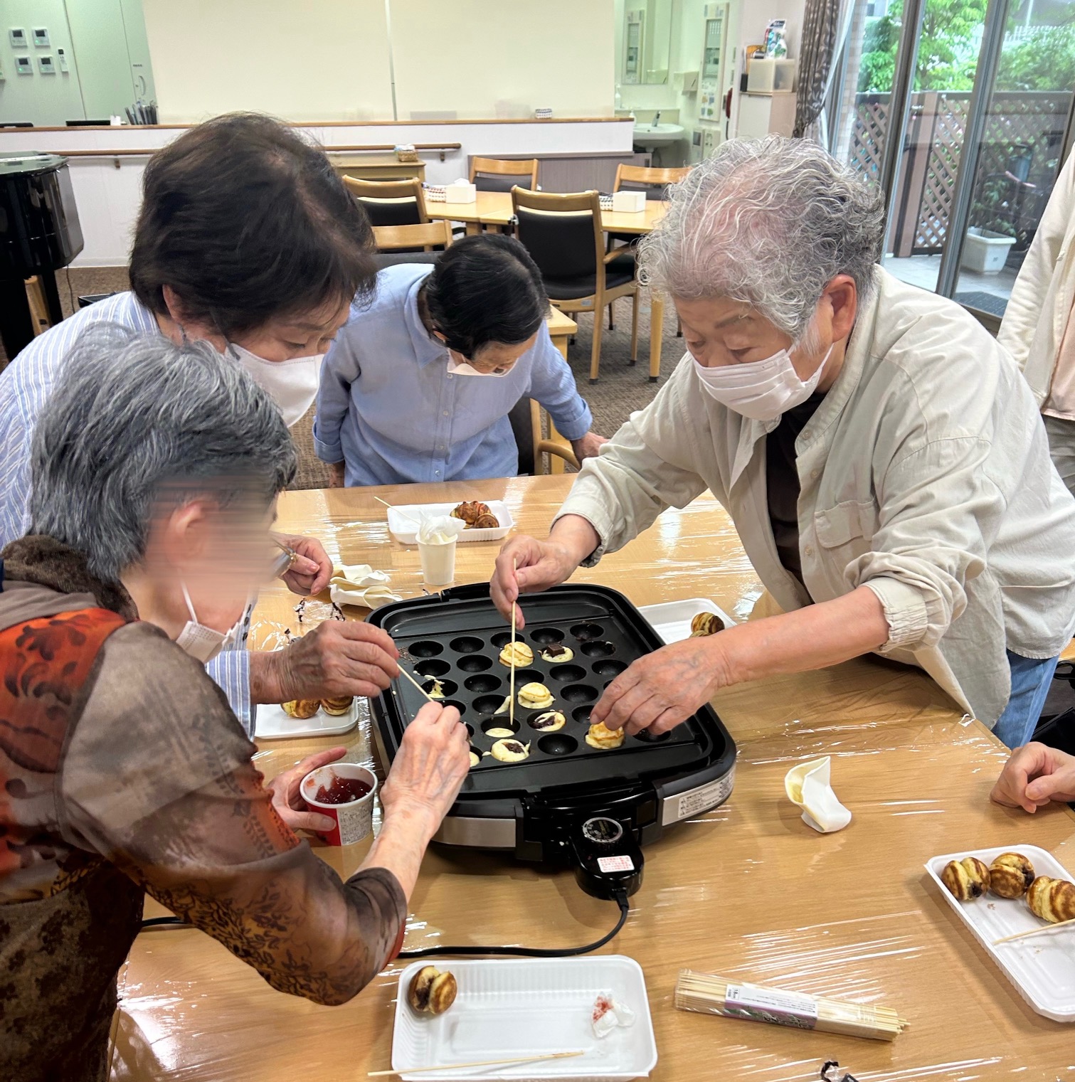 ホットプレートで丸い丸いカステラの中にチョコやあんこやイチゴを詰めて焼き上げました。 コロコロと回して自分好みのカステラに仕上げ美味しく頂きました。