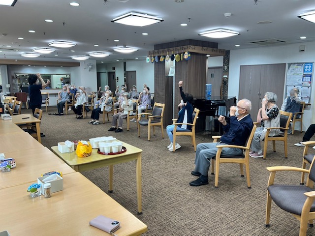毎日10時より30分間行う介護予防体操です。皆様、本当に元気です。 そして、最後は脳トレ体操です。間違っても大丈夫!思い切り笑って体操が終わります。