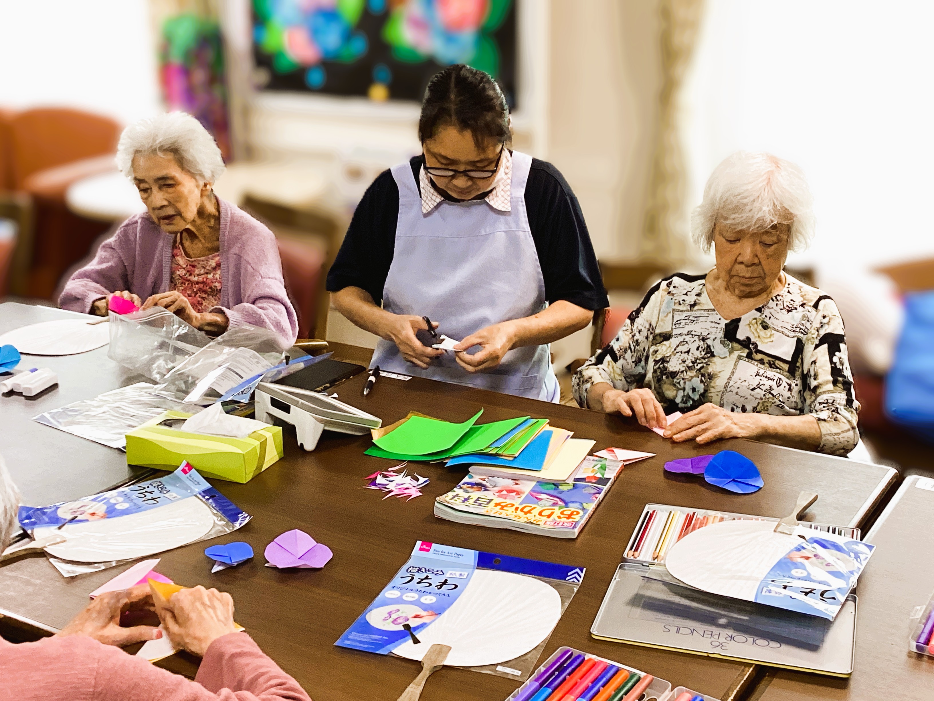 むしむしとうだるような季節ですね💦 そんな時は”うちわ”~♡ でも、、ただのうちわじゃつまらないですよね😀 紫陽花柄のうちわを作ってもらいました♡♡ ご利用者様の好きなお色で制作してもらいました♡ 素敵~(^^♪