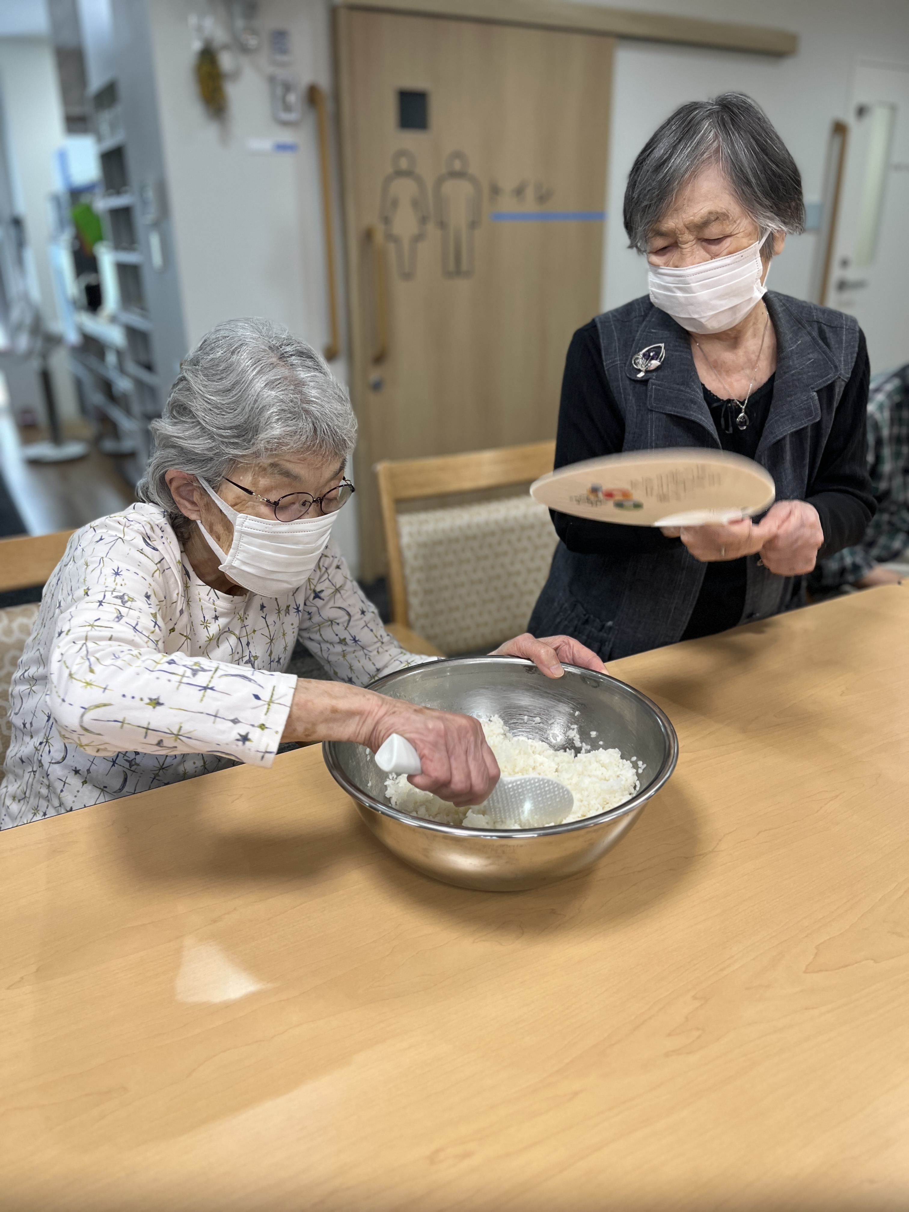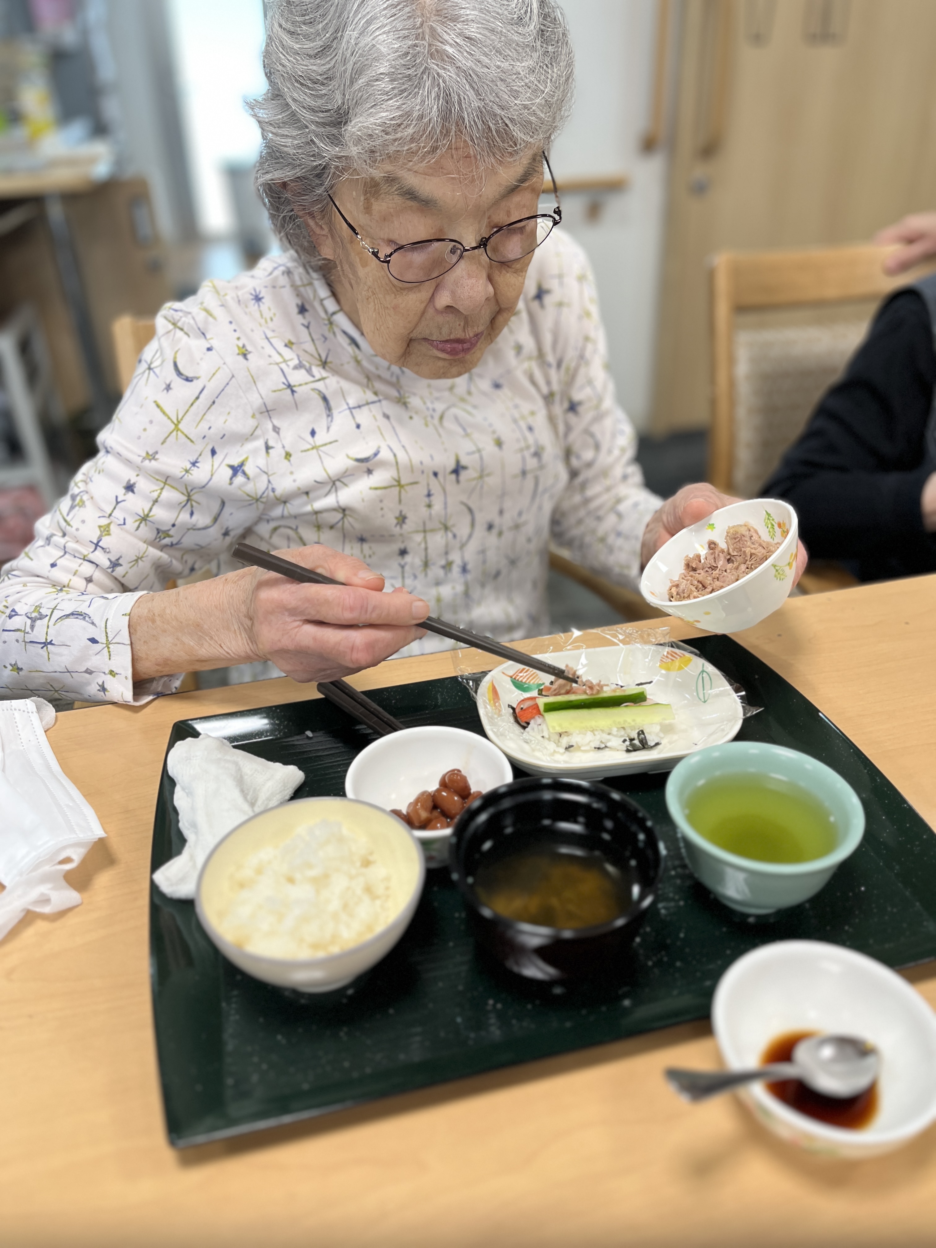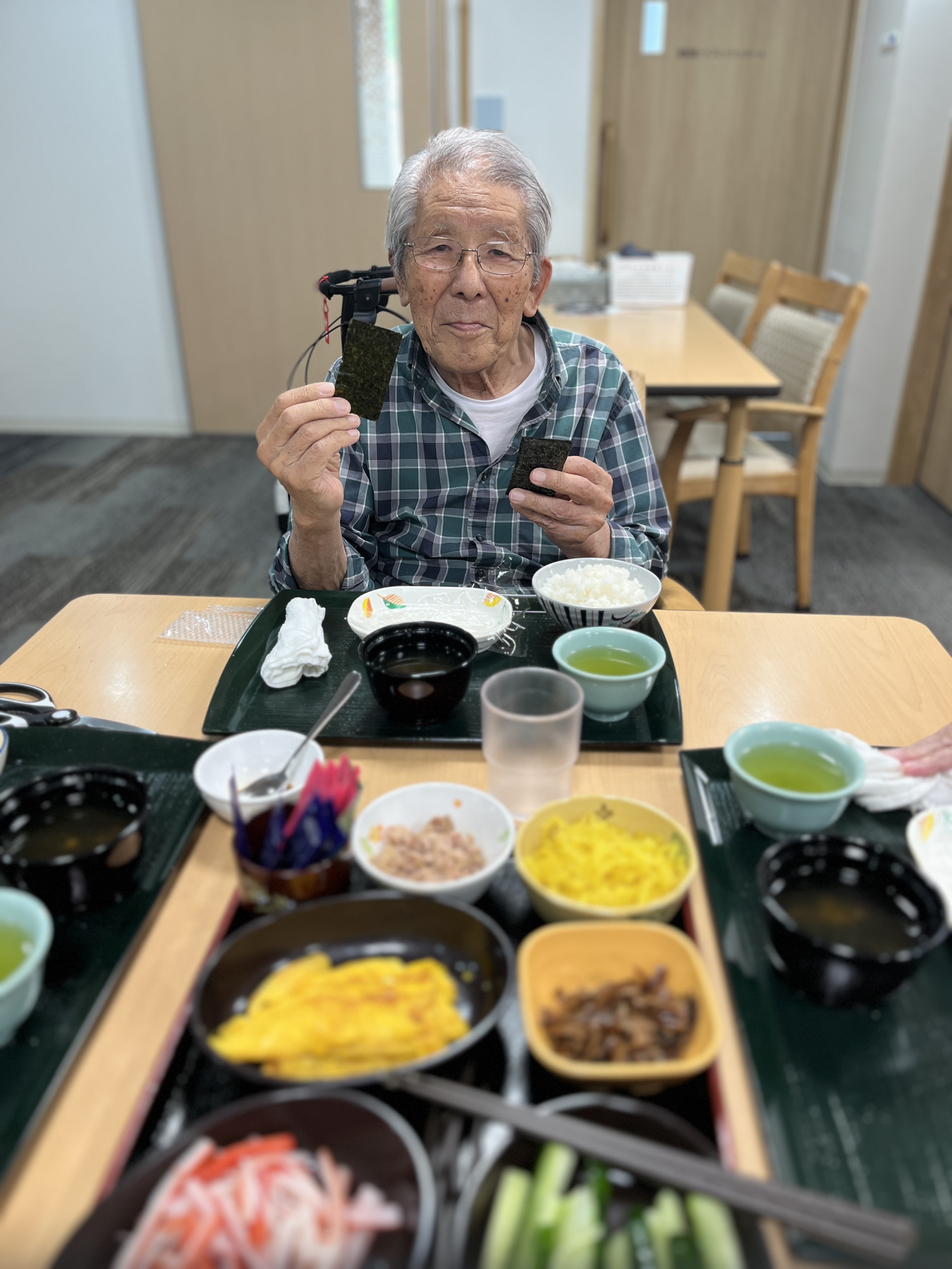今日は父の日でしたので食事レクを行いました!メニューは手巻き寿司です!きゅうり、玉子、ツナ、カニカマ、シイタケ・・・などいろんな具材を用意しご自身で巻いて食べていただきました。やっぱり暑い季節は酢飯が美味しい!美味しくて食欲が止まりません!