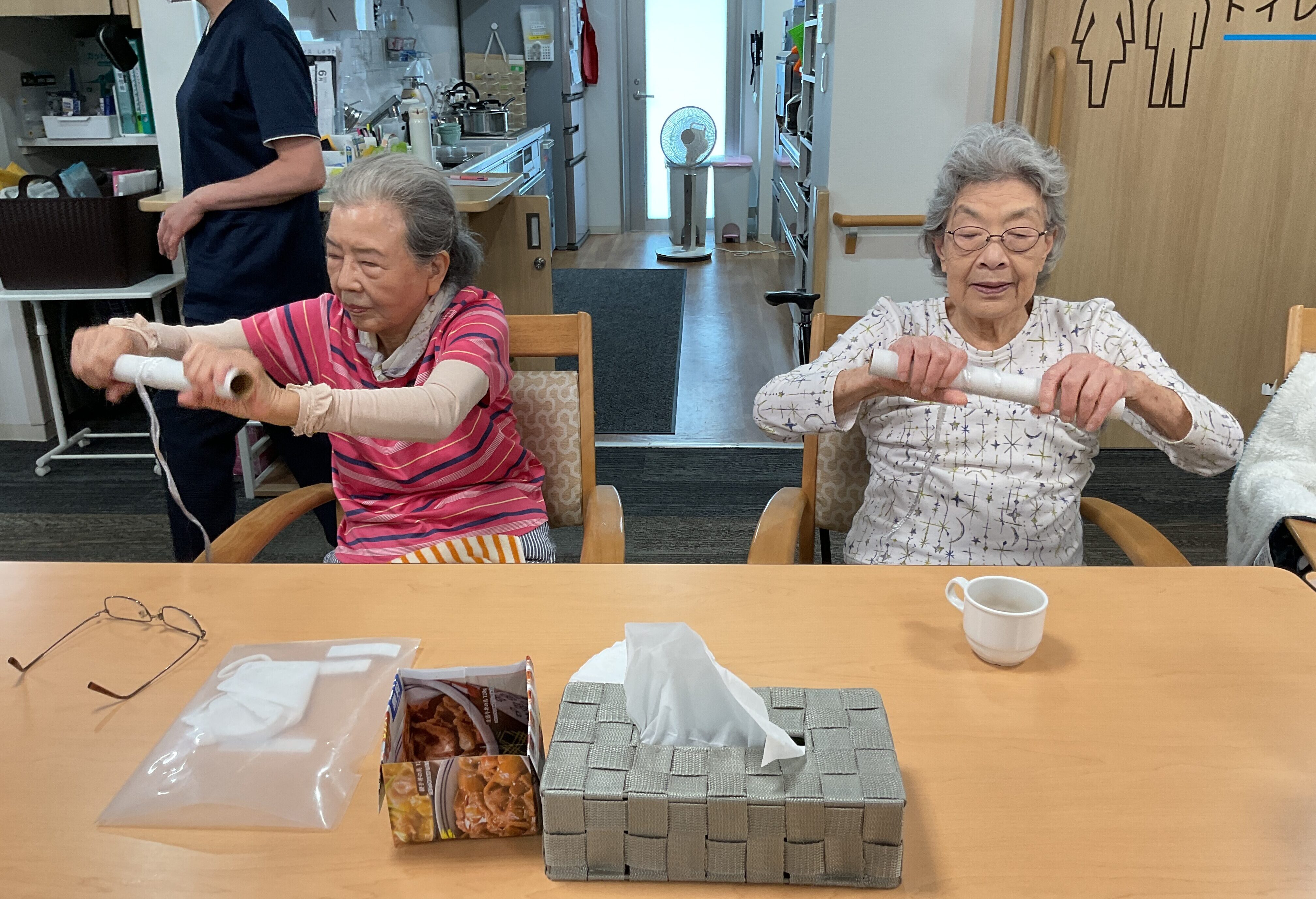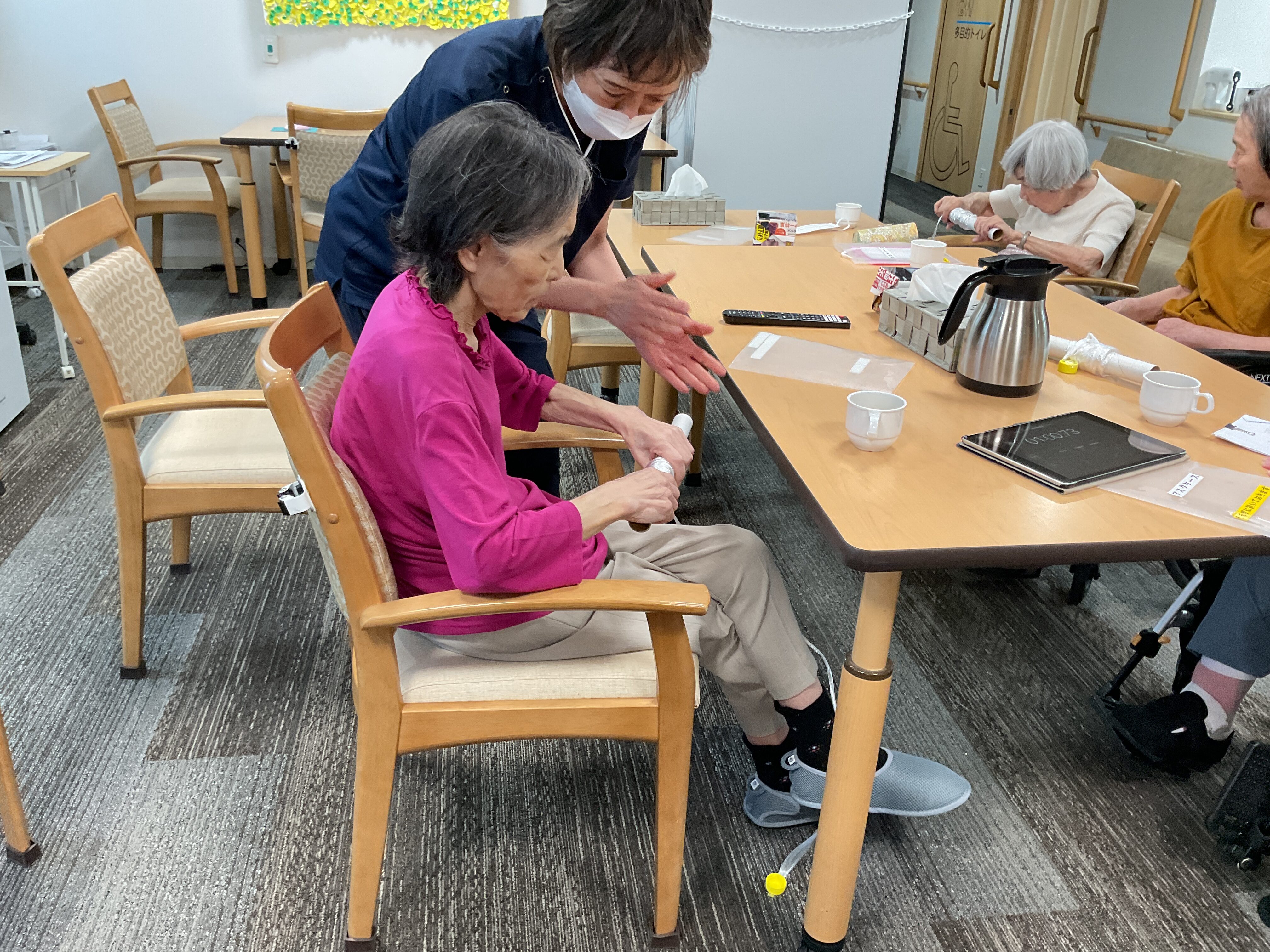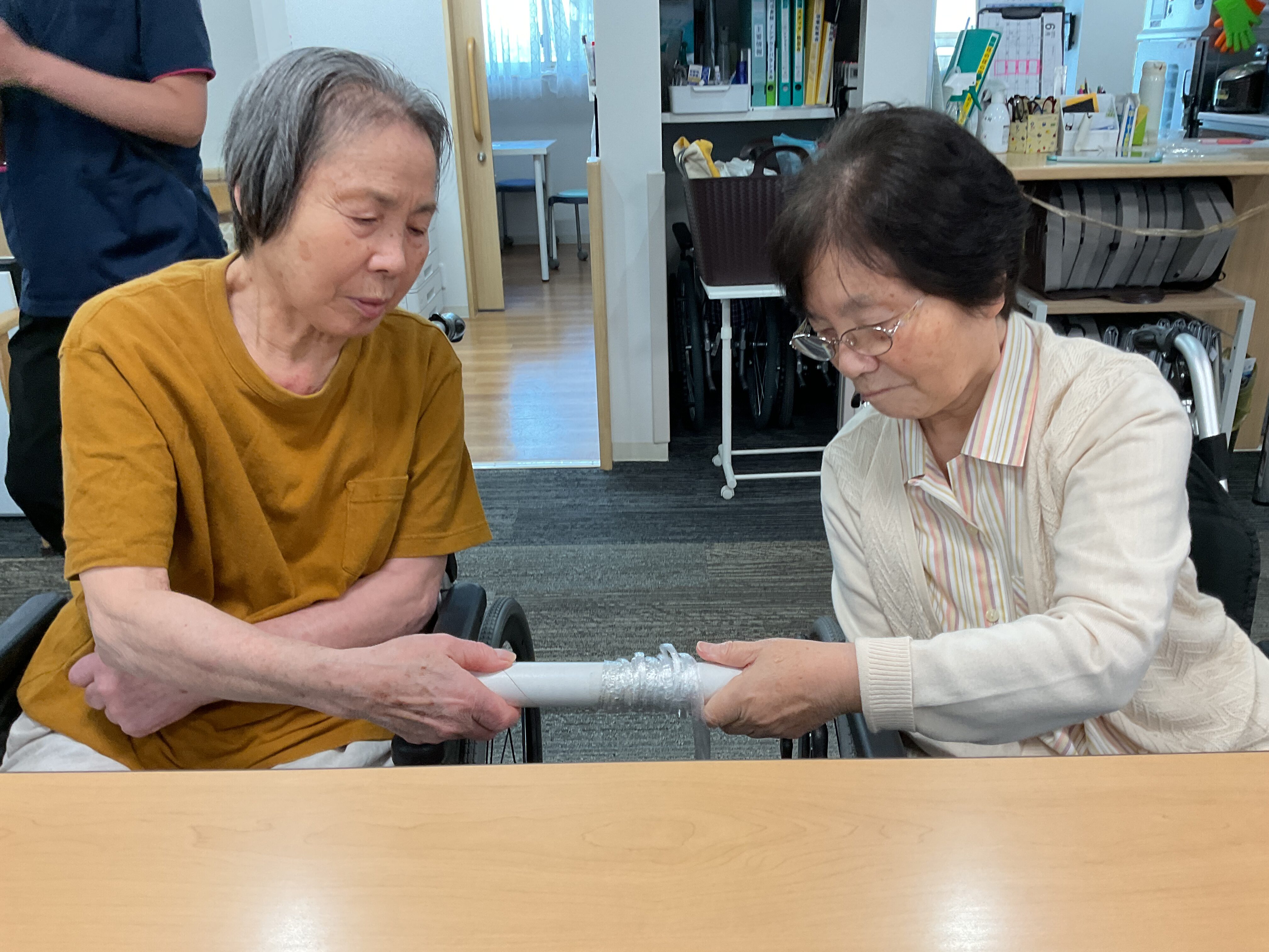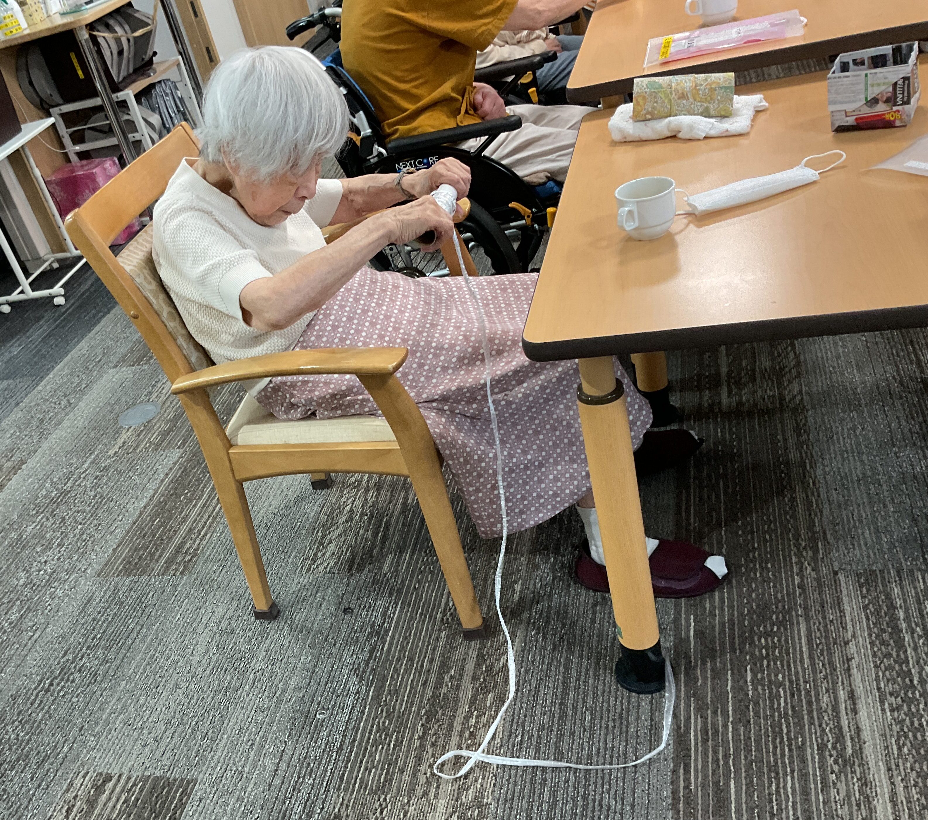 今日のレクは、「急いで急いで!巻き巻きレース!」です!これはラップの芯に長く切った紐を貼りつけ、その紐を芯に巻き付けて速さを競うゲームです。腕が疲れるほど皆様頑張ってくださり、とても白熱したいい勝負が出来ました!