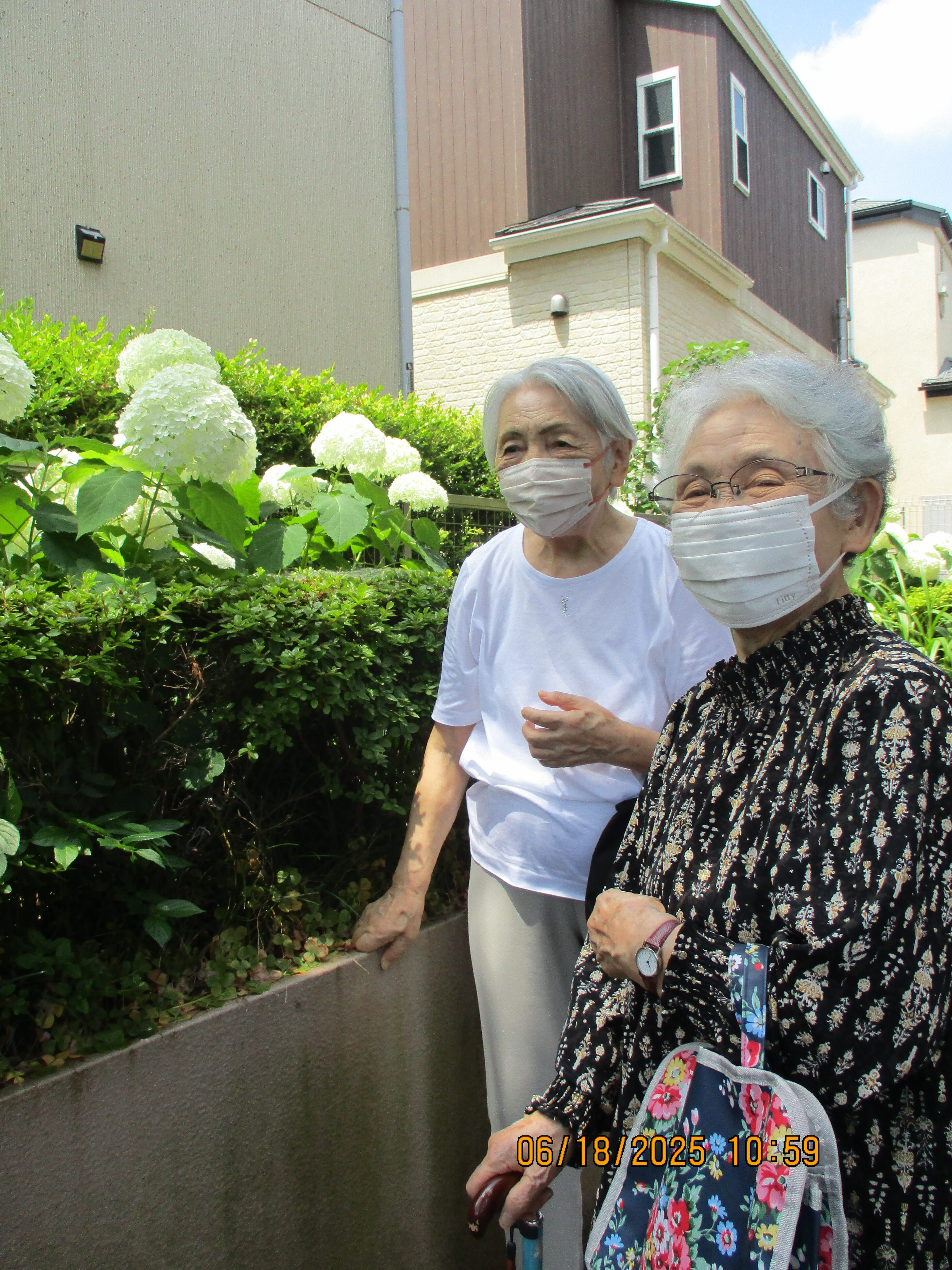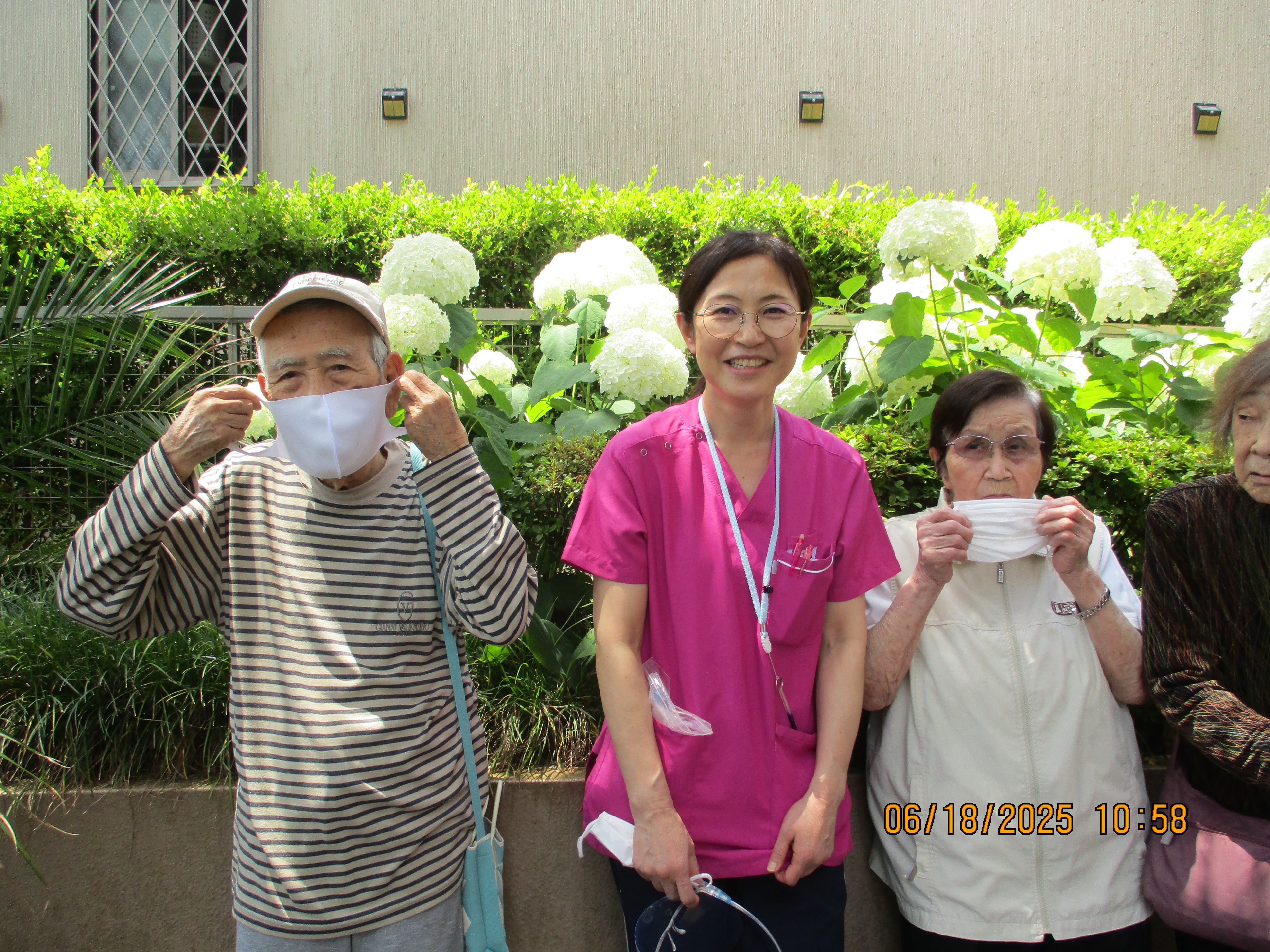 今年も紫陽花『アナベル』が綺麗に咲いてくれたので 訪問診療の歯医者の先生とスタッフさんと入居者様とで記念撮影をしました。