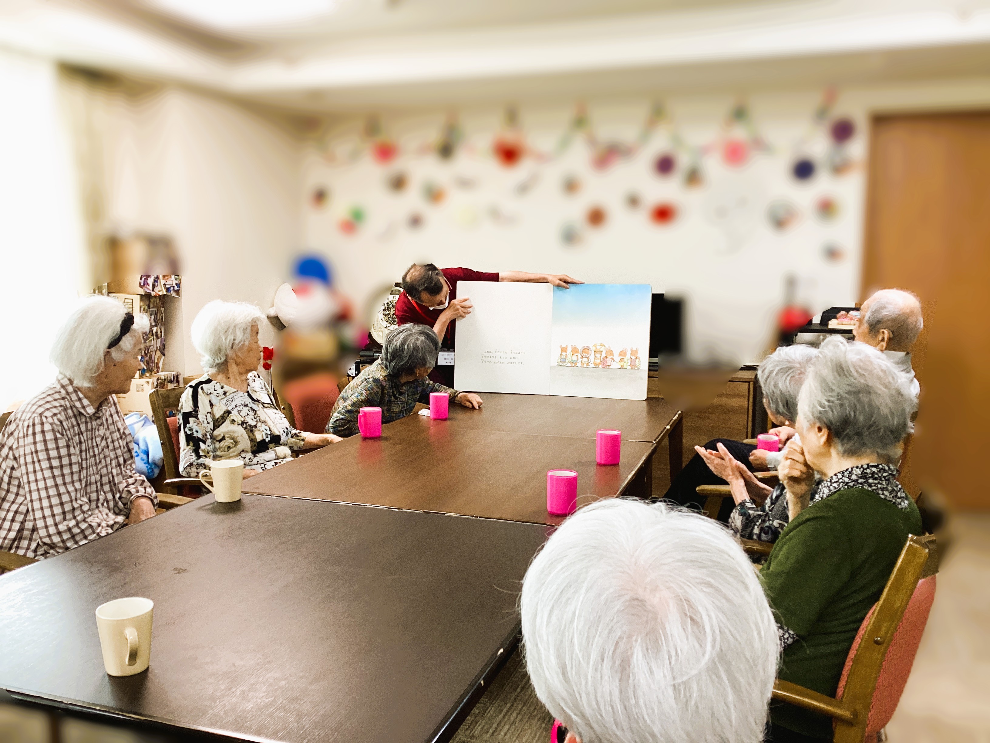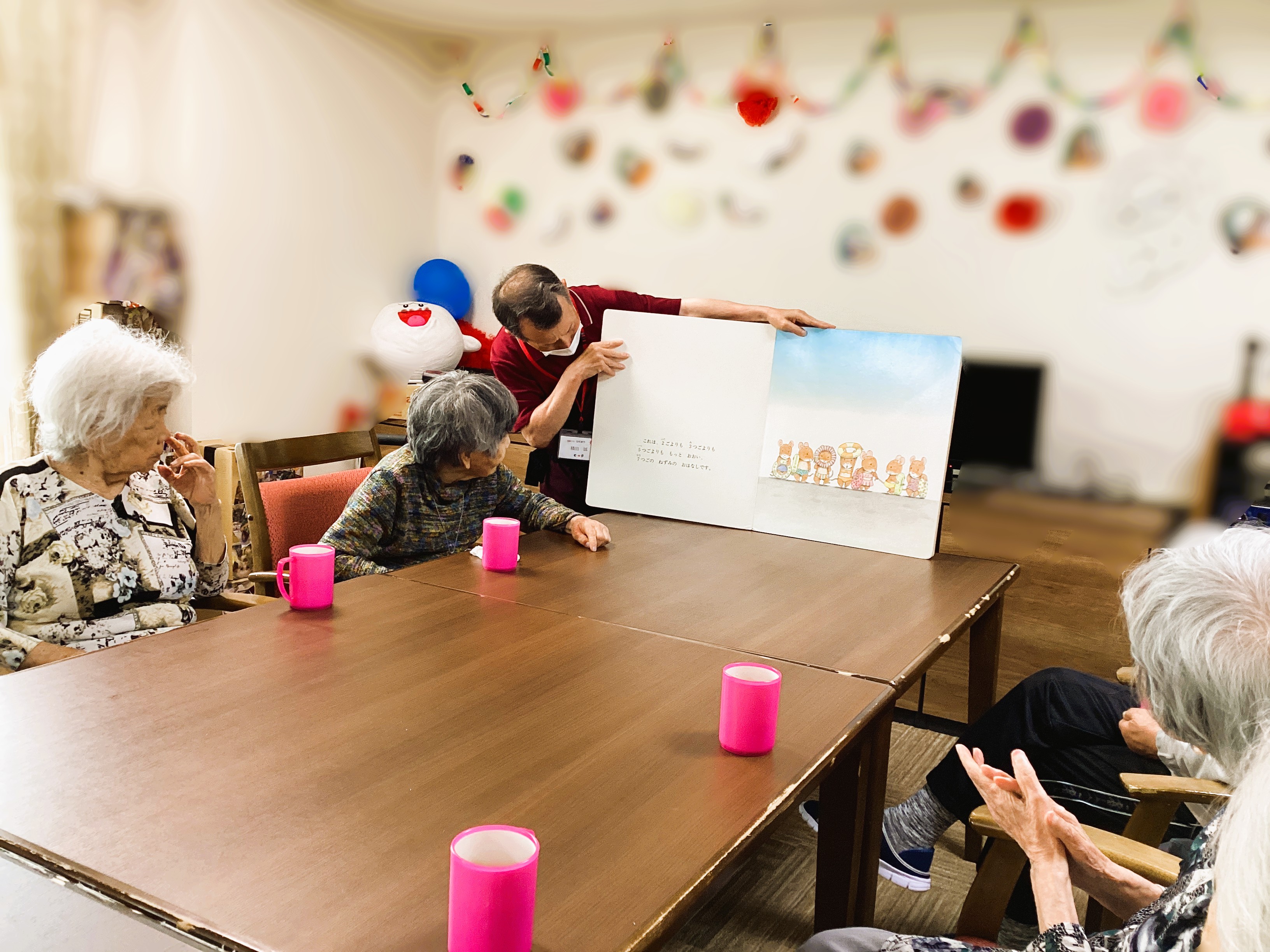 今月も地域のボランティア団体さんが訪問してくださいました✨ 大きな表紙をめくるとそこには素敵な絵本の世界がひろがっています! ページをめくるたびに、ご利用者様と不思議の世界の没入感に包まれて、、 ご利用者様と絵本の世界の冒険している気分でした✨