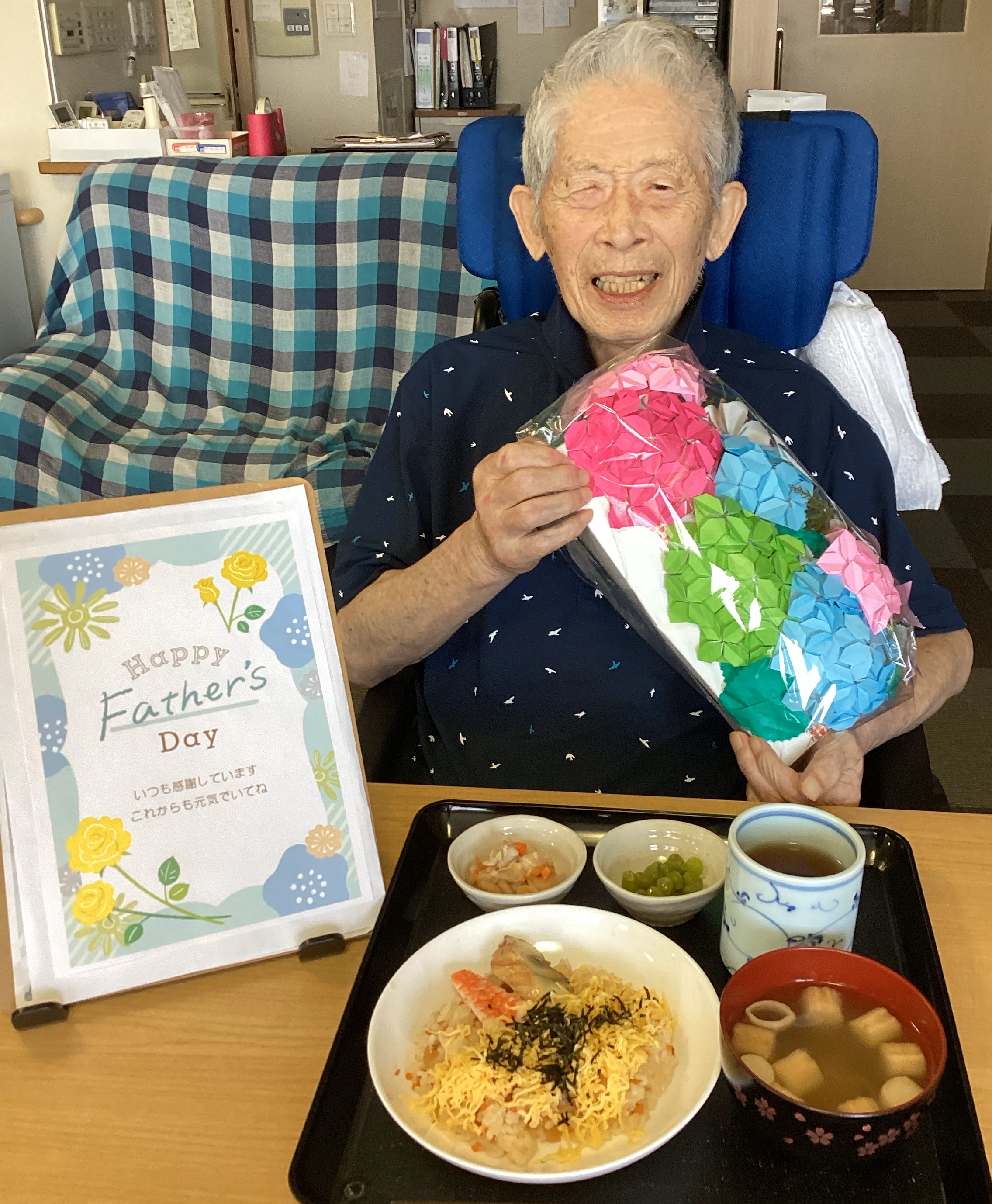 父の日会を行いました!お昼に”ちらし寿司”、おやつには”お饅頭”を召し上がりました!ちらし寿司は皆さんの人気メニューです!「美味しいね~♪」と笑顔いっぱいでした!