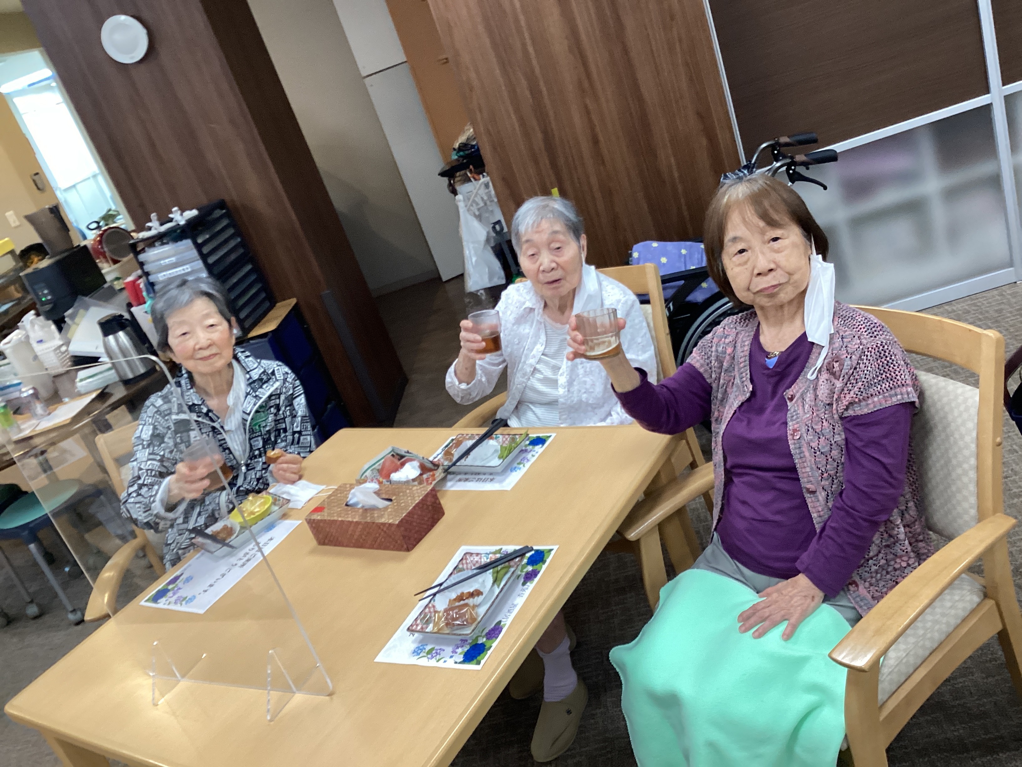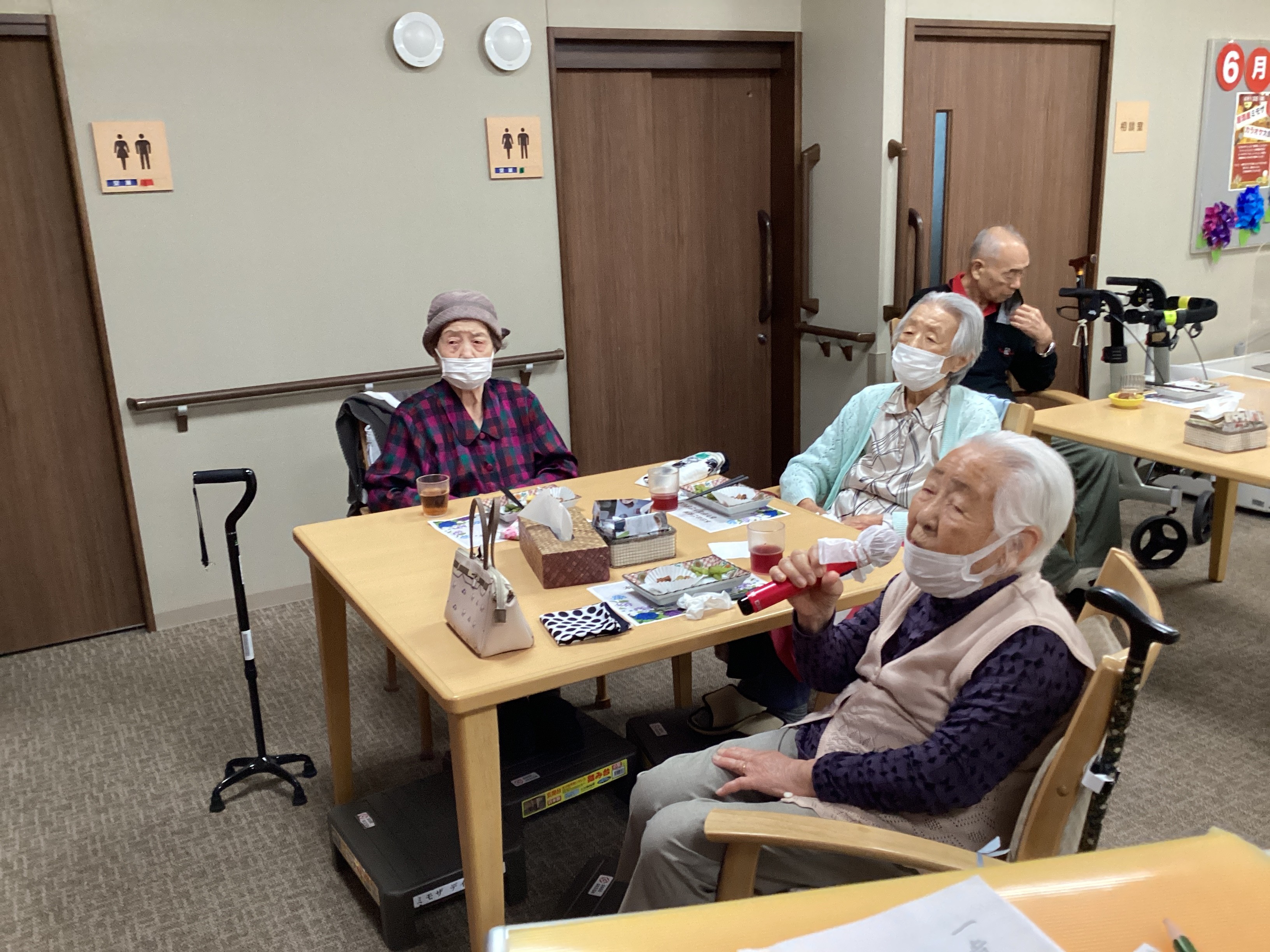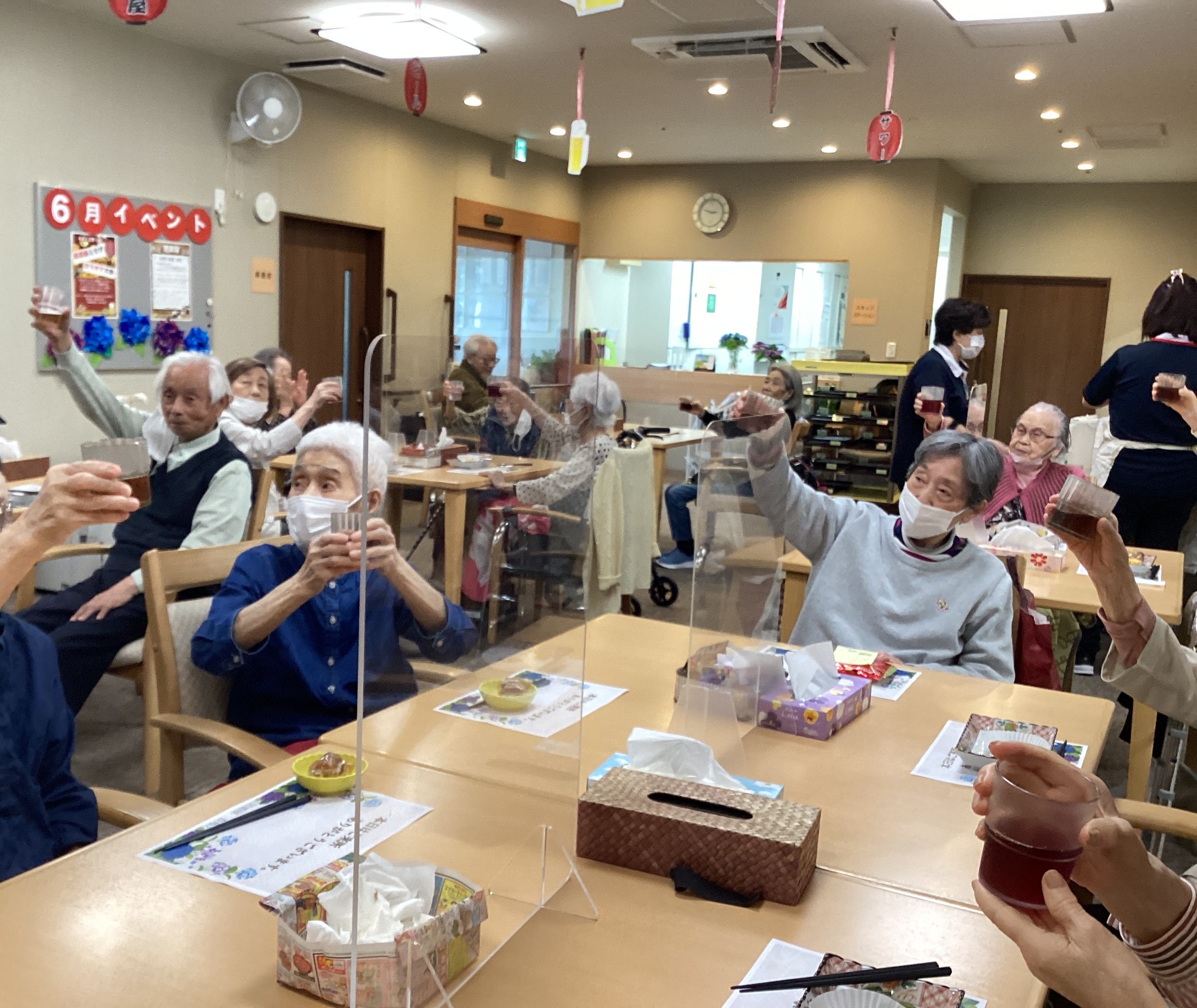 今回はおやつレクを「居酒屋」にして居酒屋杏苑開店です!!数種類のおつまみとノンアルコール飲料🍺を多数ご用意し、フロアーも居酒屋の装いにしました!中盤からはカラオケ大会が始まり今年はスタッフも一緒に楽しみました!(^^♪(6/13開催)