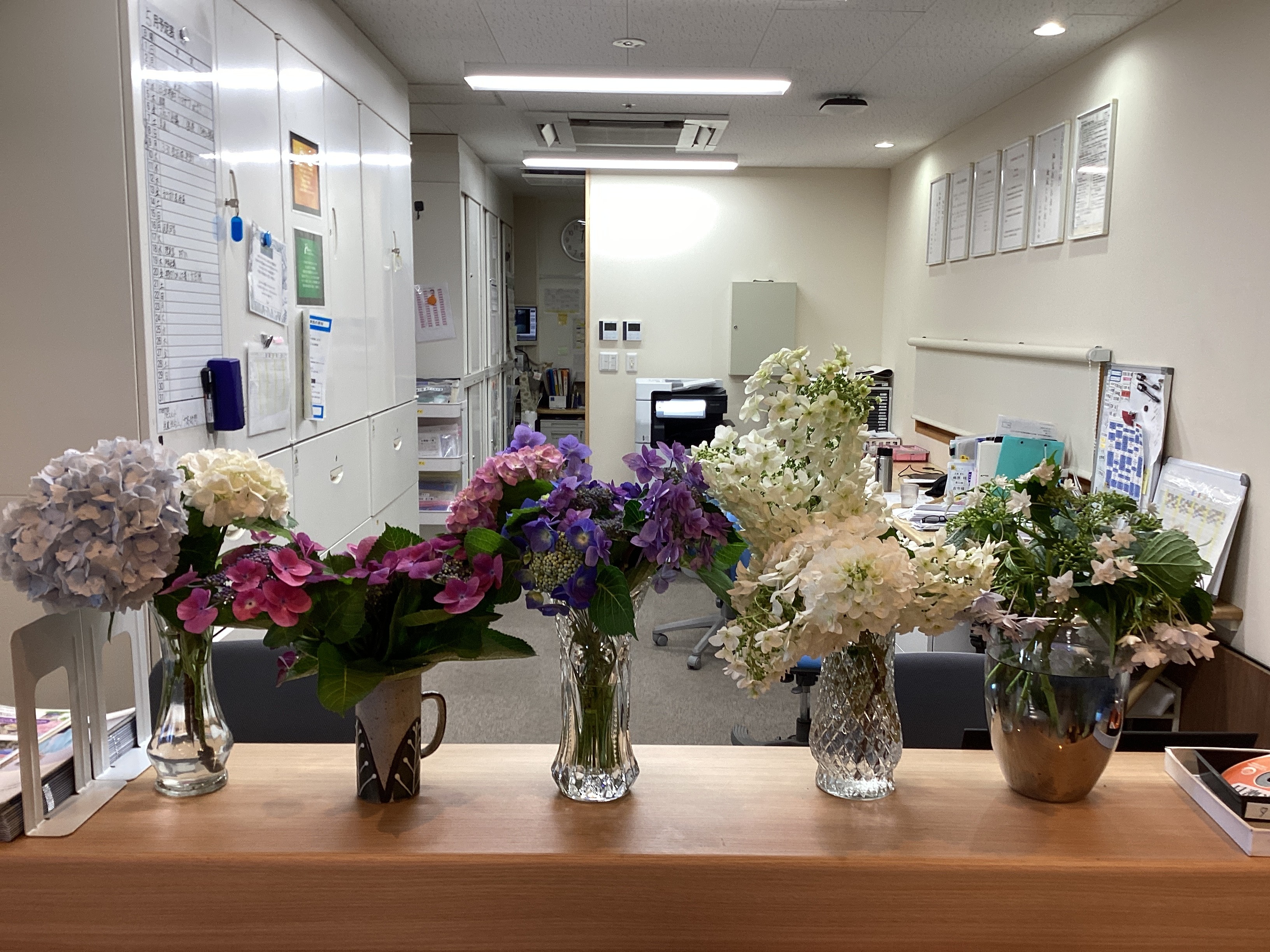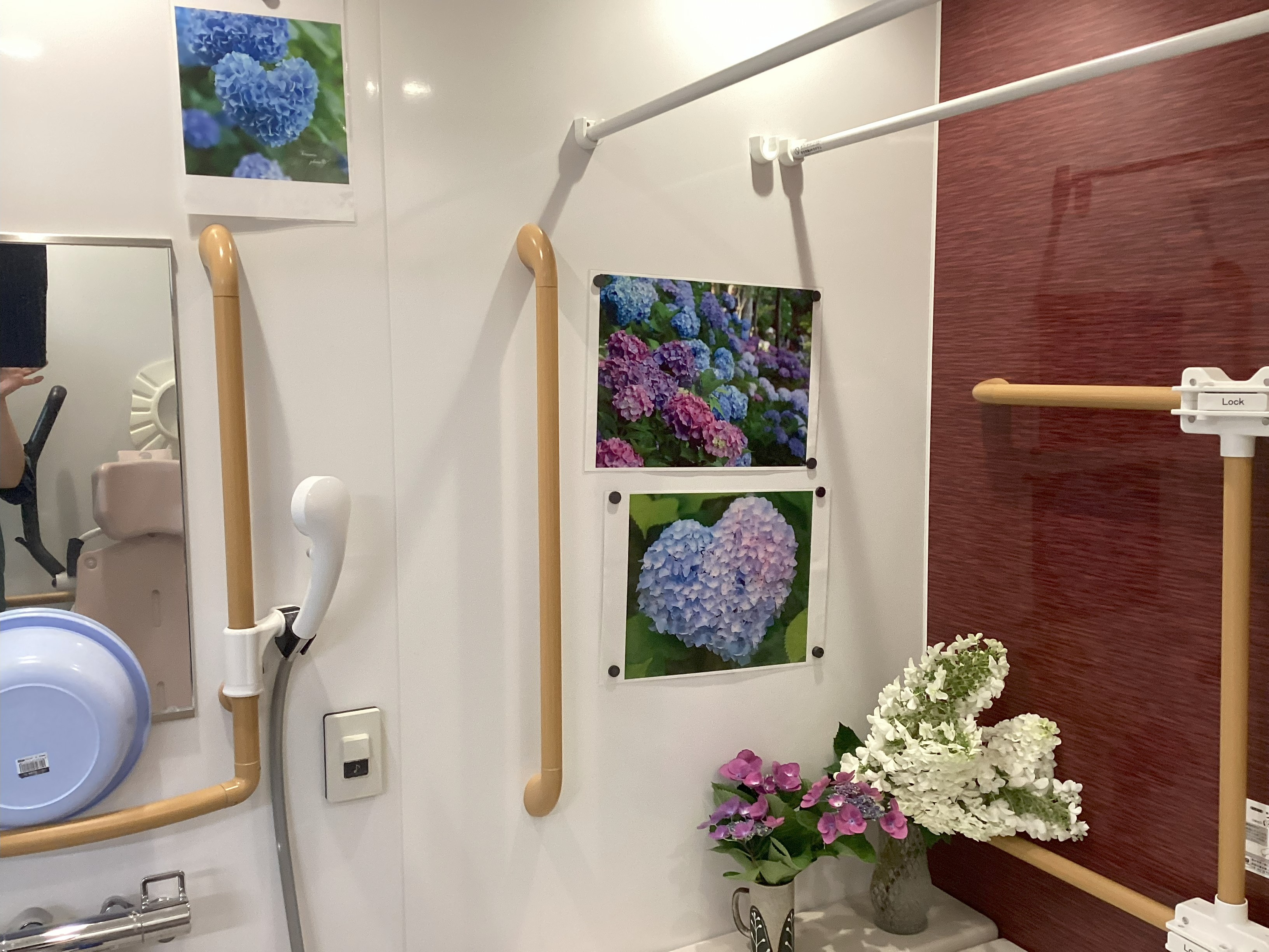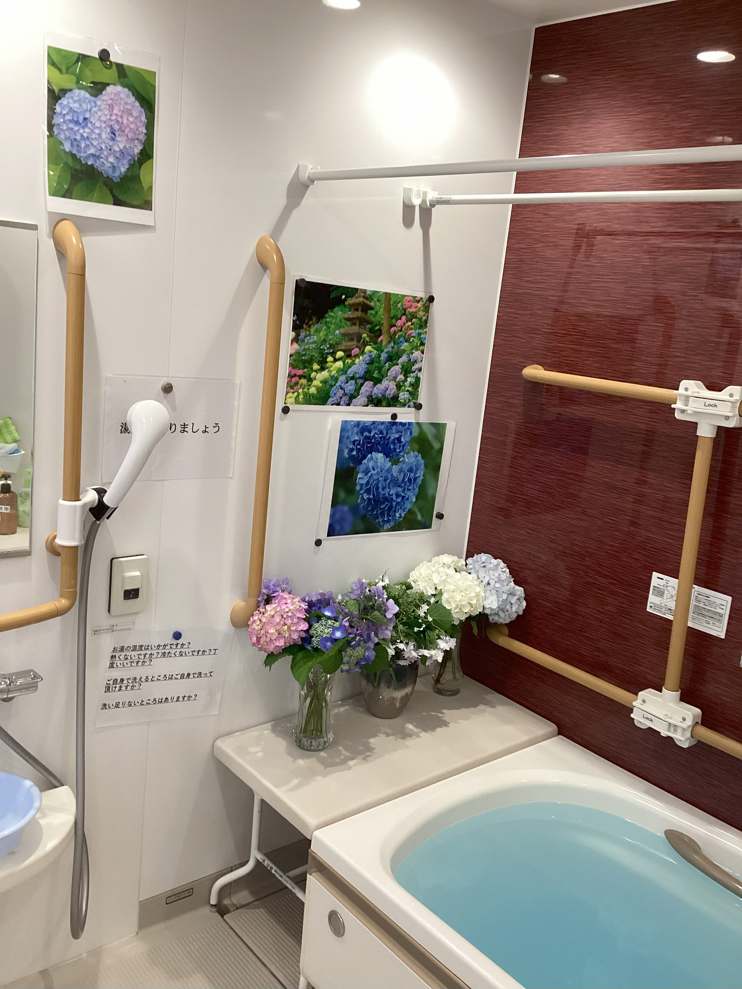 6月の「ミモザ温泉」はあじさいの湯でした。利用者さまのお宅からたくさんのあじさいを譲っていただきました!
