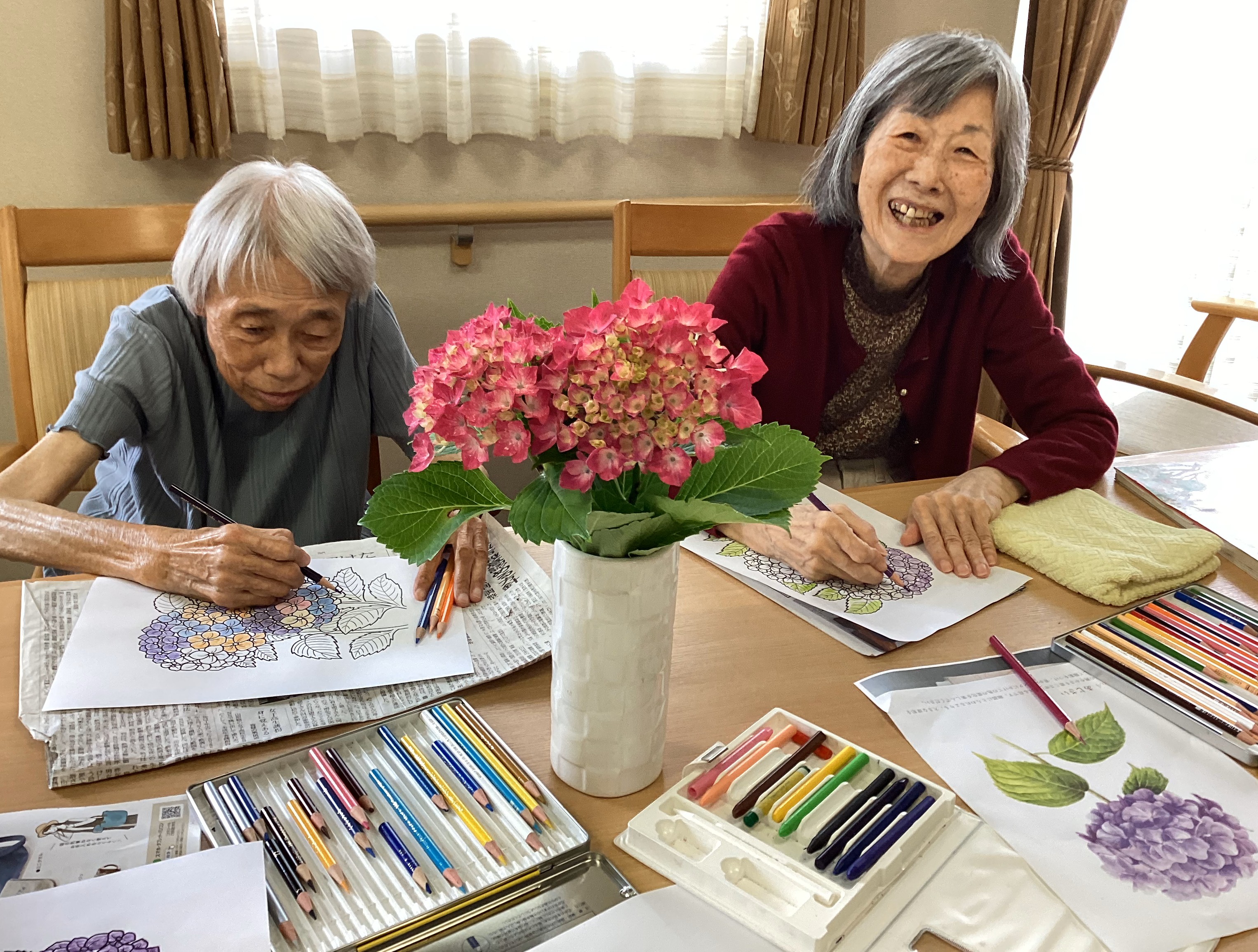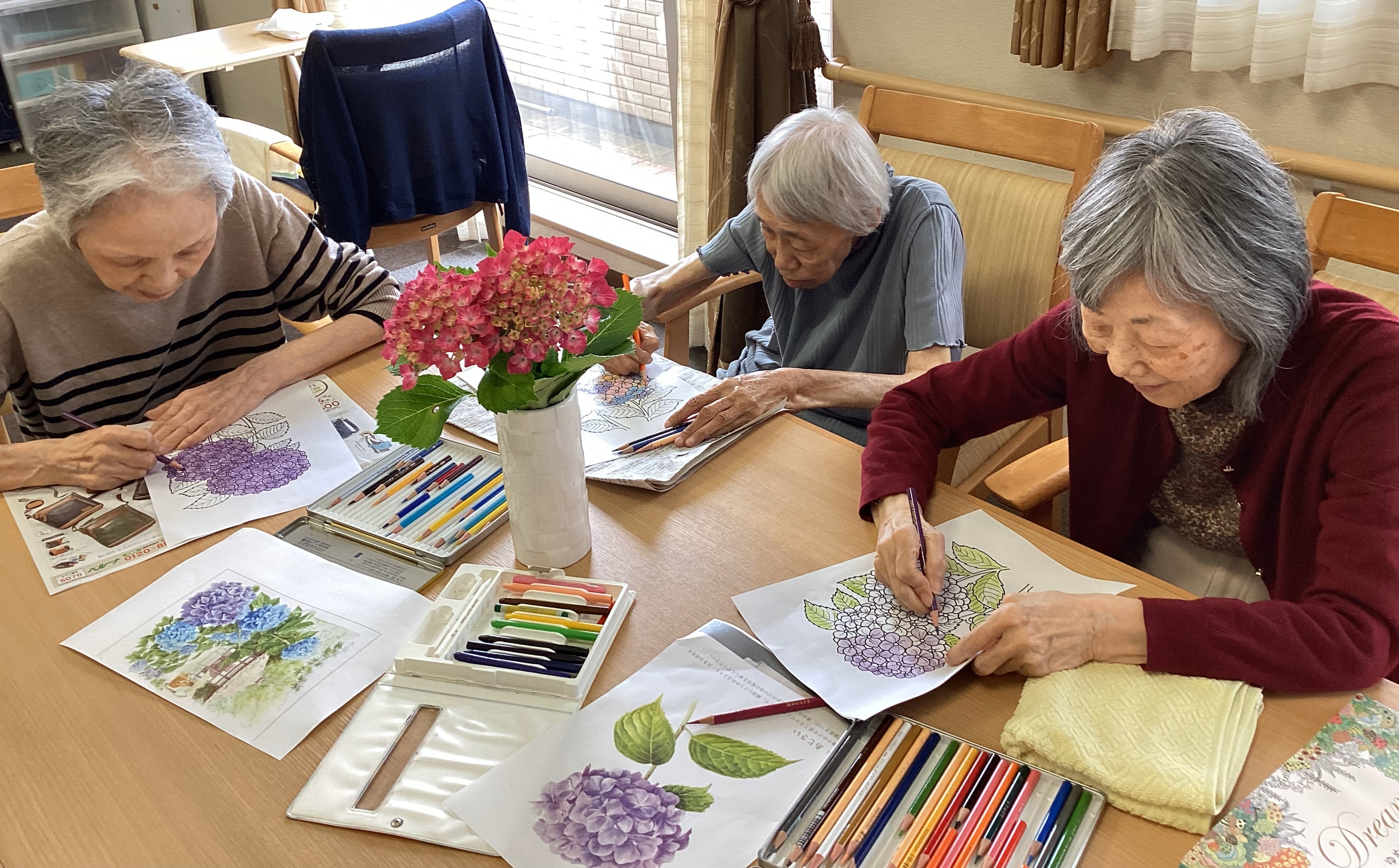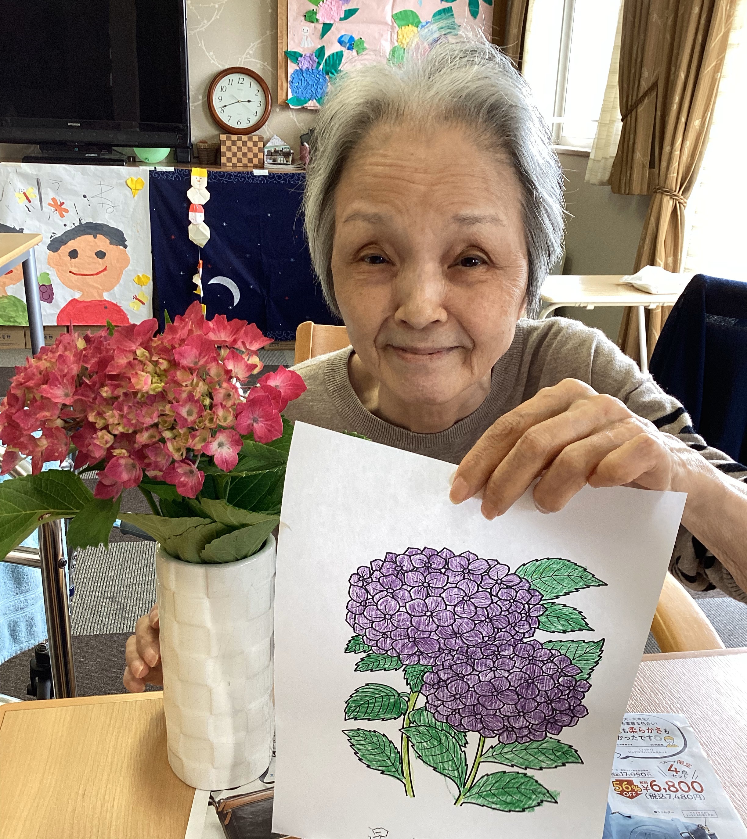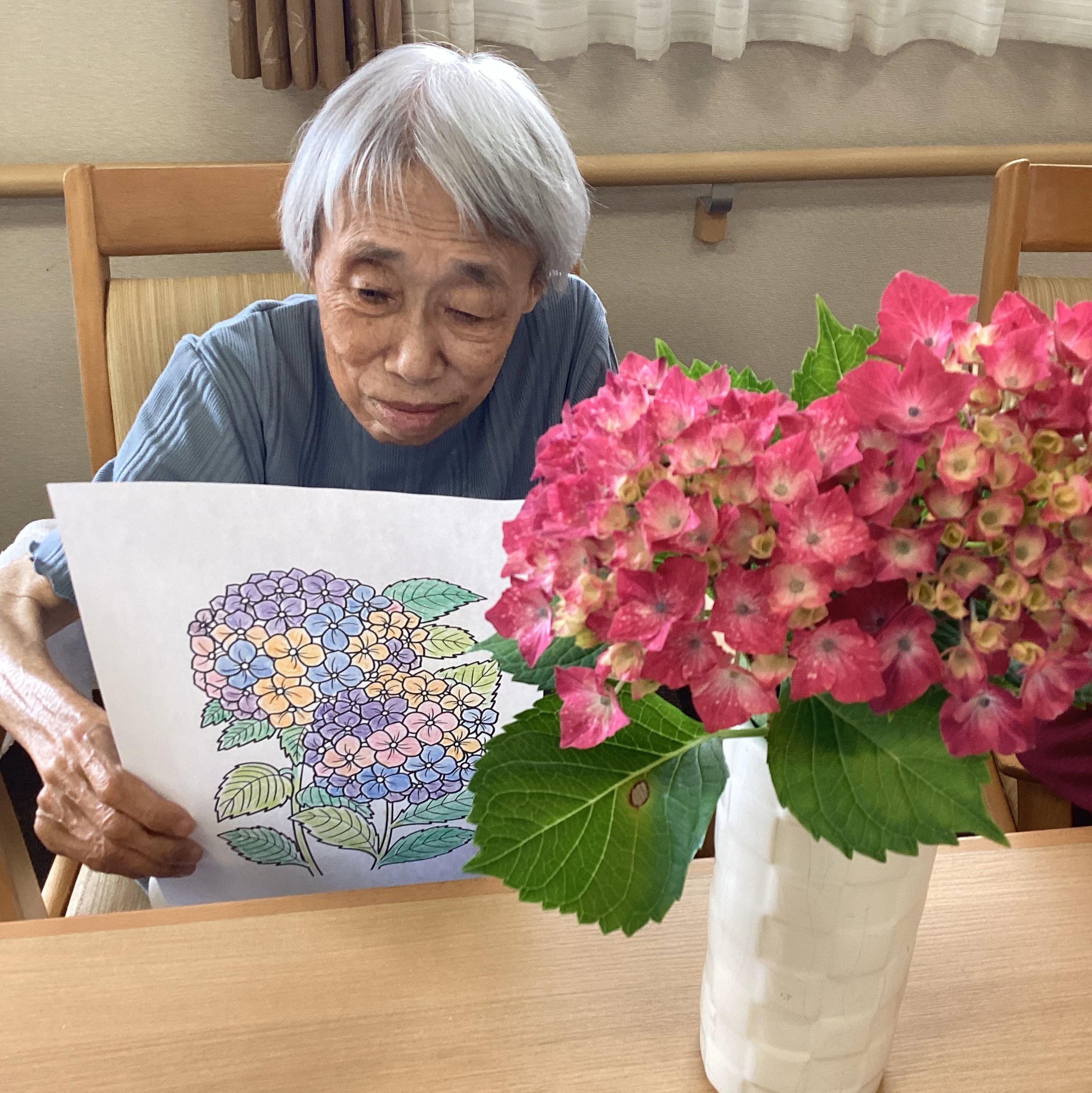 皆さんに6月と言えば?とお聞きした所、「梅雨」「あじさい」と教えてくれました!施設の庭に咲いているあじさいを、花瓶にさして鑑賞しながらあじさいの絵の塗り絵をしました!「えー下手だなあ~、うまく塗れない~」なんて言いながらも皆さん真剣に塗っていました!