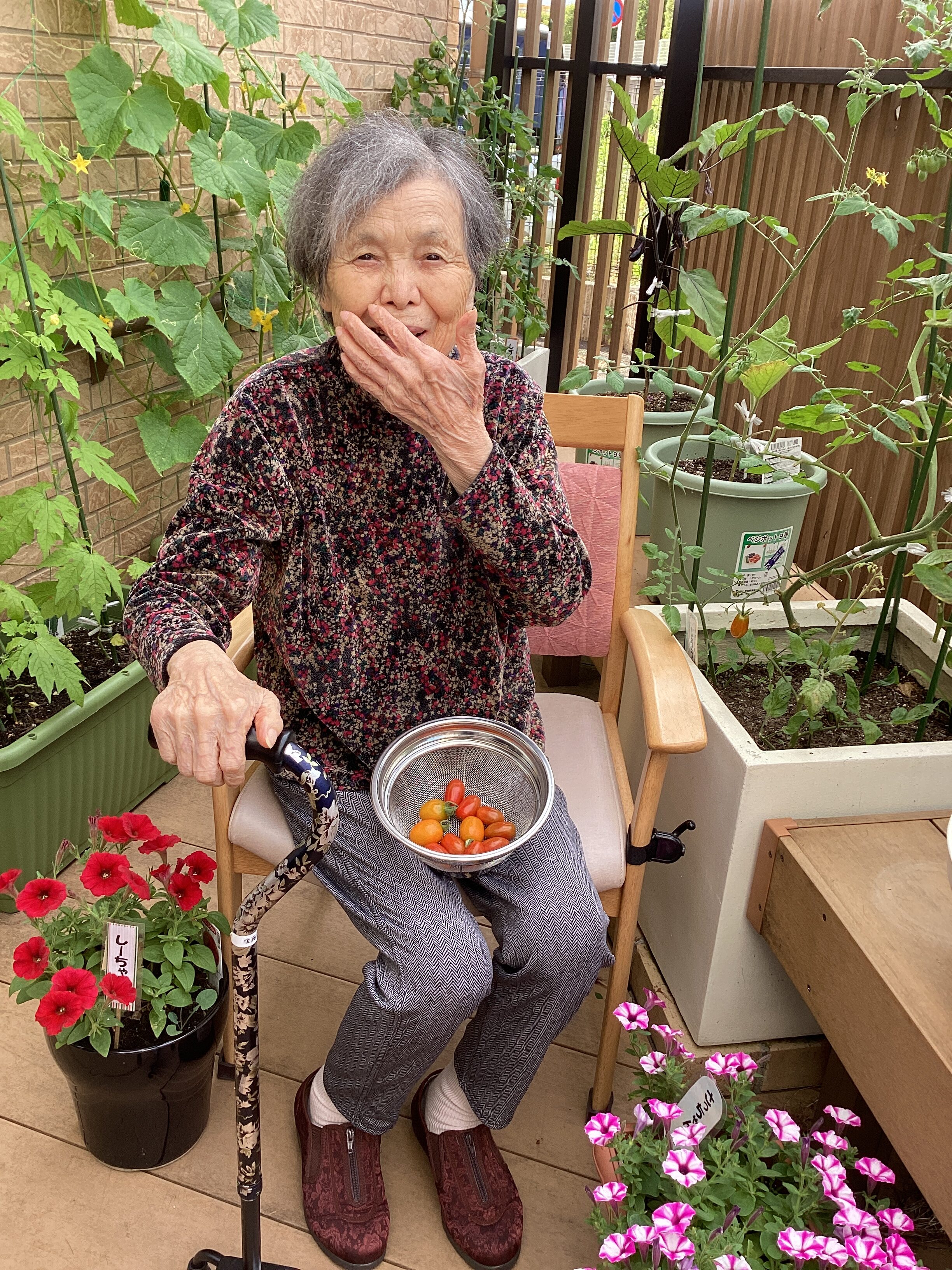 こちらのどっさり夏野菜、どこで採れたと思いますか?4月に始めたミモザ園芸部🏵️プランターでお野菜も植えたのですが今の季節になり、こんなにたくさん収穫できました! 夏の宝石をもいで、皆さんのお顔もキラキラ生き生き✨畑を引退した方にも大変喜ばれます☺️