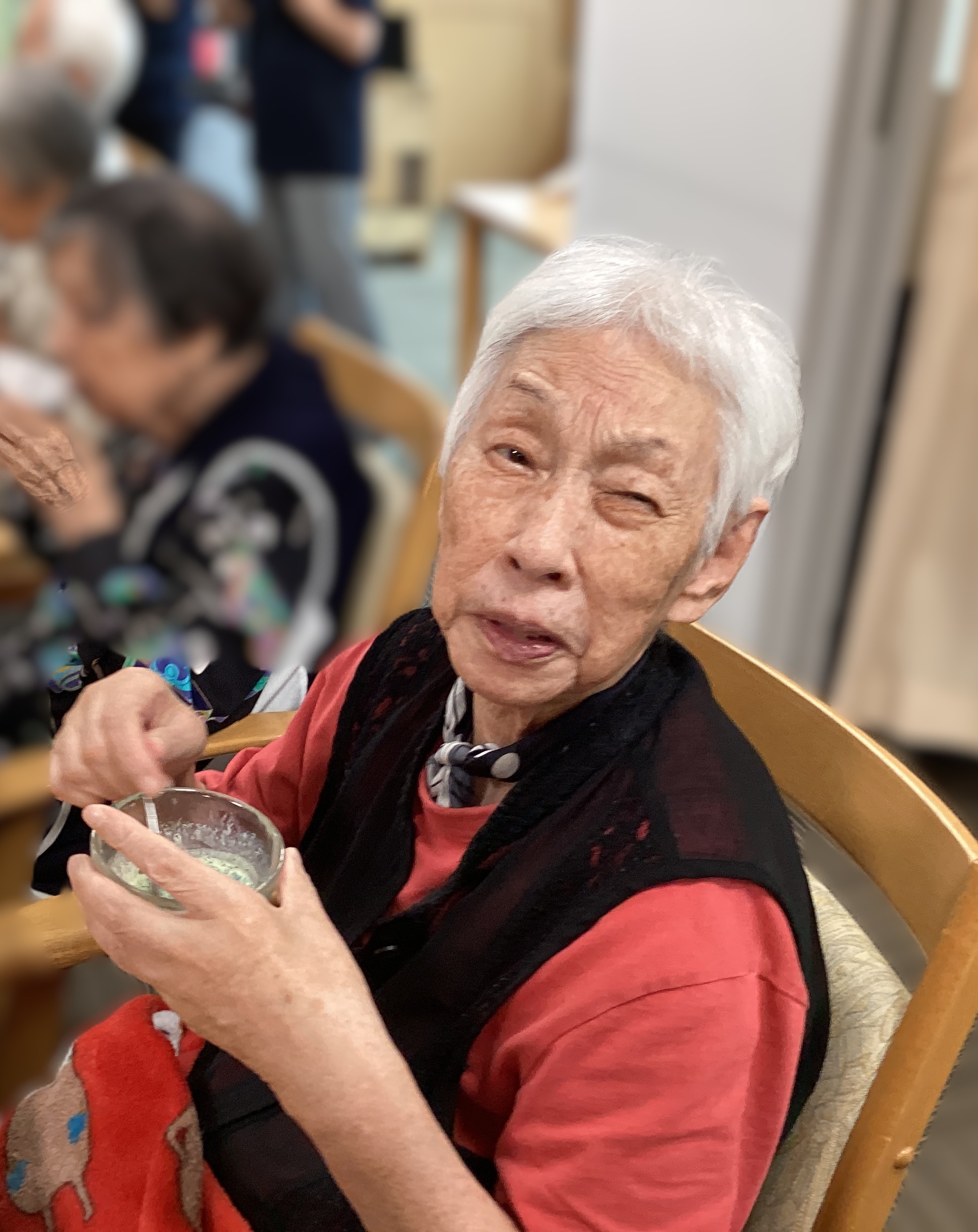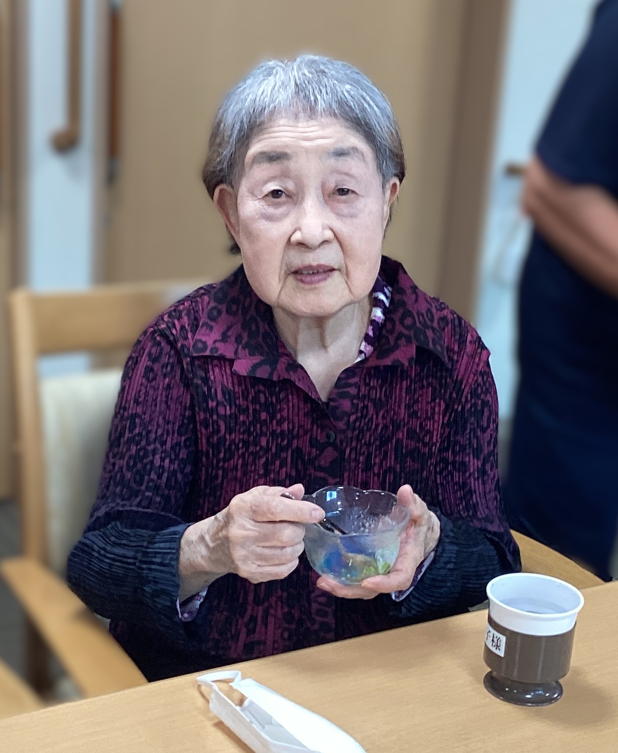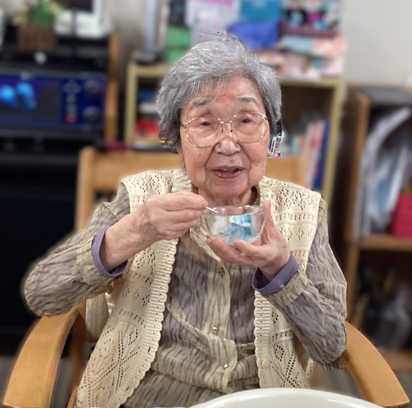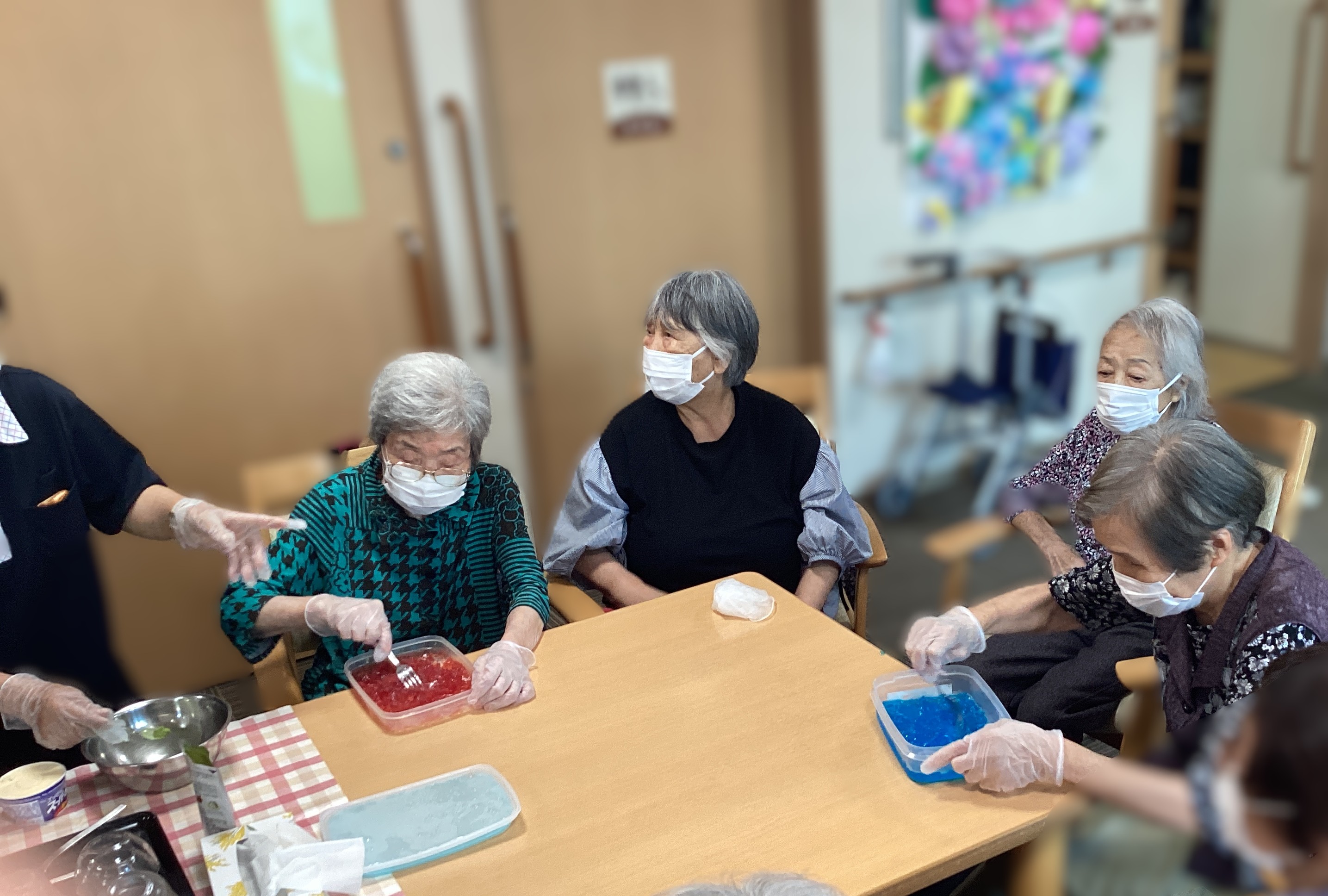 梅雨の蒸し暑い午後におやつレクで紫陽花色のゼリーを作りました。アイスクリームと抹茶の粉を振りかけて、とっても美味しいデザートが出来上がりました。