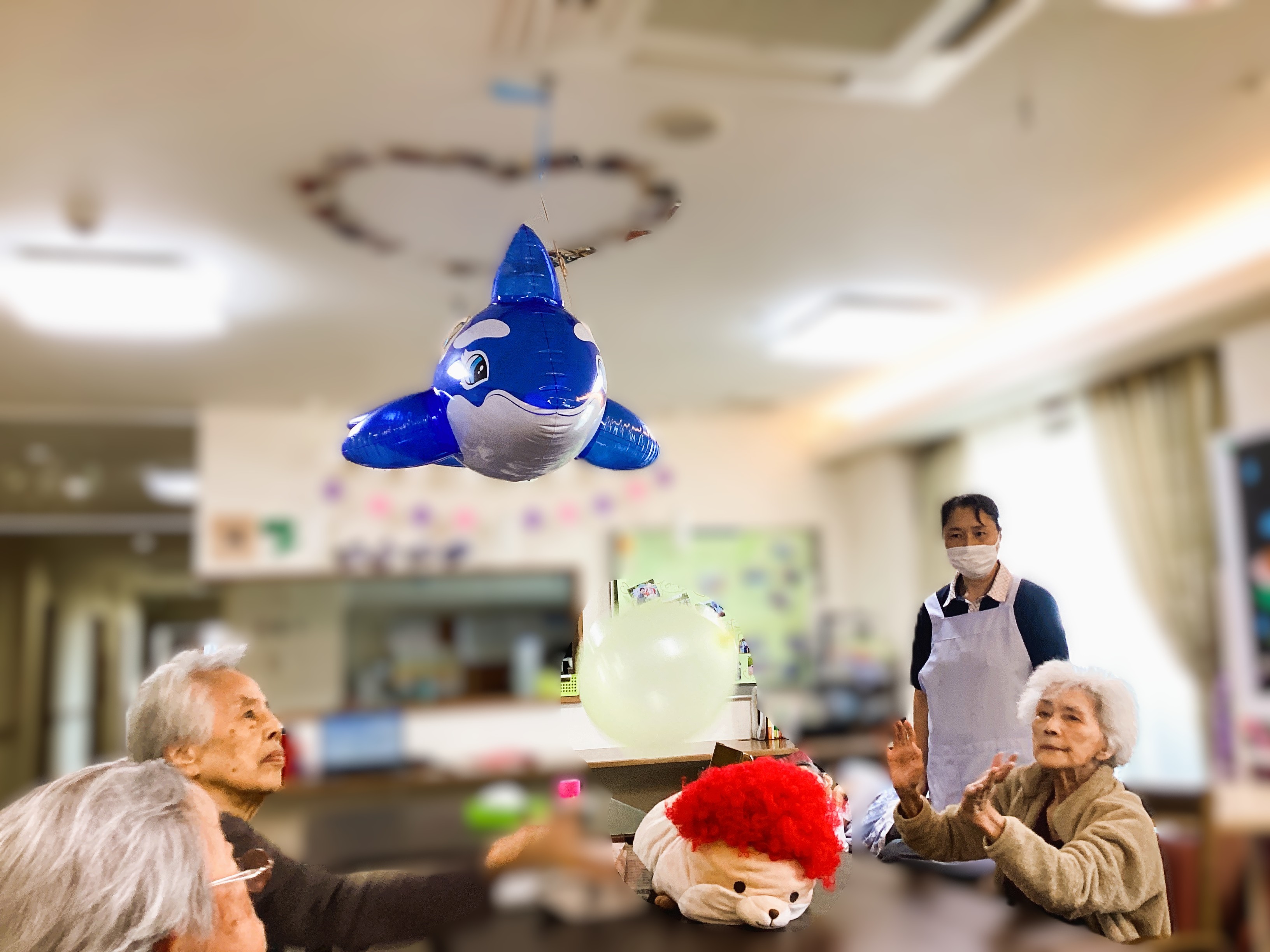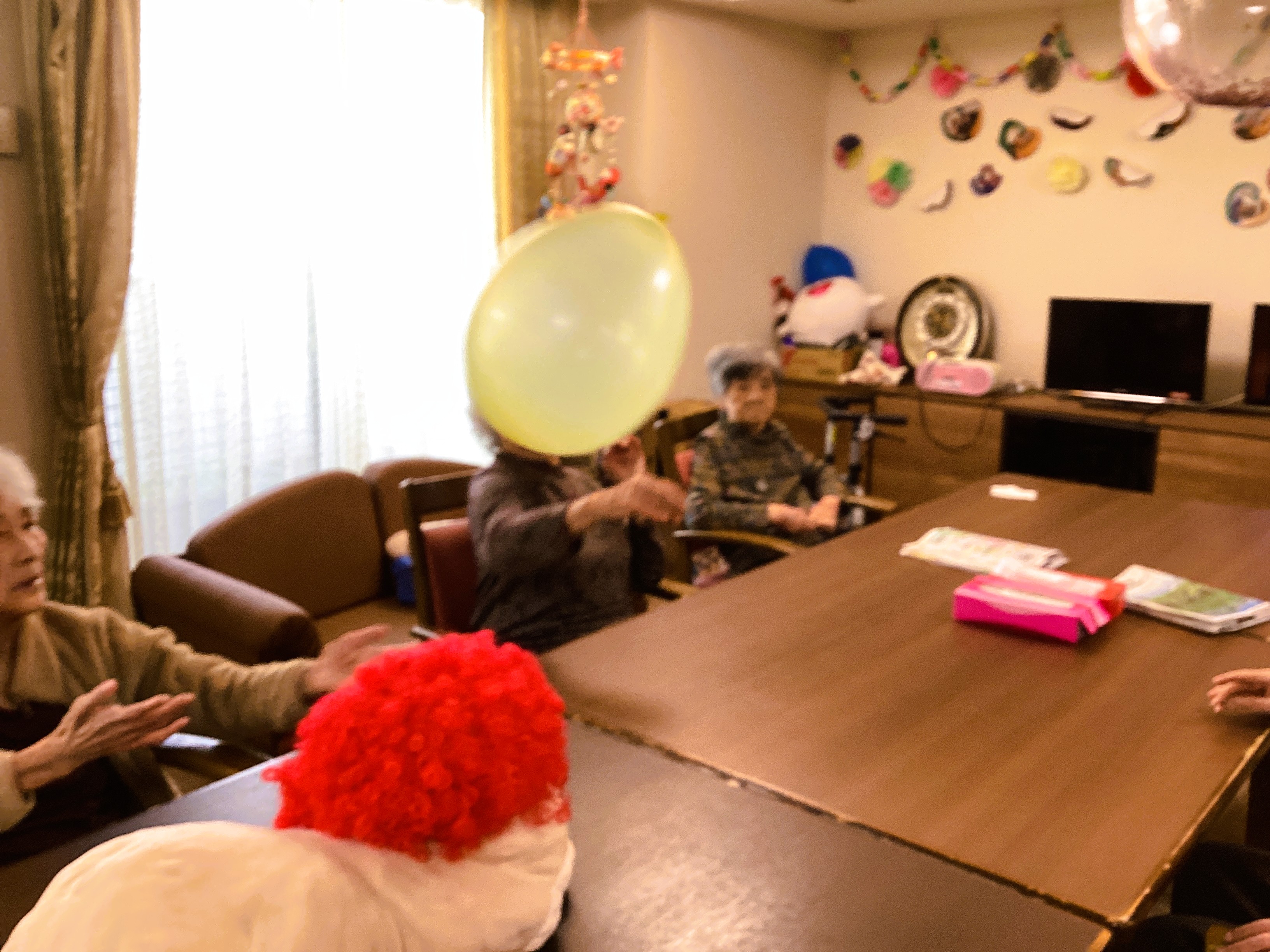 ふわっとポンポン、、?とは? そう、ミモザ市原グループホームでは定番のレクなのです。 職員も本気で一緒に楽しませていただいているので、写真に躍動感がありますね( ´∀` ) 風船を用意すると自然とご利用者が参加してくださいます💛 市原の魅力💛