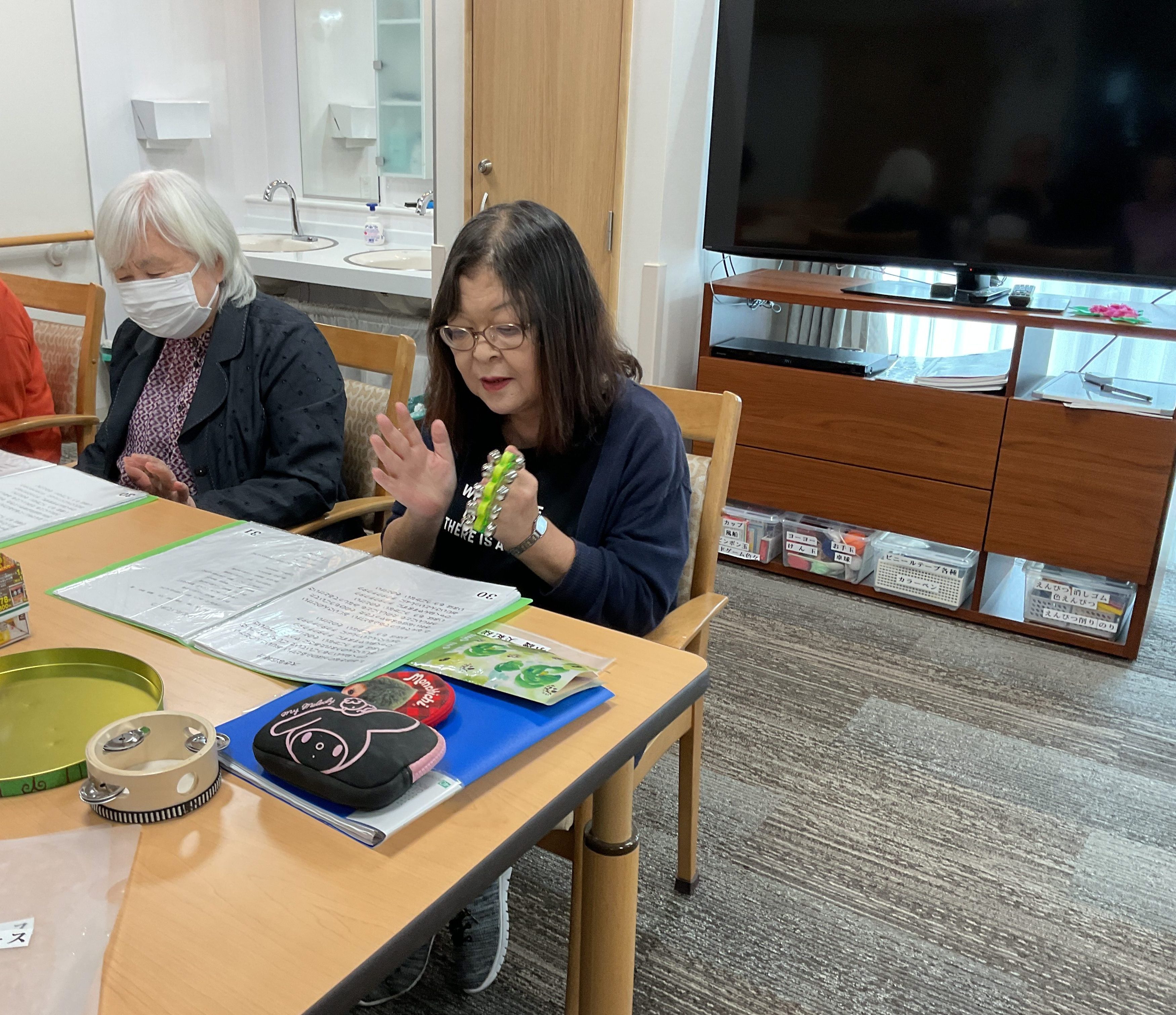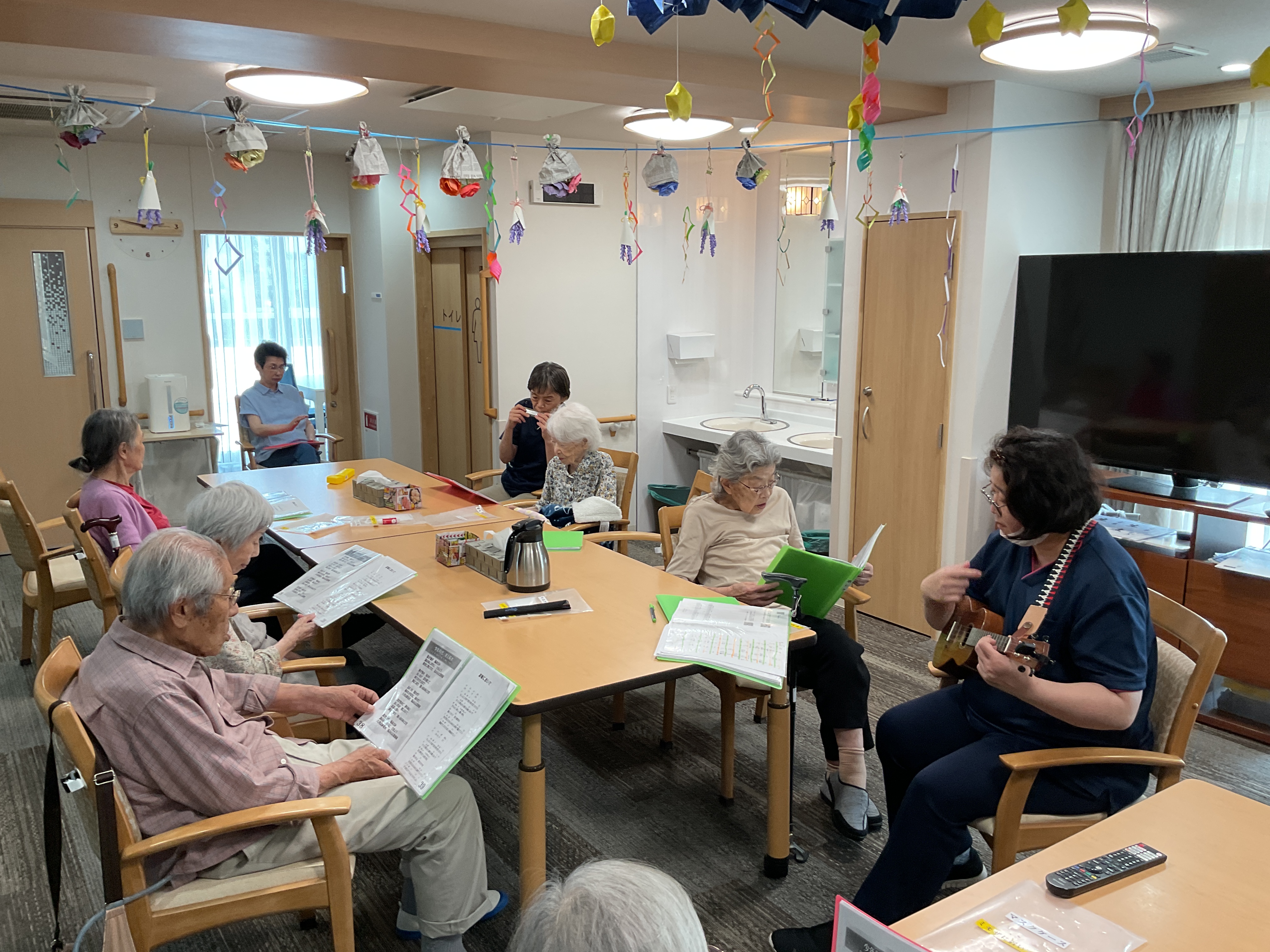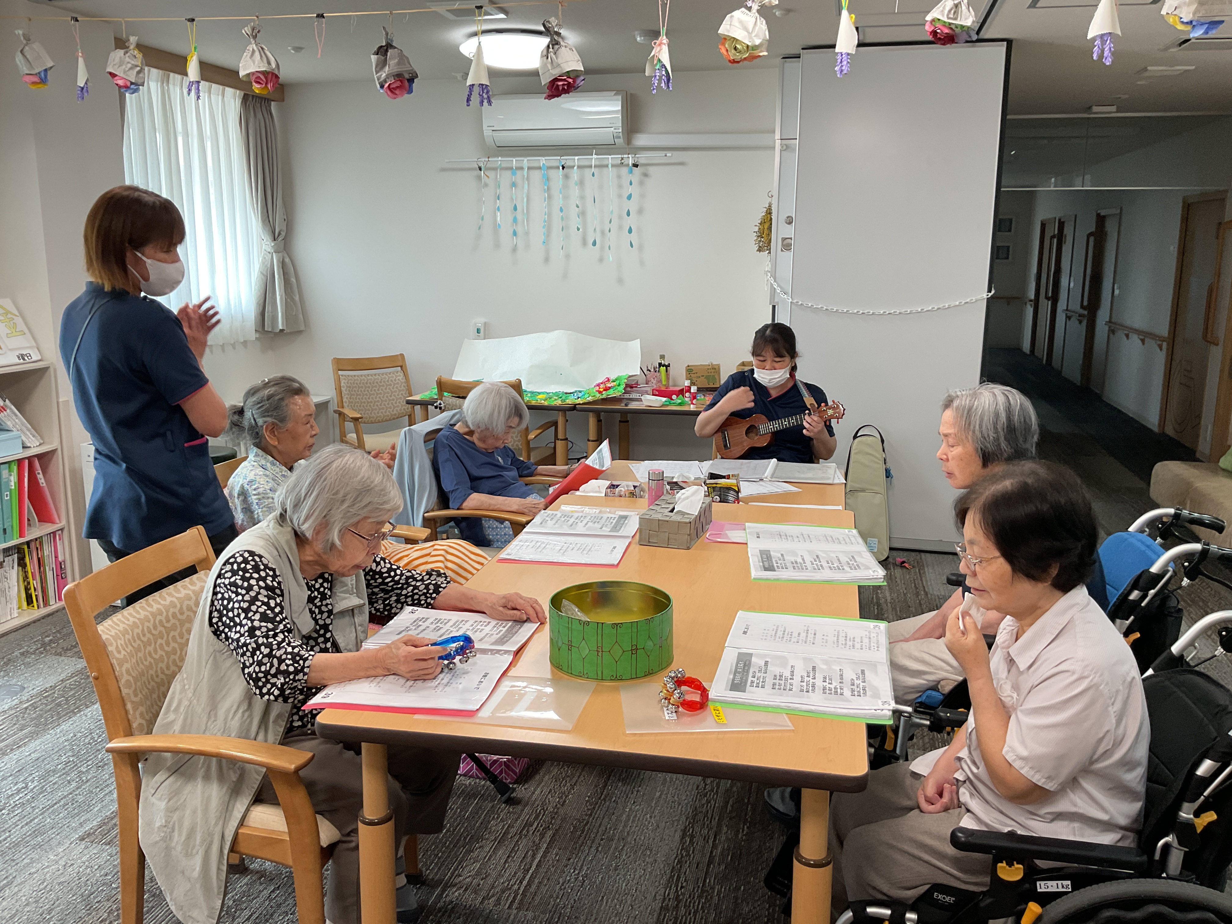 今日は久しぶりに涼しい一日でした。この涼しさが続いてほしいものです。今日は音楽を楽しみました!スタッフが奏でるウクレレやハーモニカの演奏に合わせ、ご利用者も楽器を鳴らしながら歌を歌いました。昔懐かしい曲や、童謡など楽しんで歌われていました。