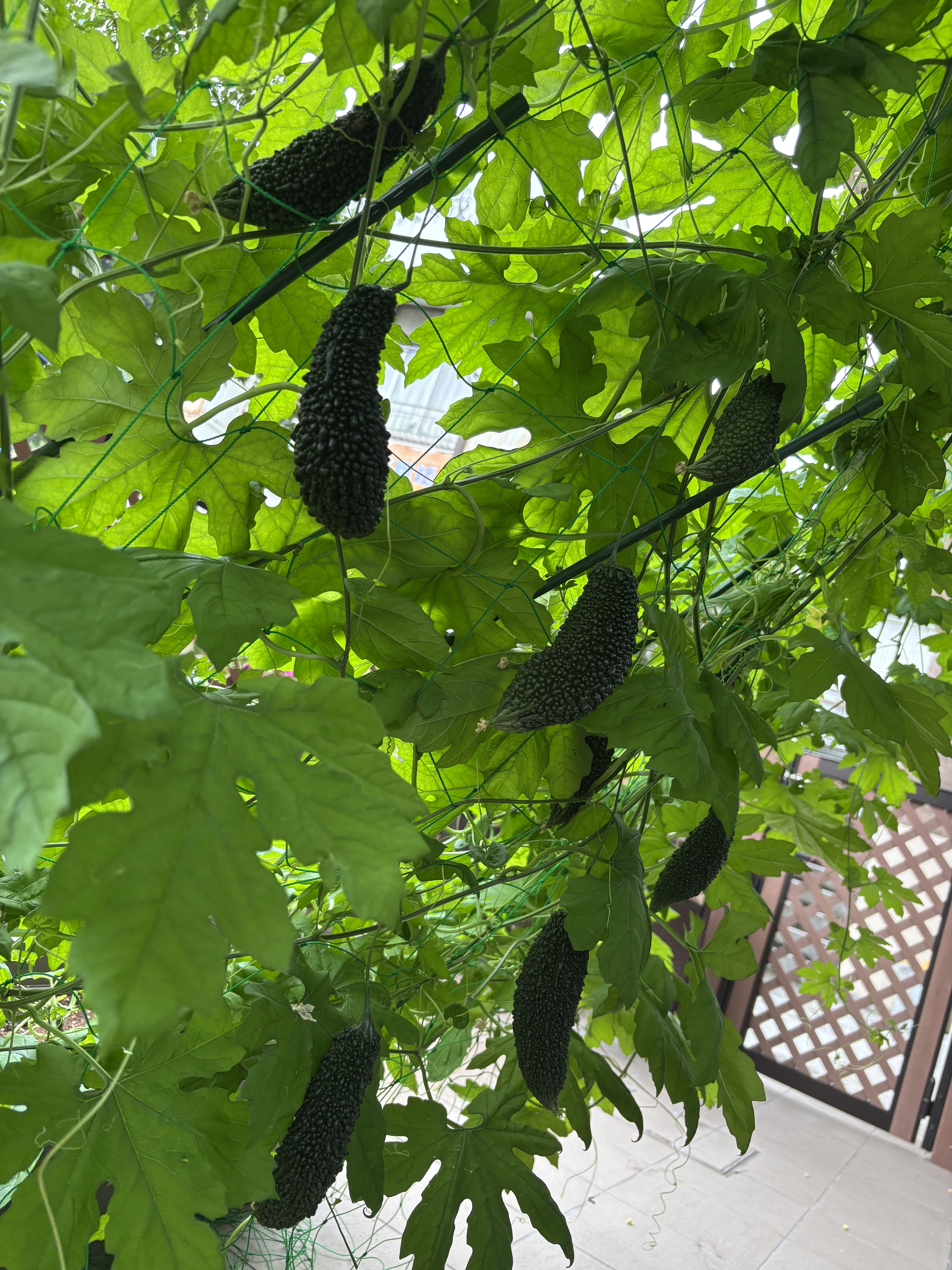 ゴーヤがすくすくと育ちいっぱいの実が出来ています。ゴーヤと竹輪の天ぷらは絶品でした。