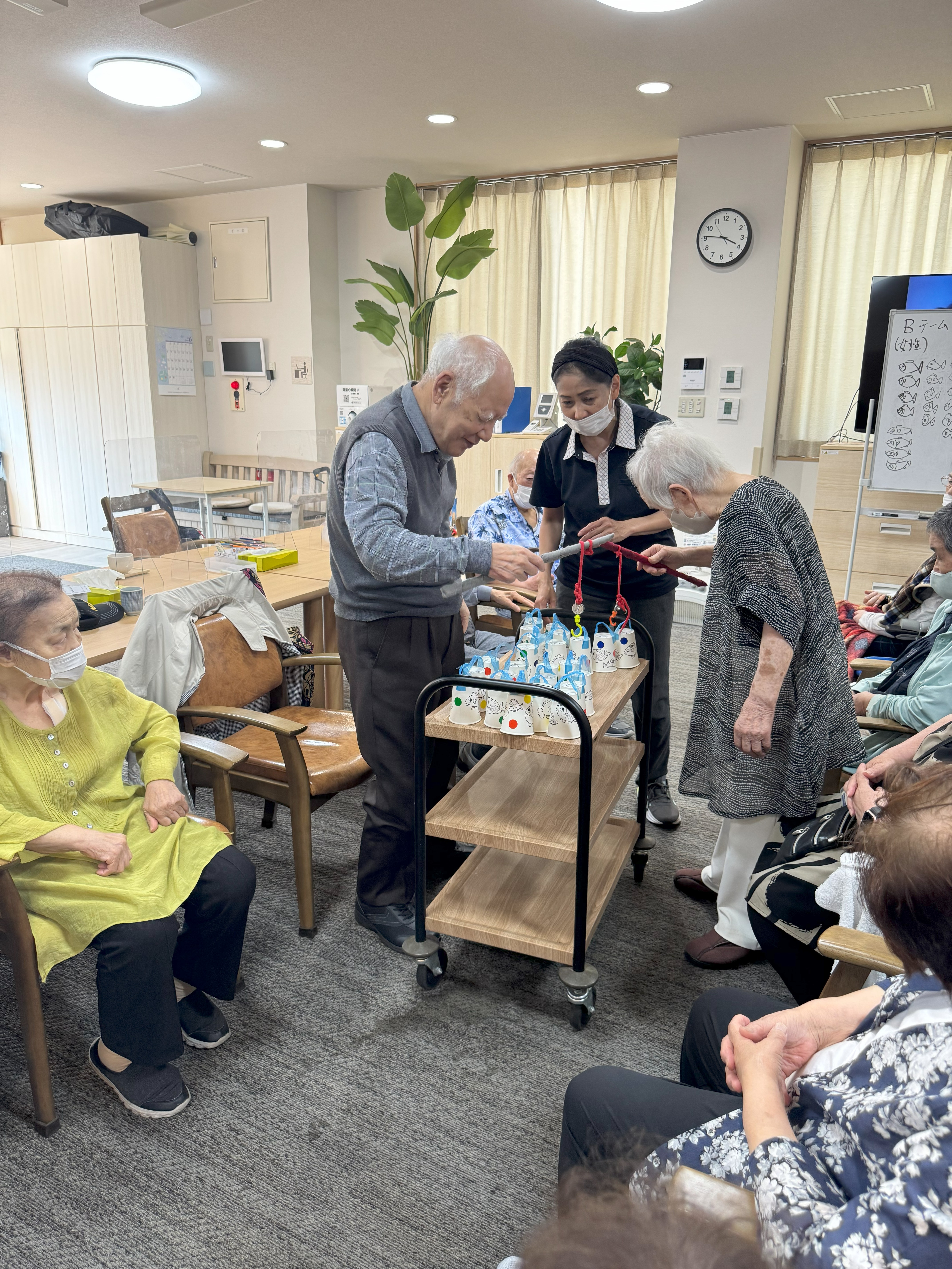 ある日のレクリエーションで対戦型の釣りゲームをしました。