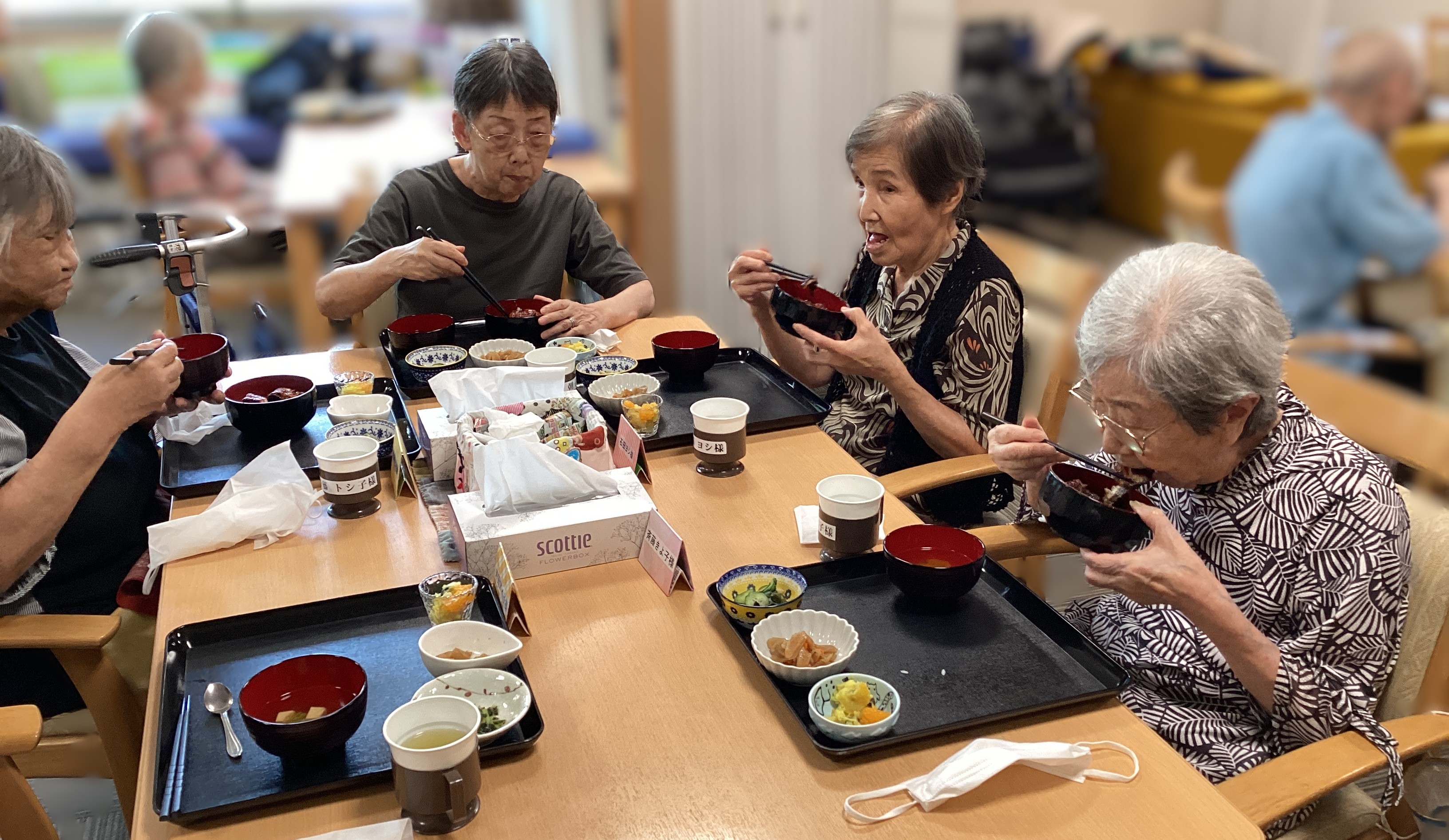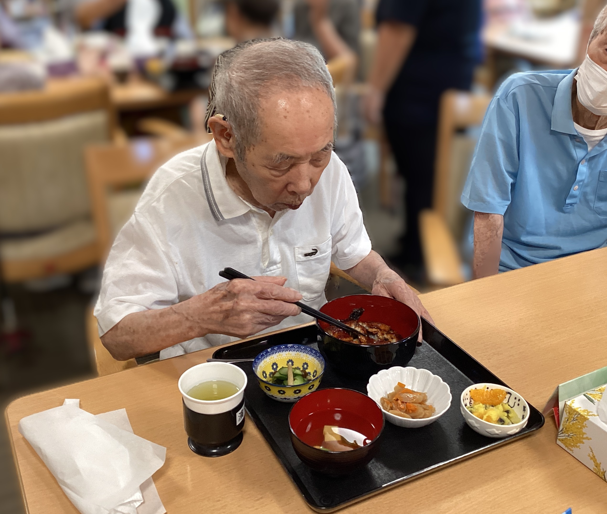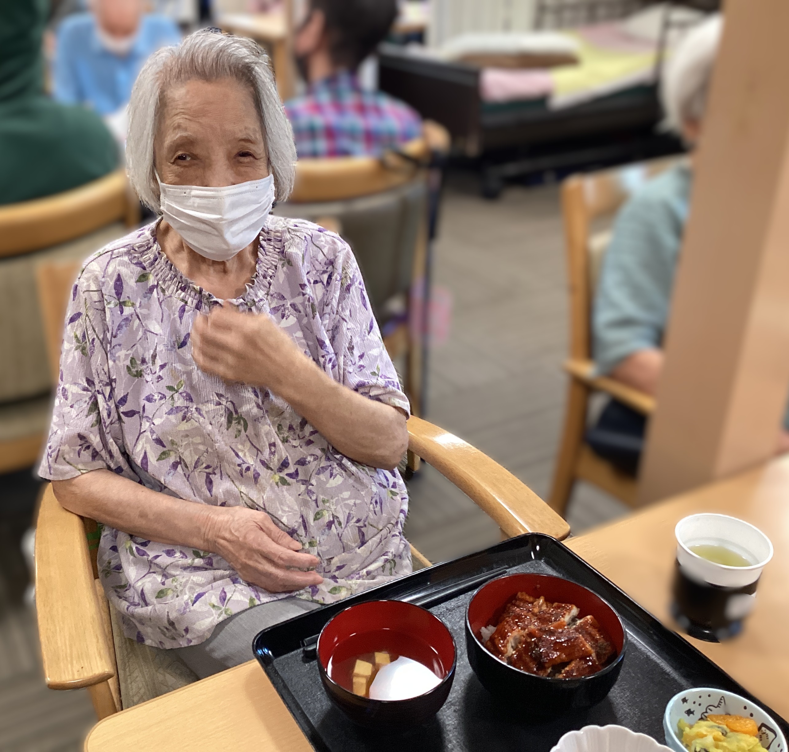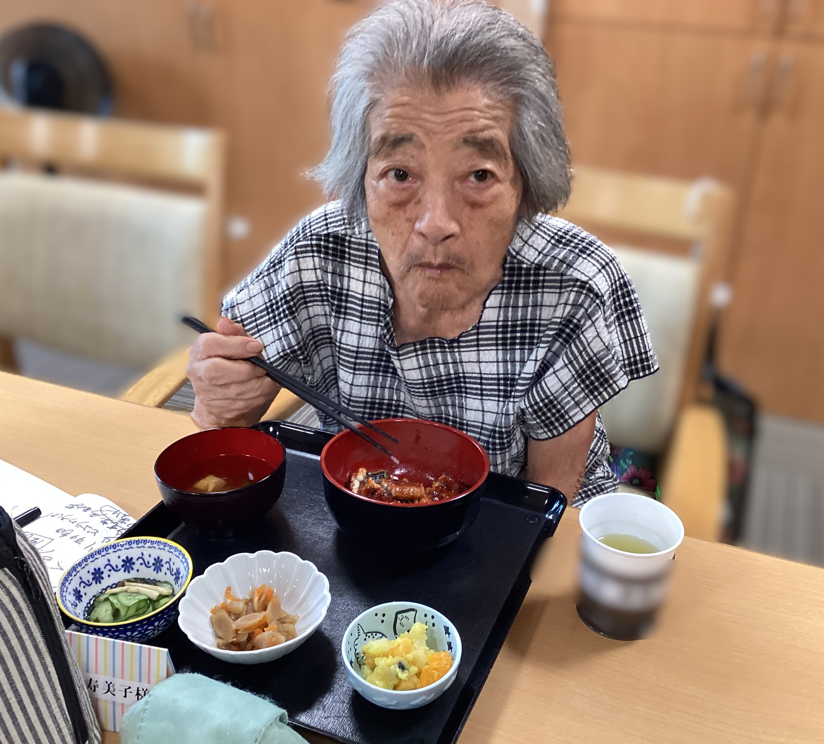 7月19日の土用の丑の日、利用者様に内緒でちょっと贅沢な鰻丼が昼食に出ました。予定外のメニューに、利用者様も喜んで召し上がって頂きました。
