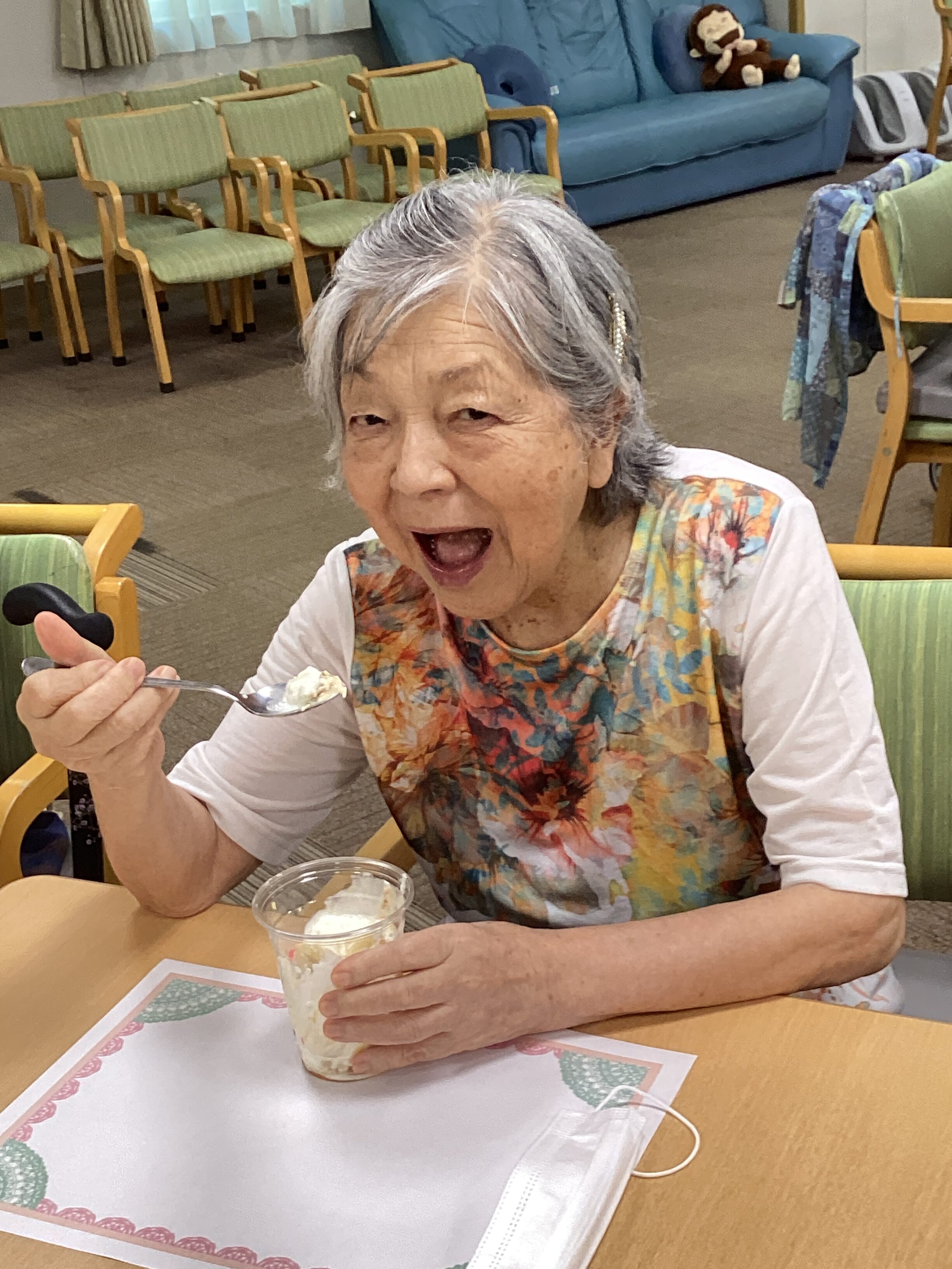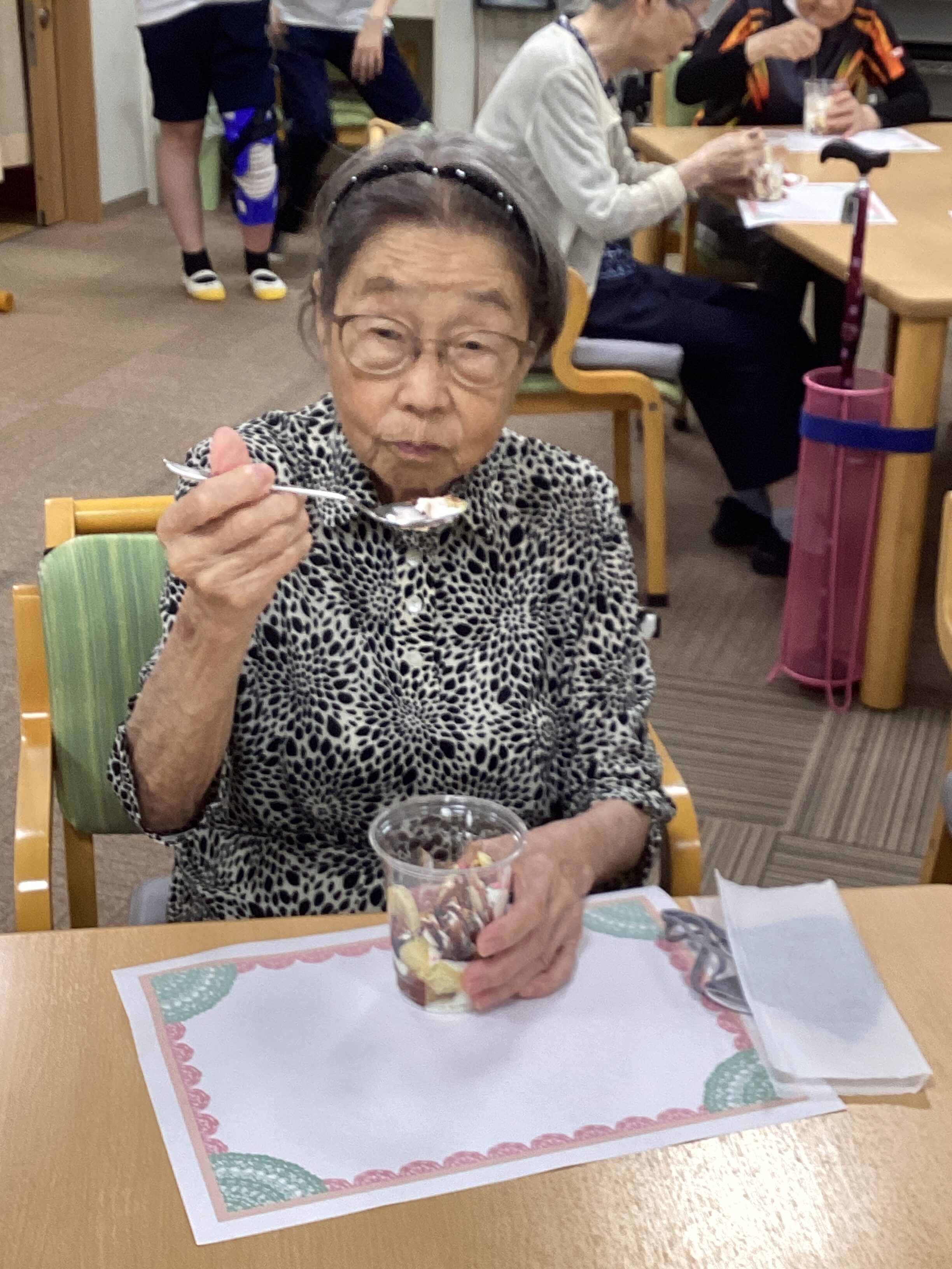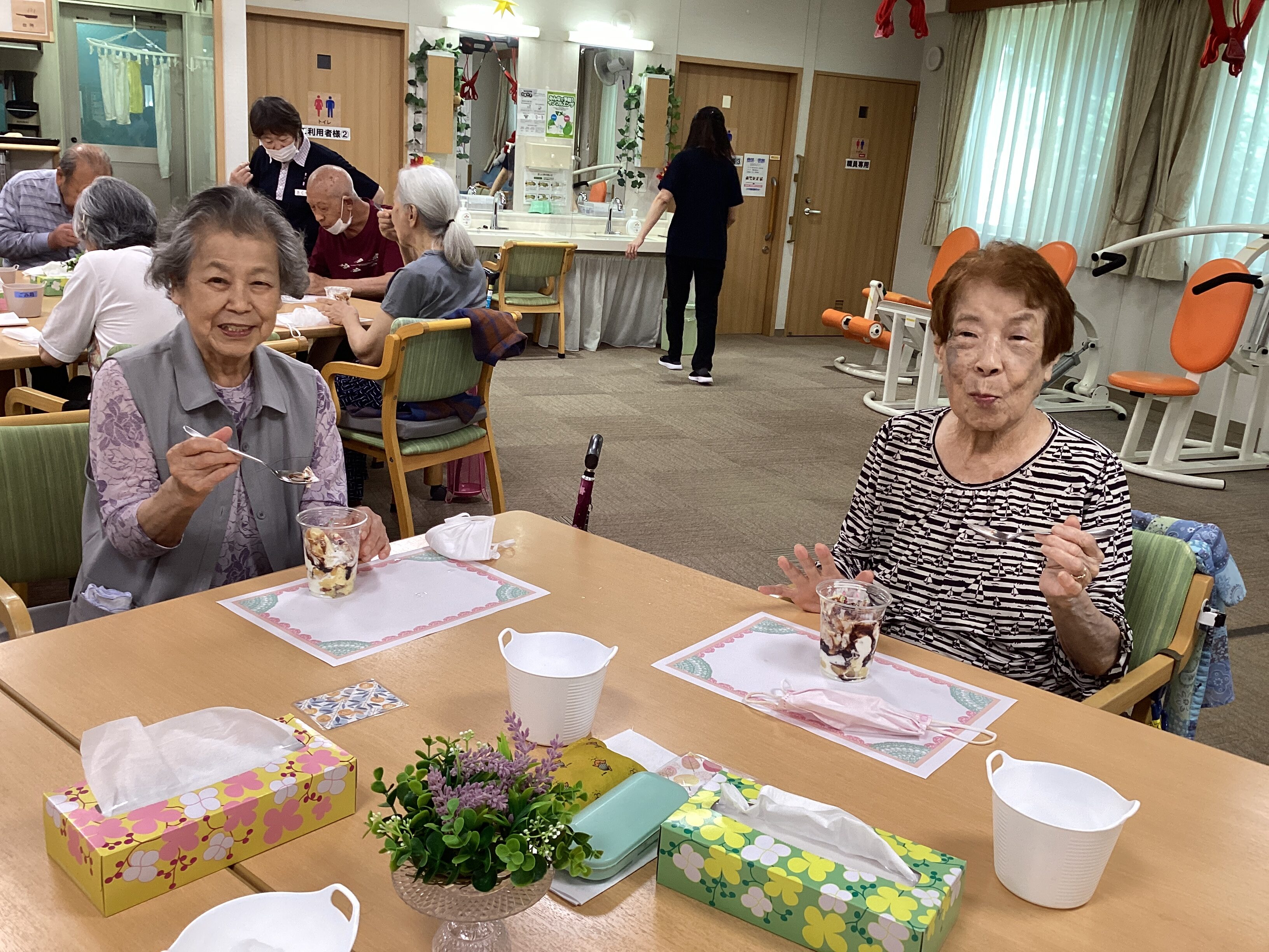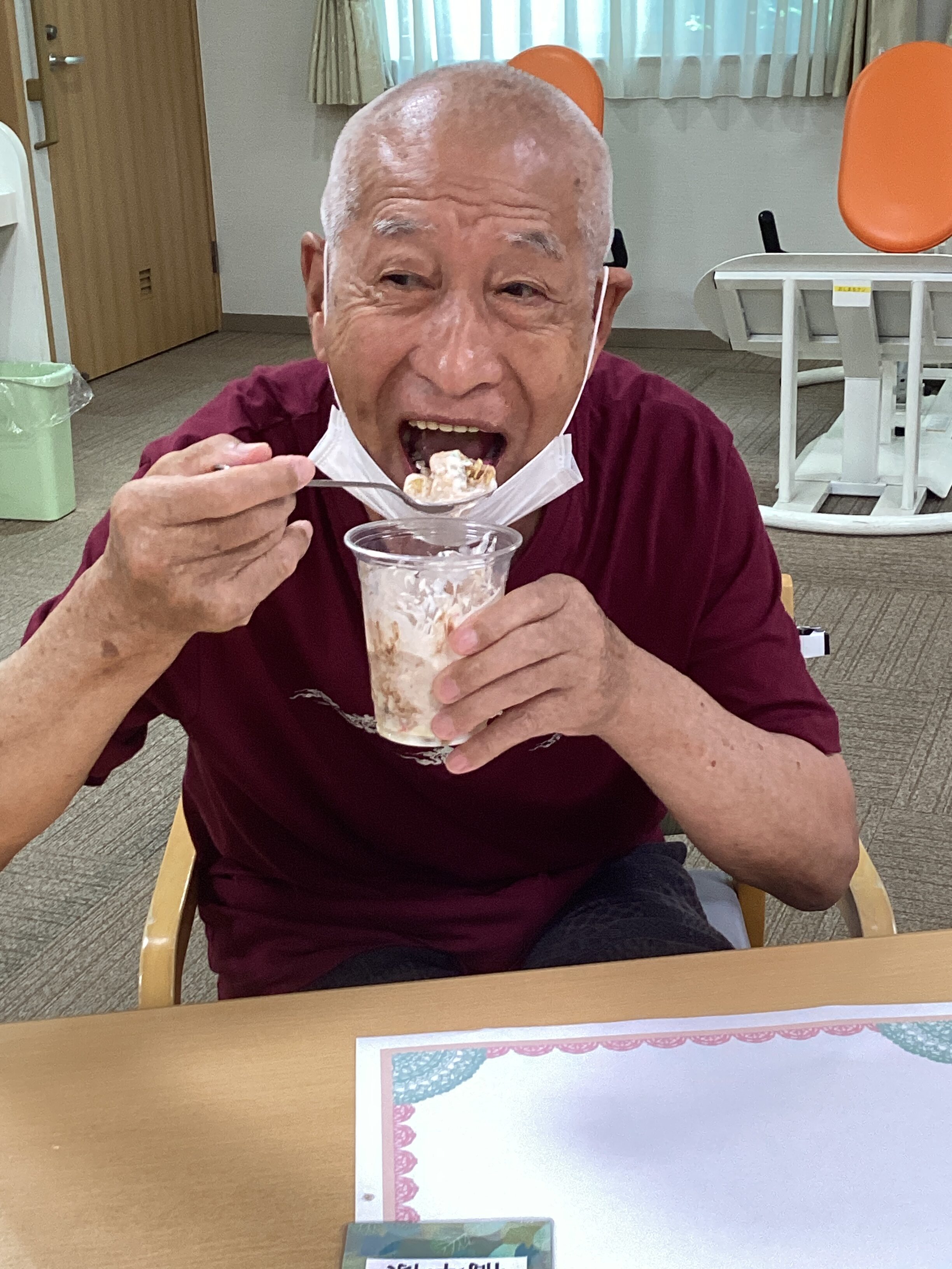 おやつレクはパフェでした✨スポンジ・ヨーグルト・生クリームにアイスとバナナをのせて、最後にチョコレートソースをかけたら完成です! 皆さん大満足のご様子でした(#^.^#)