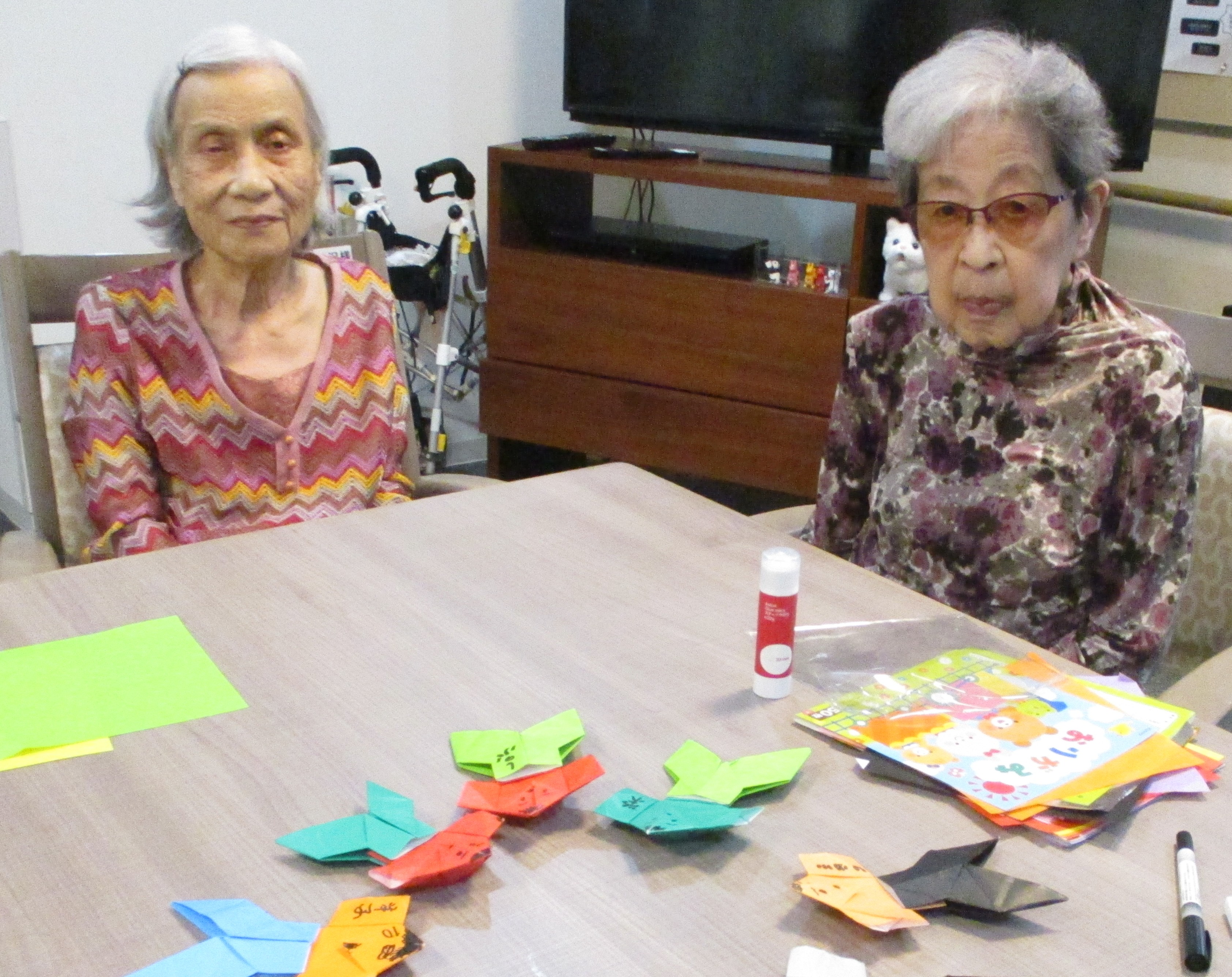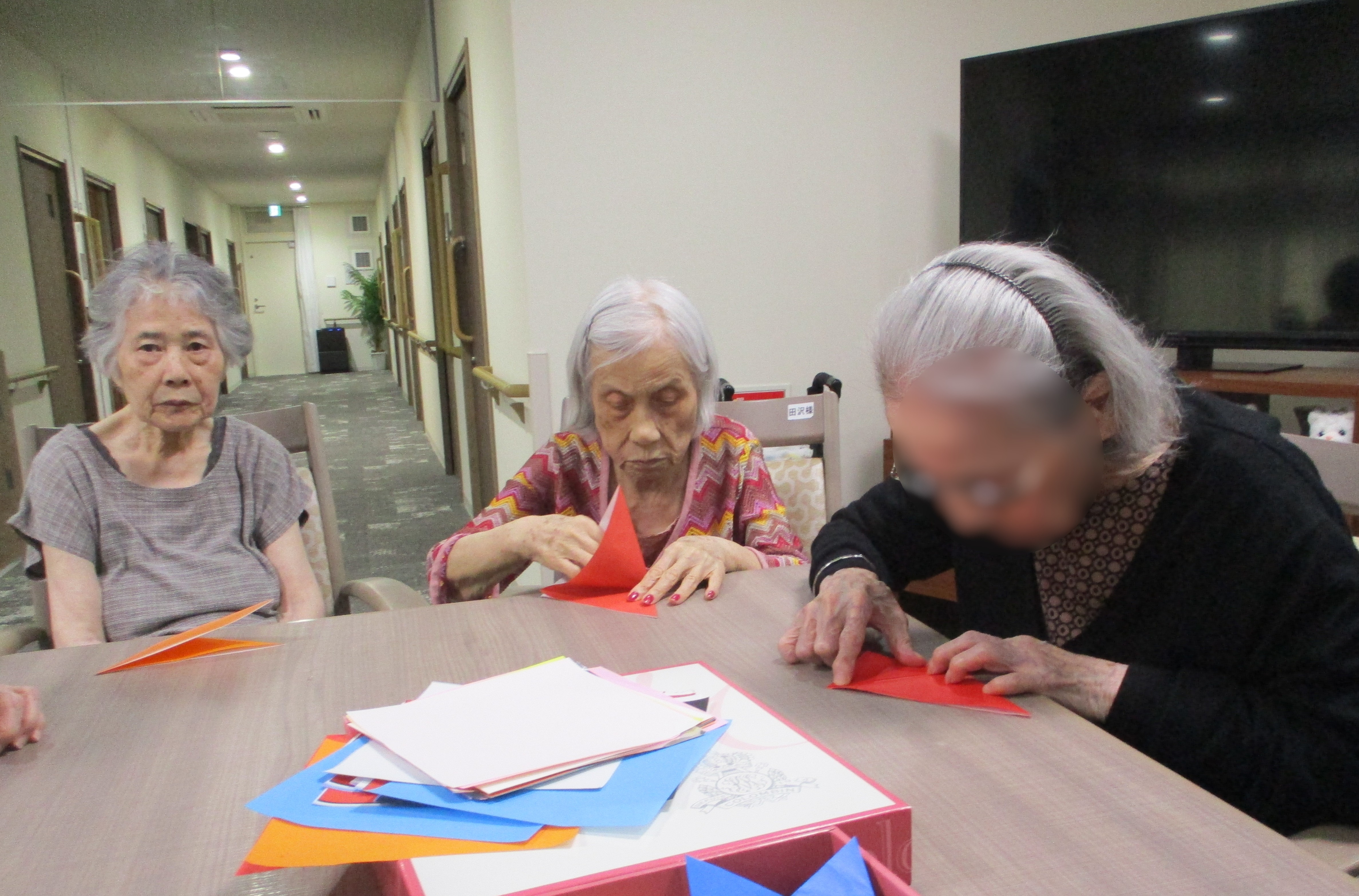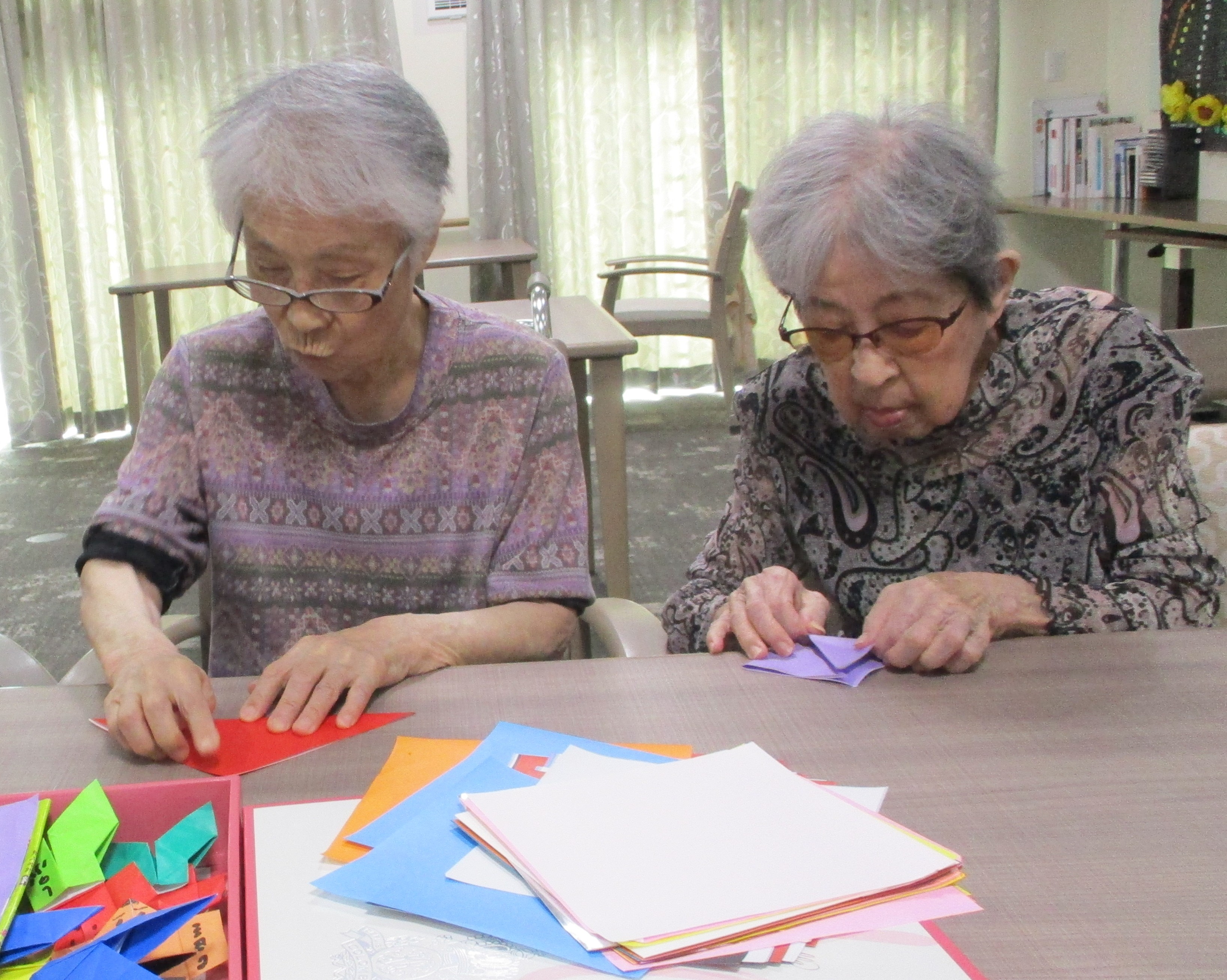 折り紙を使ったレクリエーション活動 皆様、真剣に取り組んでくださいます。