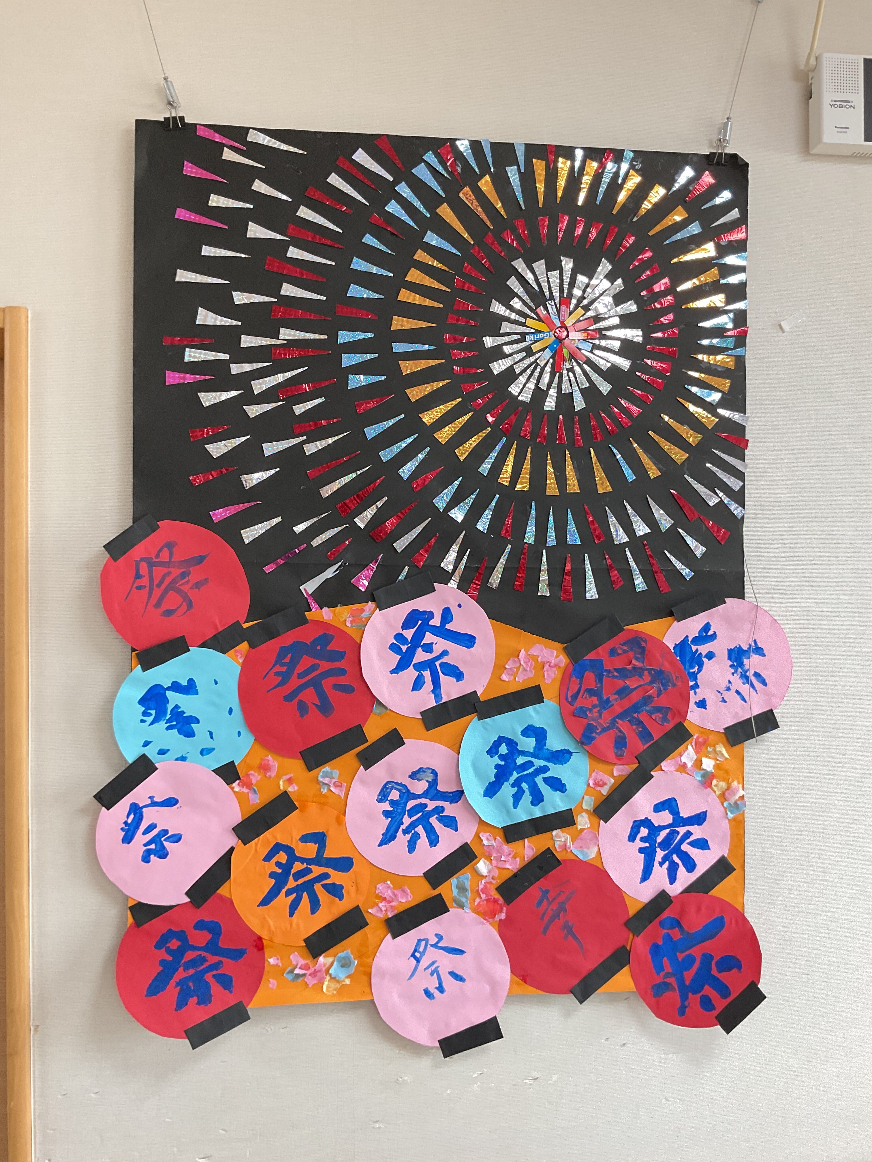 前回作った提灯を大きな花火が打ちあがった夜空に飾りました。花火と提灯を見ていると音頭の音楽と一緒に「ワッショイワッショイ」という掛け声が聞こえてきそうです。