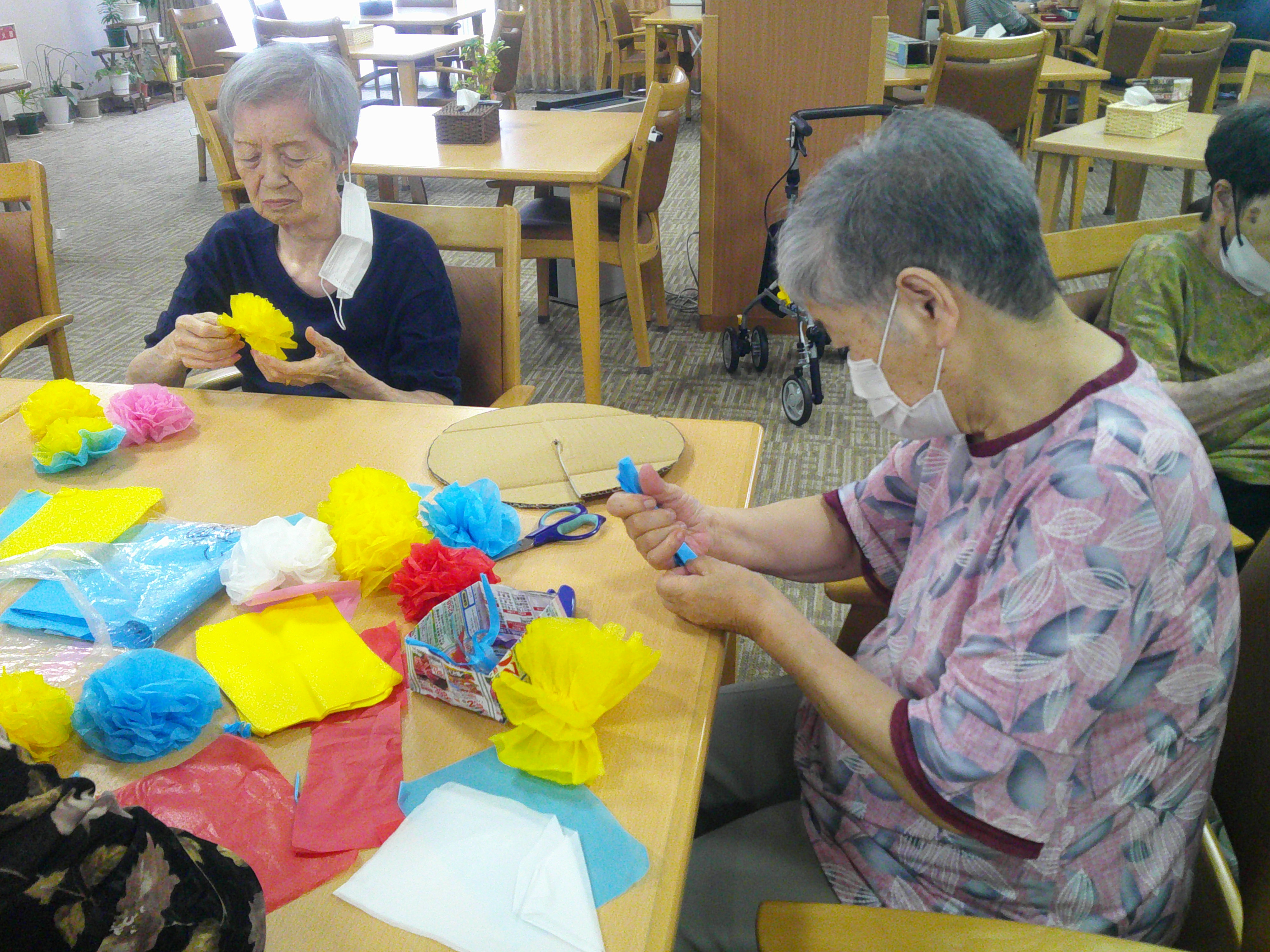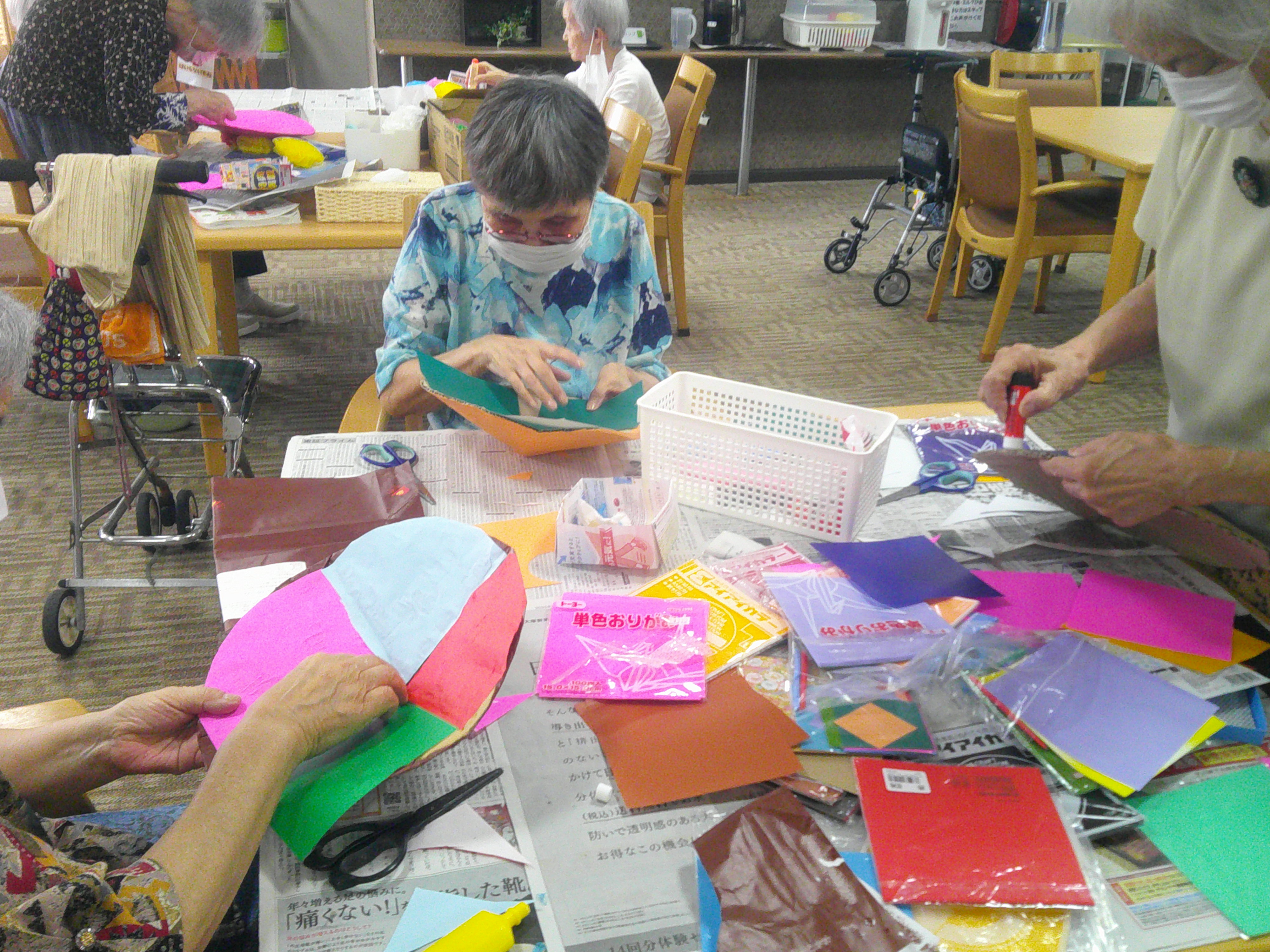 今月のお盆の時期に行う、盆踊り大会で踊る「花笠音頭」の✿花笠✿を皆様に作って頂きました。