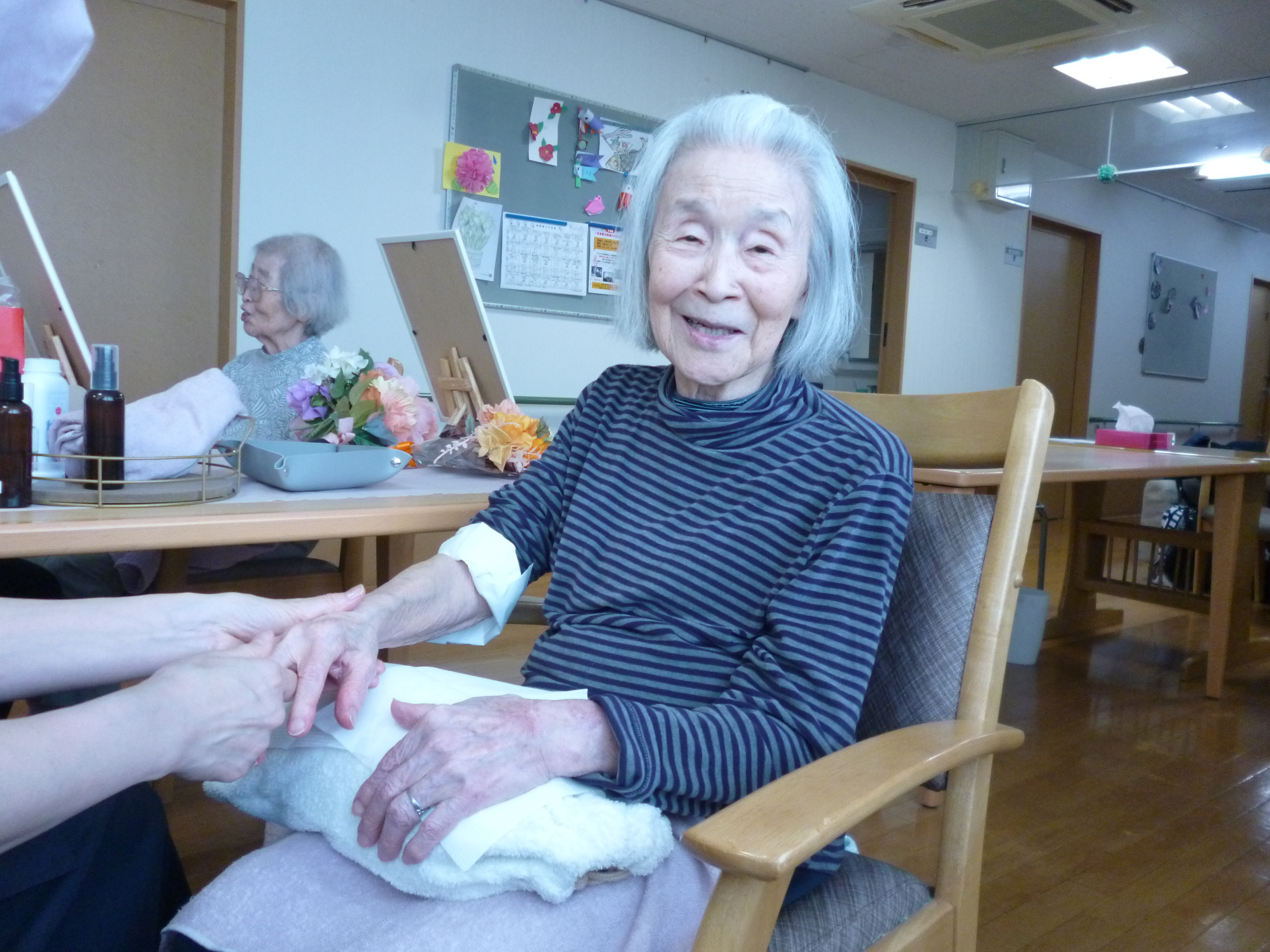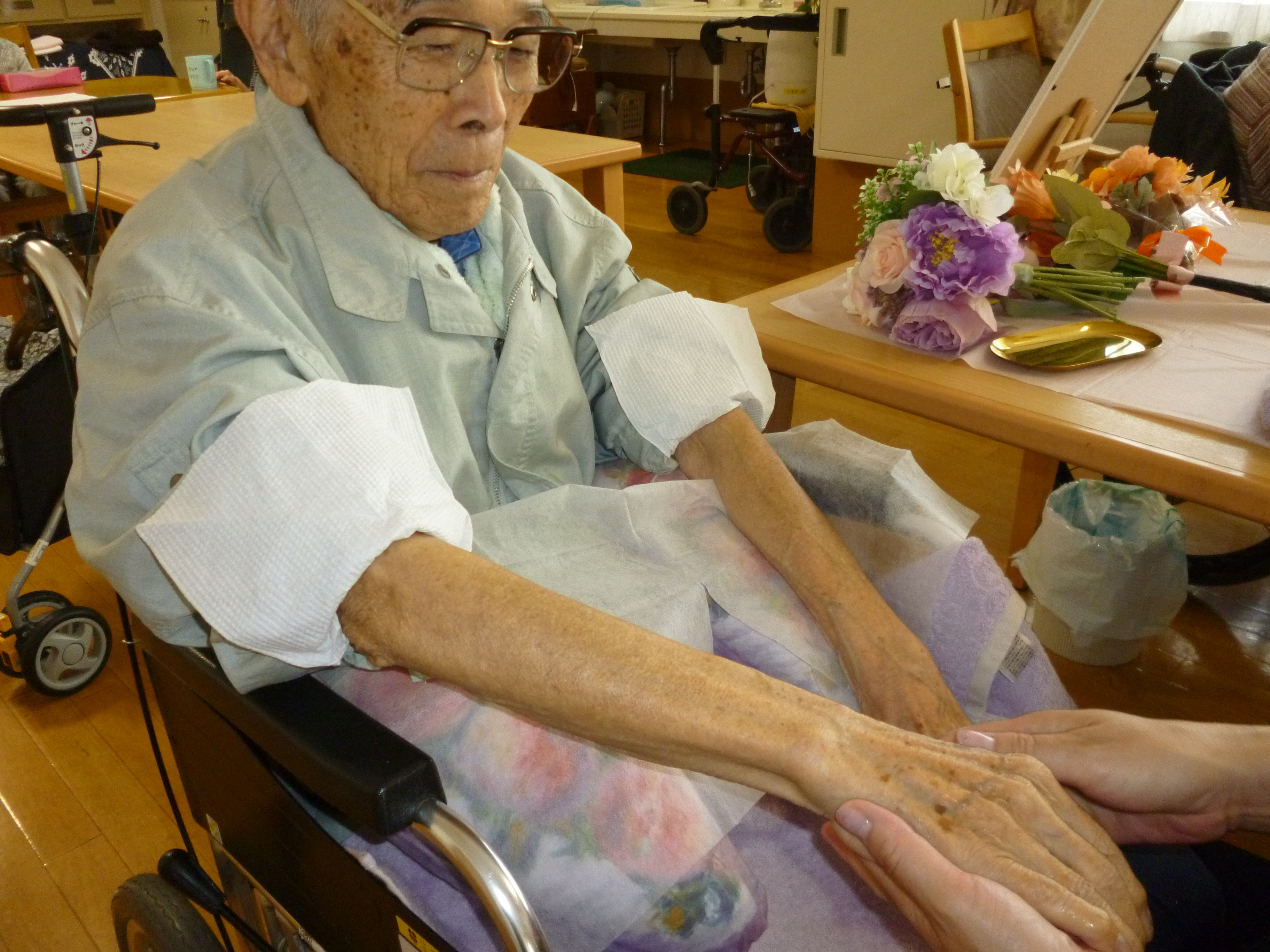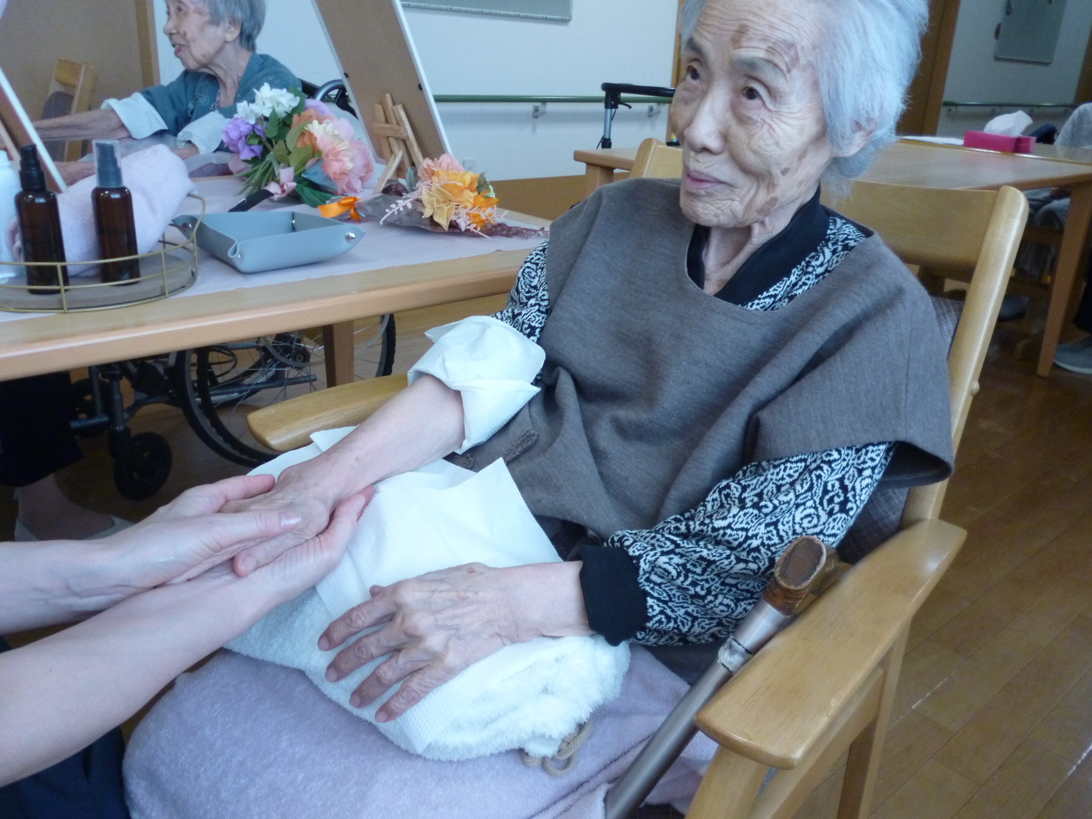 介護・看護資格保有のケアビューティストによる「第一回美容レクリエーション」を行いました! 今回はハンド(手・腕)トリートメント✋✨ 皆様、アロマの良い香りに包まれながら気持ちよさそうにされていました☺