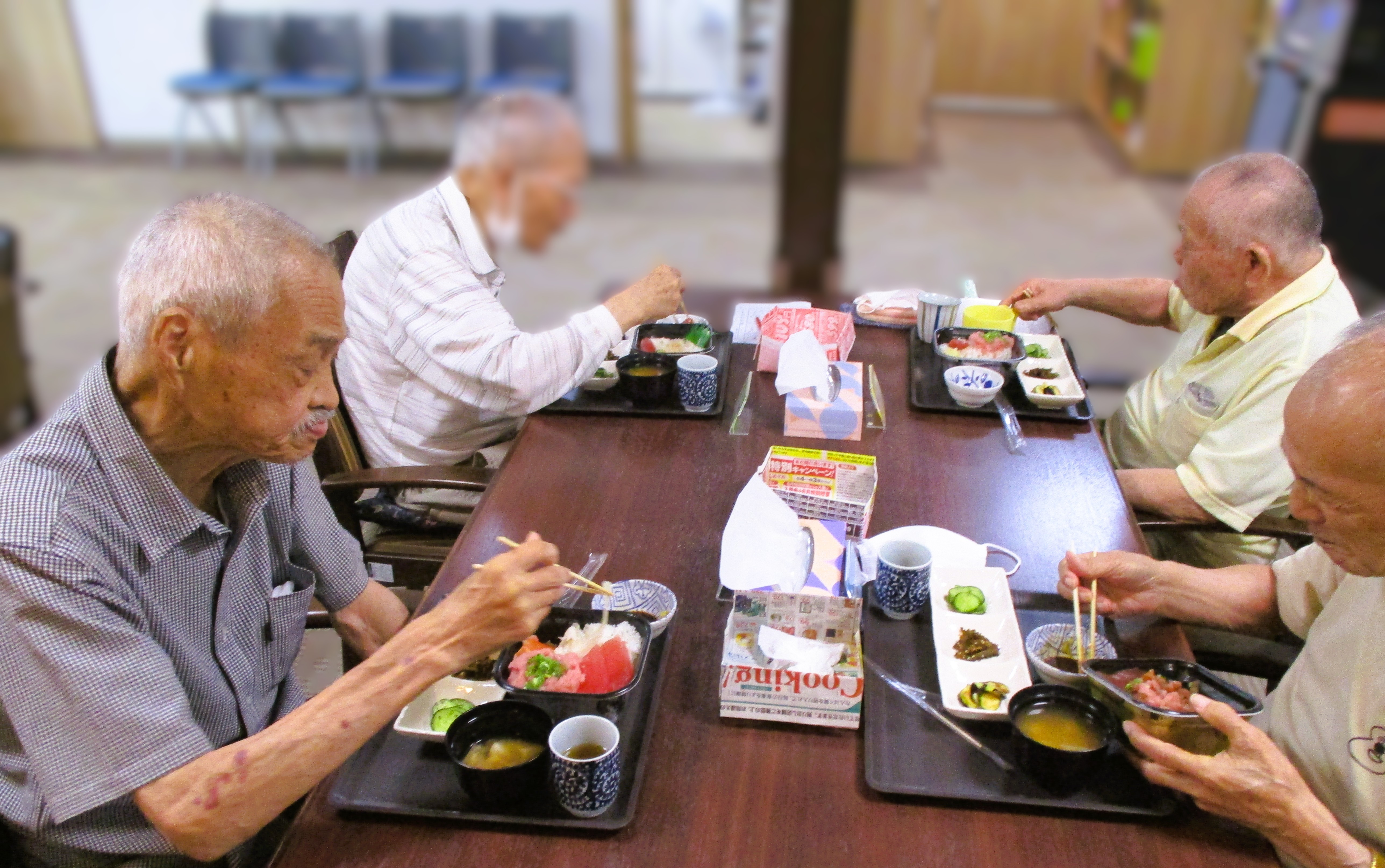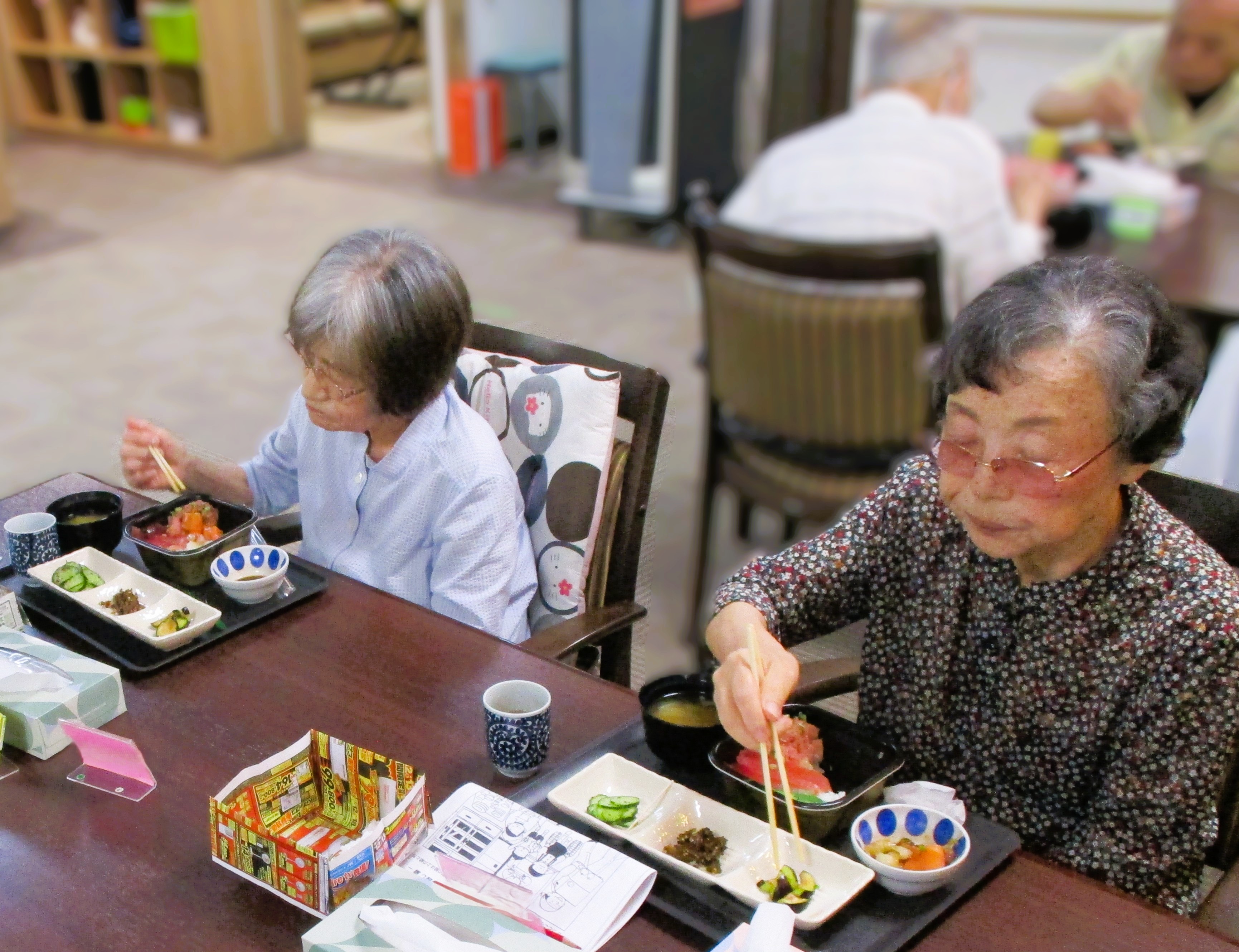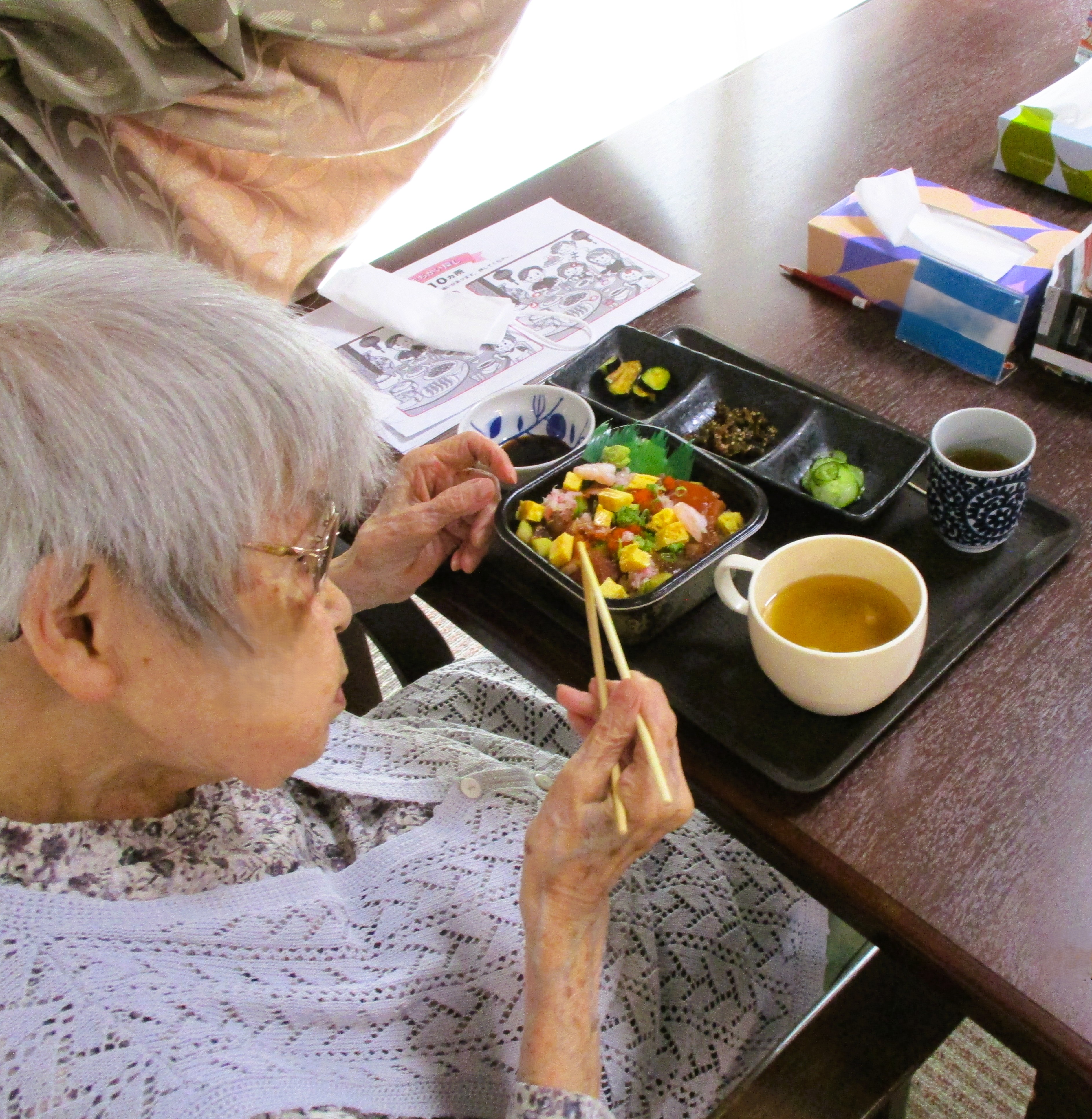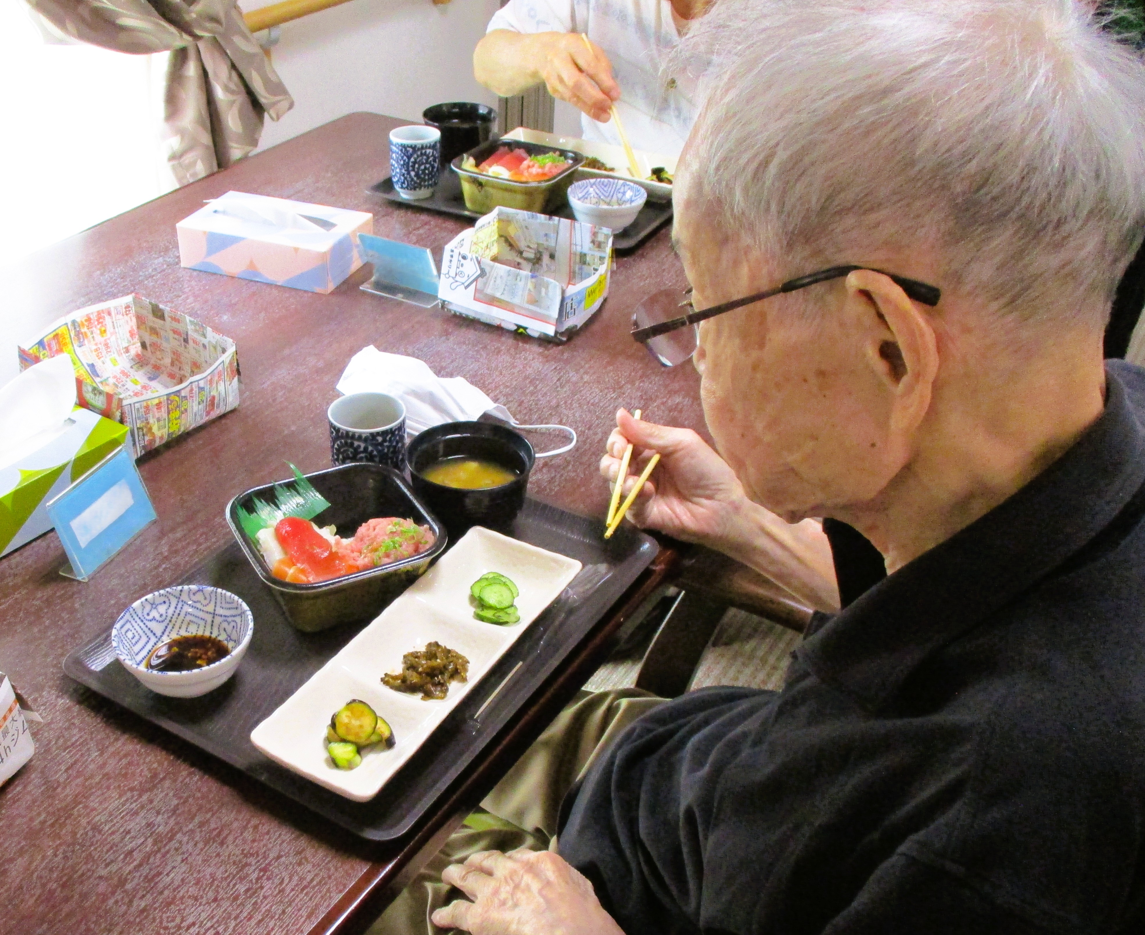 お寿司イベント第二弾! 今回は4種類の丼から、お好きなメニューを選んで頂きました。 スタッフのお宅で採れた茄子の浅漬けやゴーヤの佃煮、胡瓜のゆかり和えと 野菜たっぷりの味噌汁は 手作りです! 皆様に とても喜んで頂きました (*'▽')