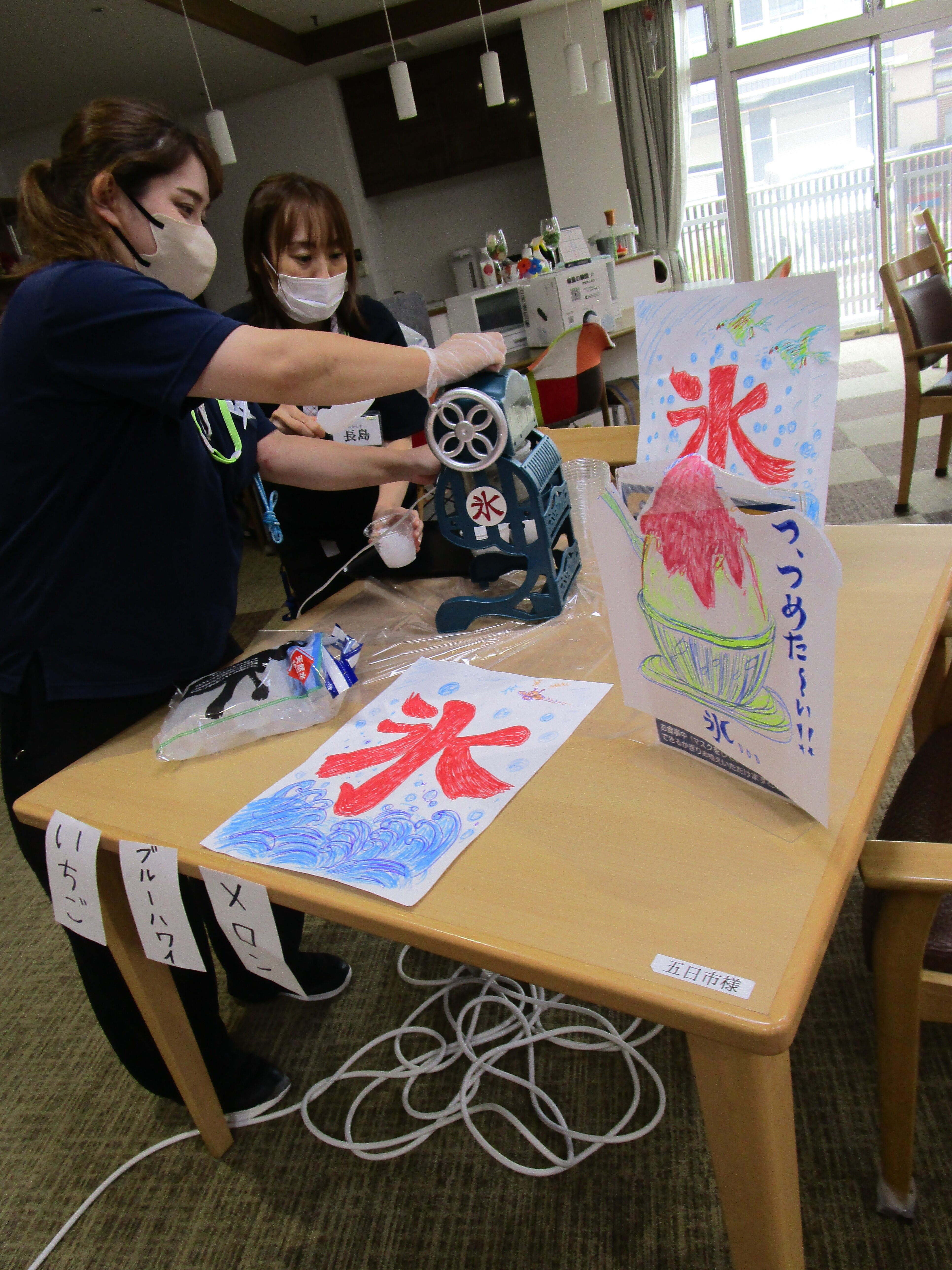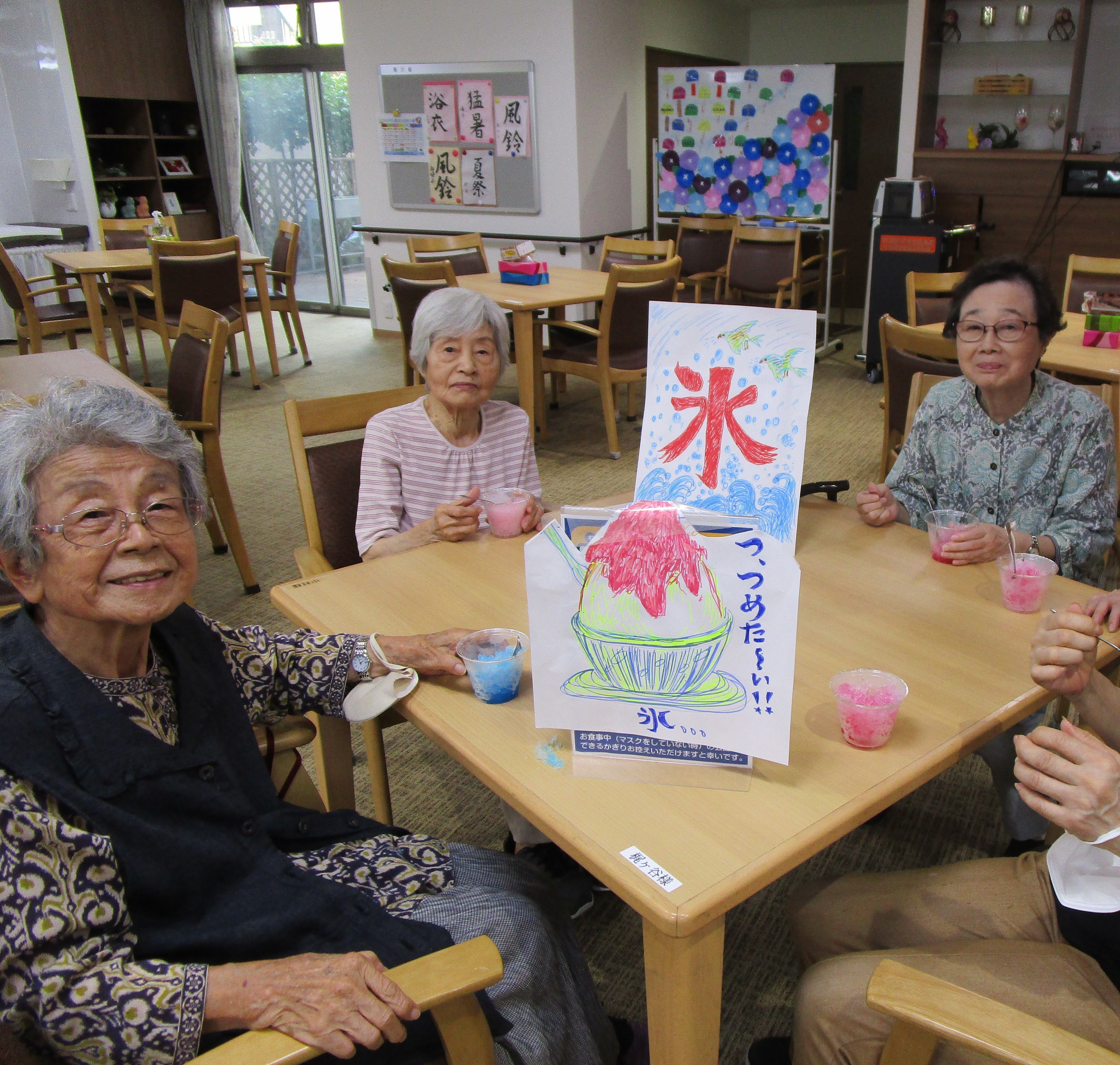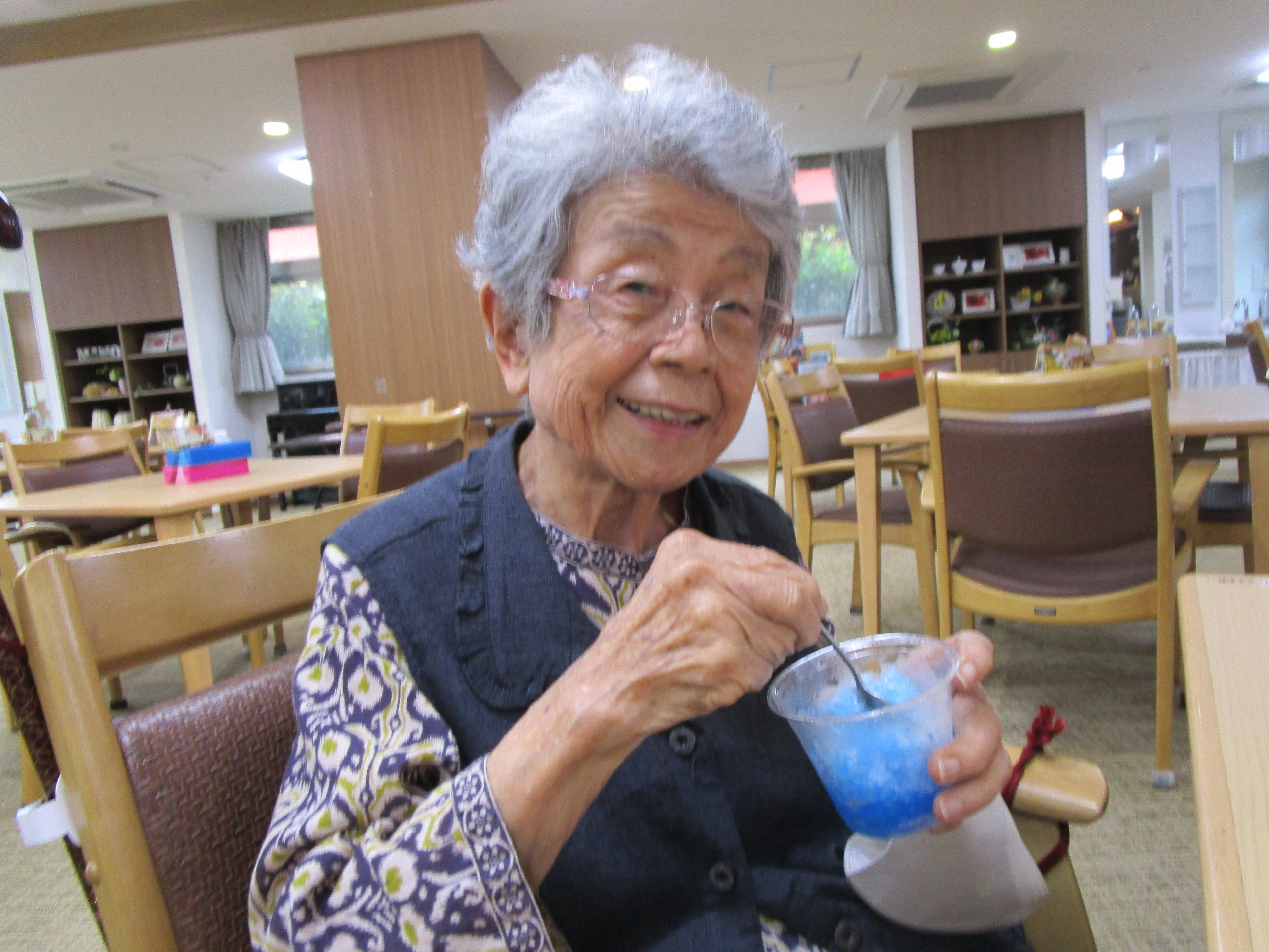 ミモザ久里浜はまゆう苑では、レクの時間に、かき氷を作って食べました(^^♪ 20人の入居者が参加され、昔を懐かしがりながら、楽しい時間を過ごされました(^^♪