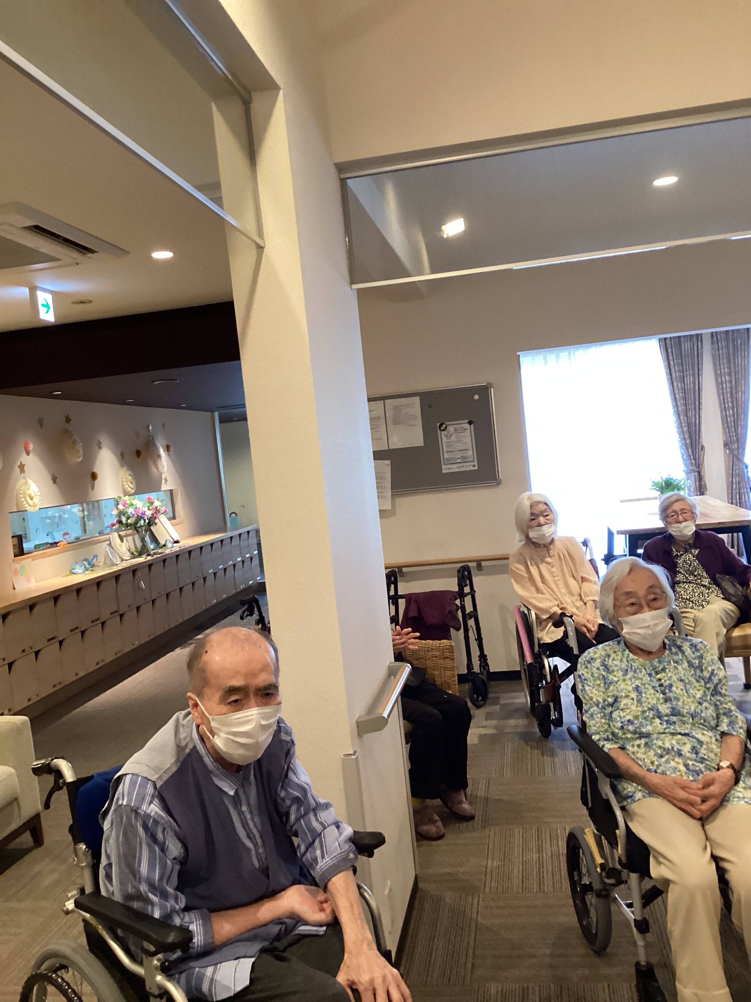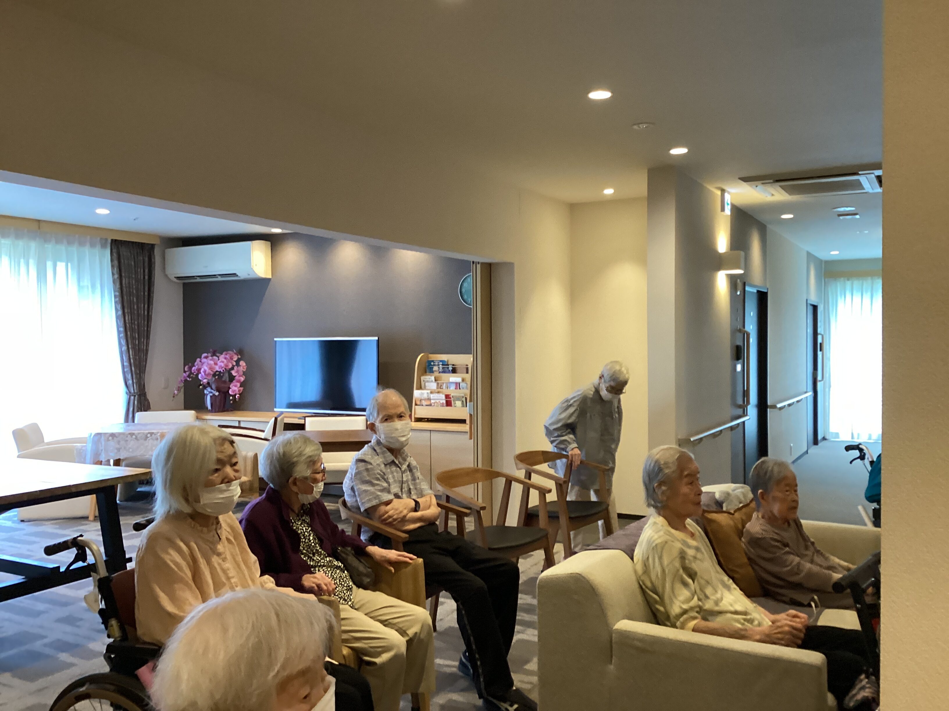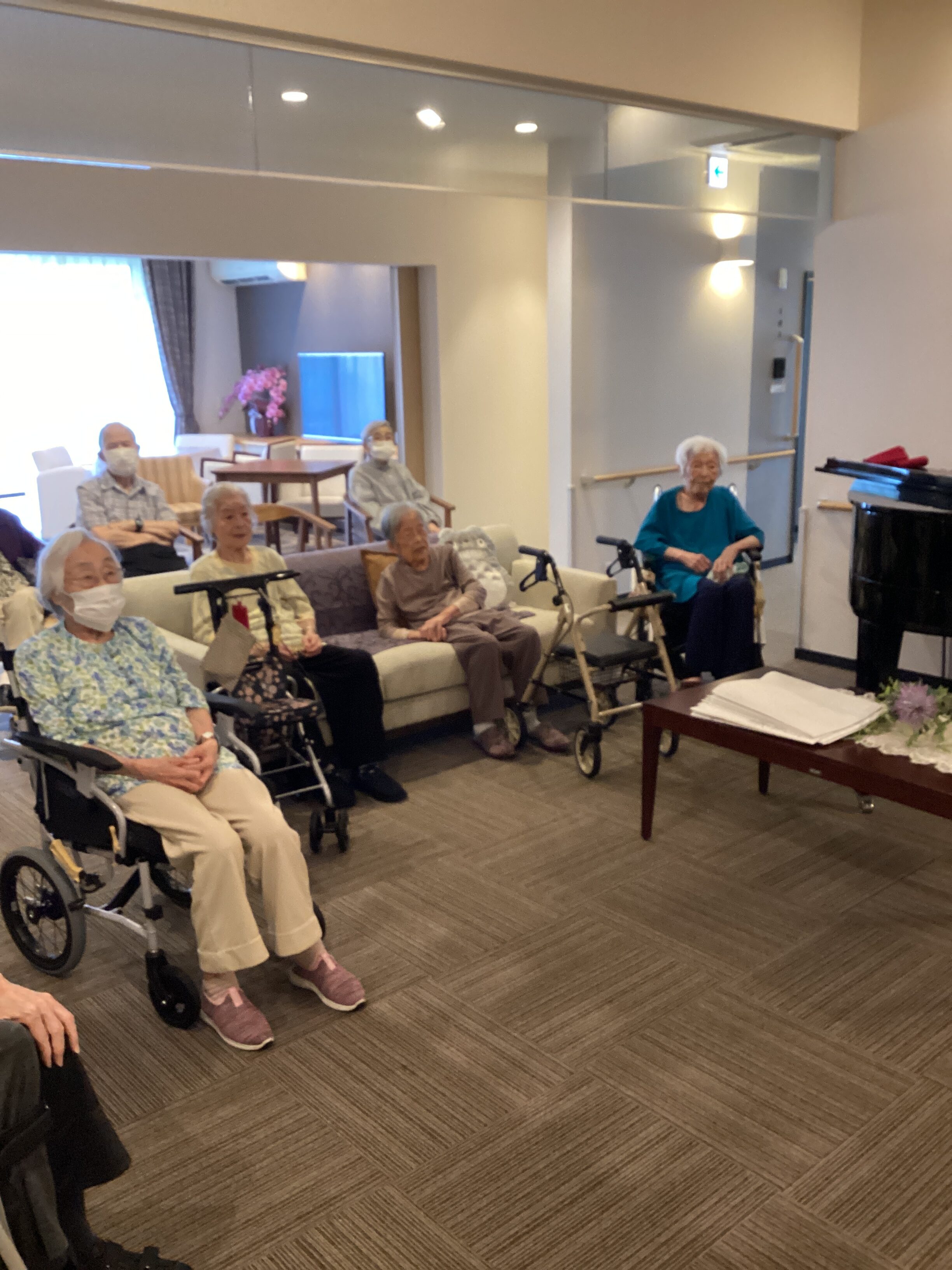 利用者のみんなで故郷や八十八夜、海、夏は来ぬ等懐かしい曲を楽しく歌う時間があり、毎月の楽しいイベントのひとつとなっております。 皆さん大きな声で歌っておられ、笑顔あふれる会となりました。