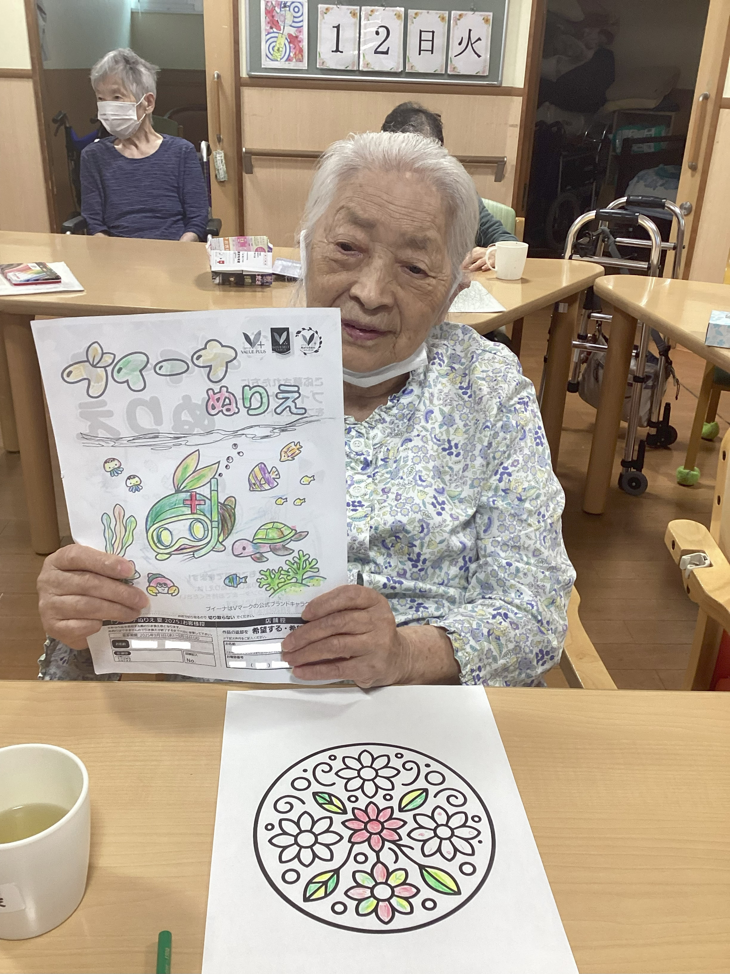 近くのスーパーマーケットで『塗り絵』を描いてプレゼントがもらえるキャンペーンにご利用者の方たちが参加されました。丁寧に描いた塗り絵がお店に掲示されました。かわいいシールのプレゼントも頂き、皆さん喜んでいらっしゃいました。